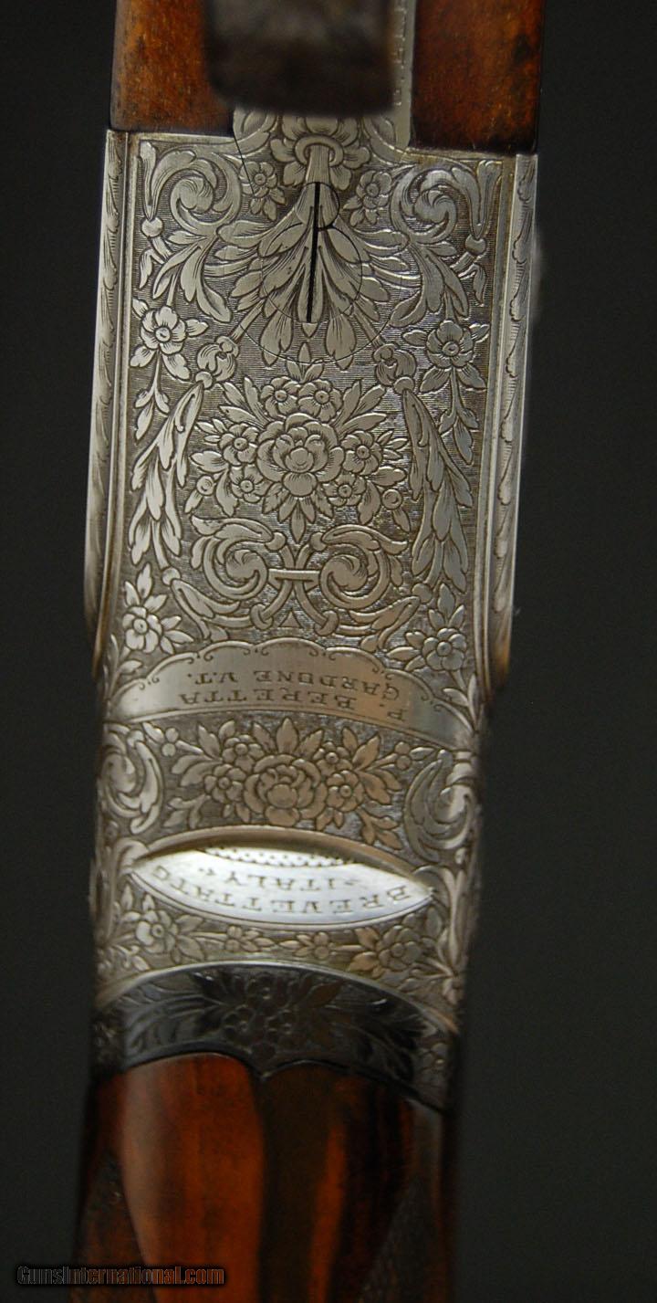 Description: P. Beretta- SO5 EELL, 12ga., 28”, fixed chokes- M/F, highly figured pistol grip stock, checkered butt, gold single selective trigger, automatic ejectors, ventilated rib, Kersten crossbolt lockup, hand detachable full sidelock shotgun, 1969 production, magnificent full coverage deep relief acanthus scroll signed by G. Bertasi, a pristine example of a high grade Beretta sidelock shotgun. The gun comes with a Beretta case. Inv. # 21293 14 1/4” x 1 1/2” x 2 1/4” 7 lbs. 3oz. $19,999.00 SOLD |