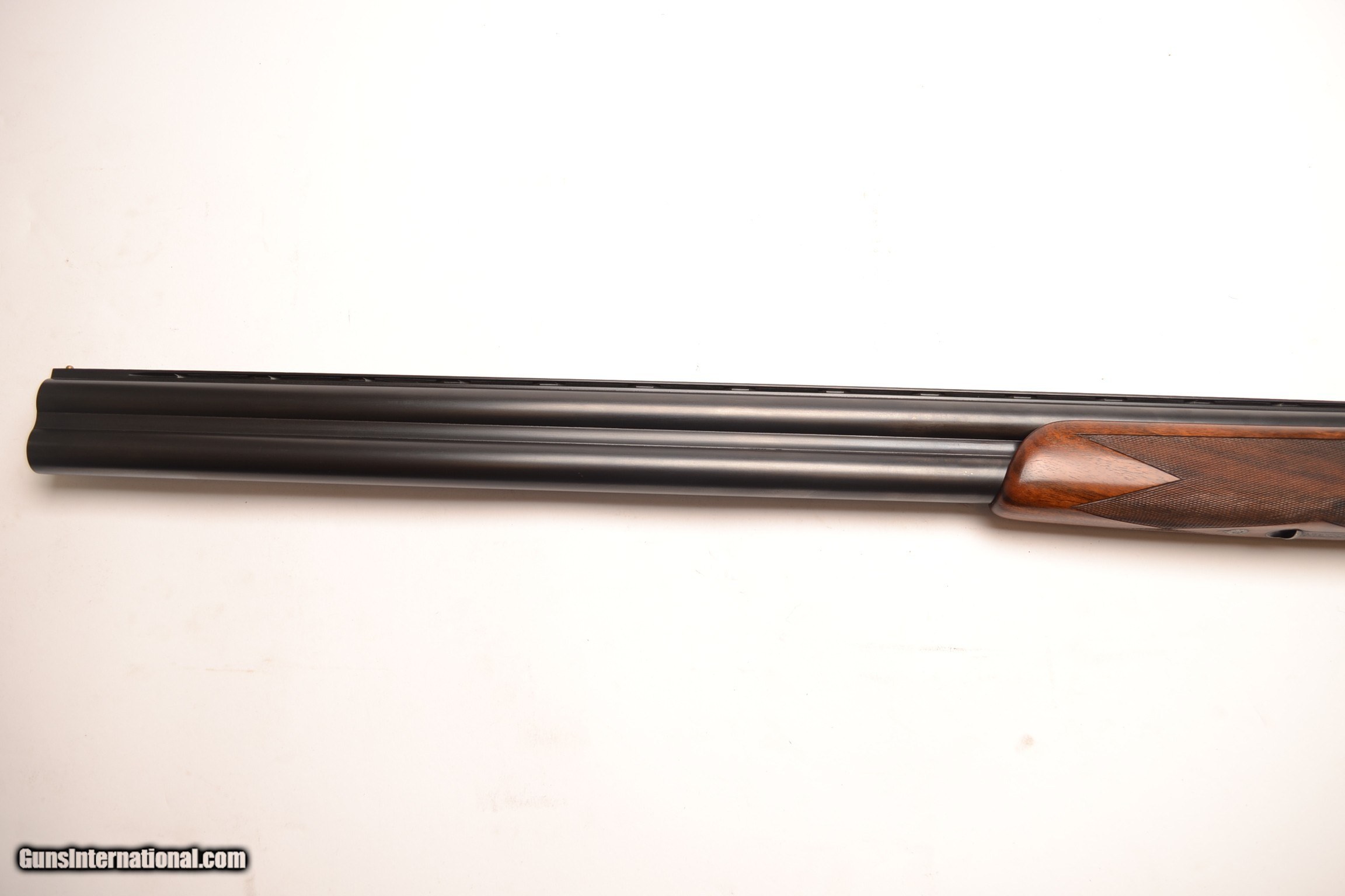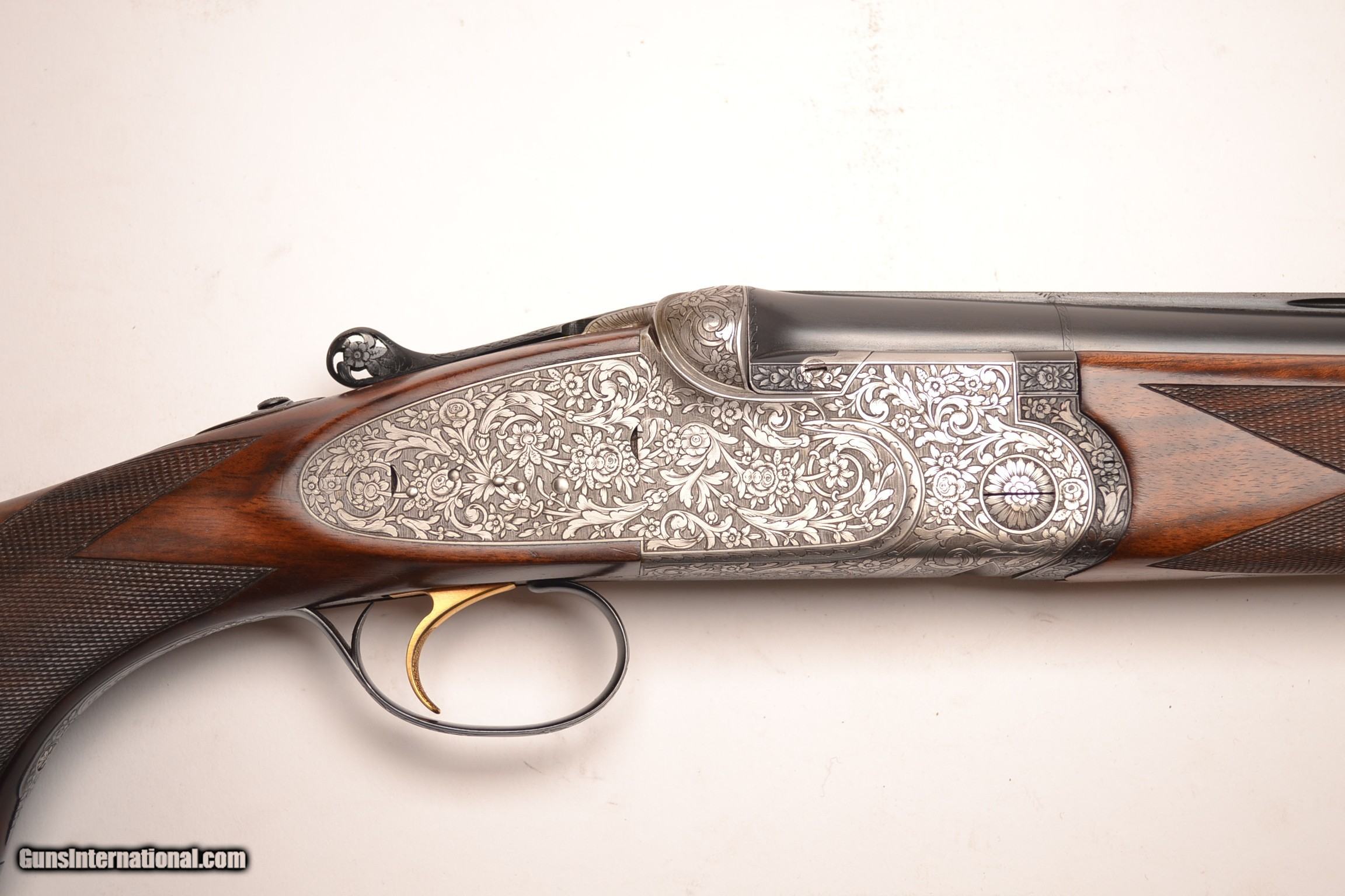Description: P. Beretta - SO5 EELL, 12ga., two barrel set, 26” barrels choked IC/M, 28” barrels choked M/F, beautiful European walnut capped pistol grip stock, checkered butt, gold single selective trigger, automatic ejectors, ventilated ribs, slender hunting forend, full sidelock gun with hidden fastener hand detachable locks, magnificent full coverage relief ornamental floral engraving over a coined finish, signed by R. Goliui, the gun remains in excellent overall condition with very minor handling marks, a wonderful example, ideal configuration, cased in leather trunk case, available for immediate delivery.