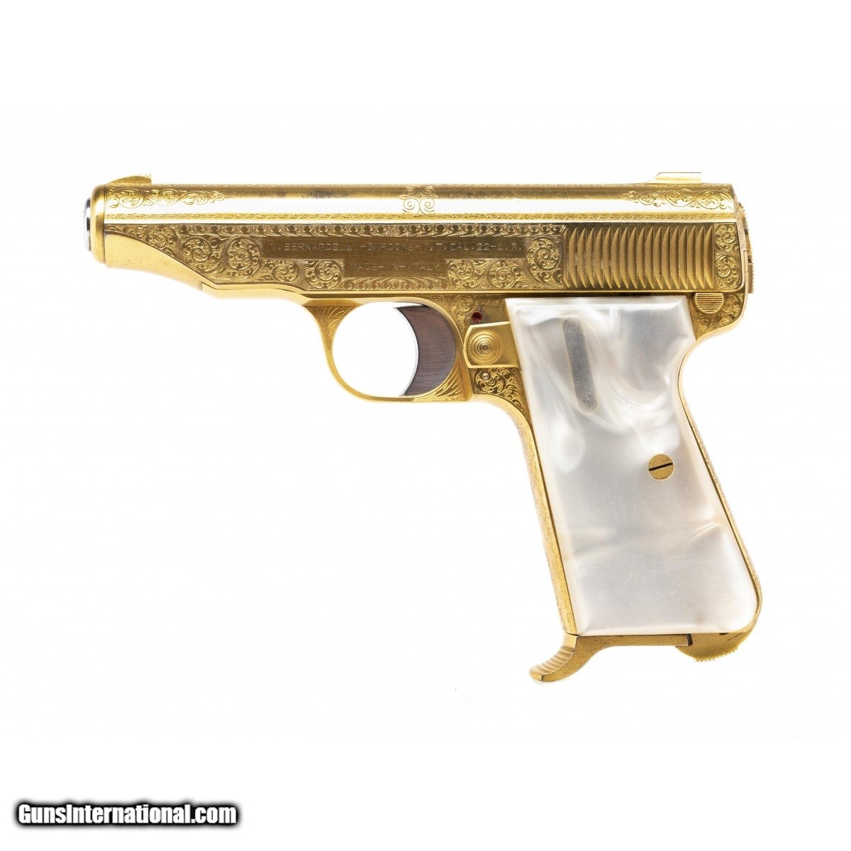 Beautiful factory engraved and gold plated Bernardelli .22 cal pocket auto. The gun has very fine scroll engraving with gold plating and faux pearl grips. The pistol is dated 1957. Excellent condition with the original box, the box shows wear and tape. A neat and unusual Italian pistol.
