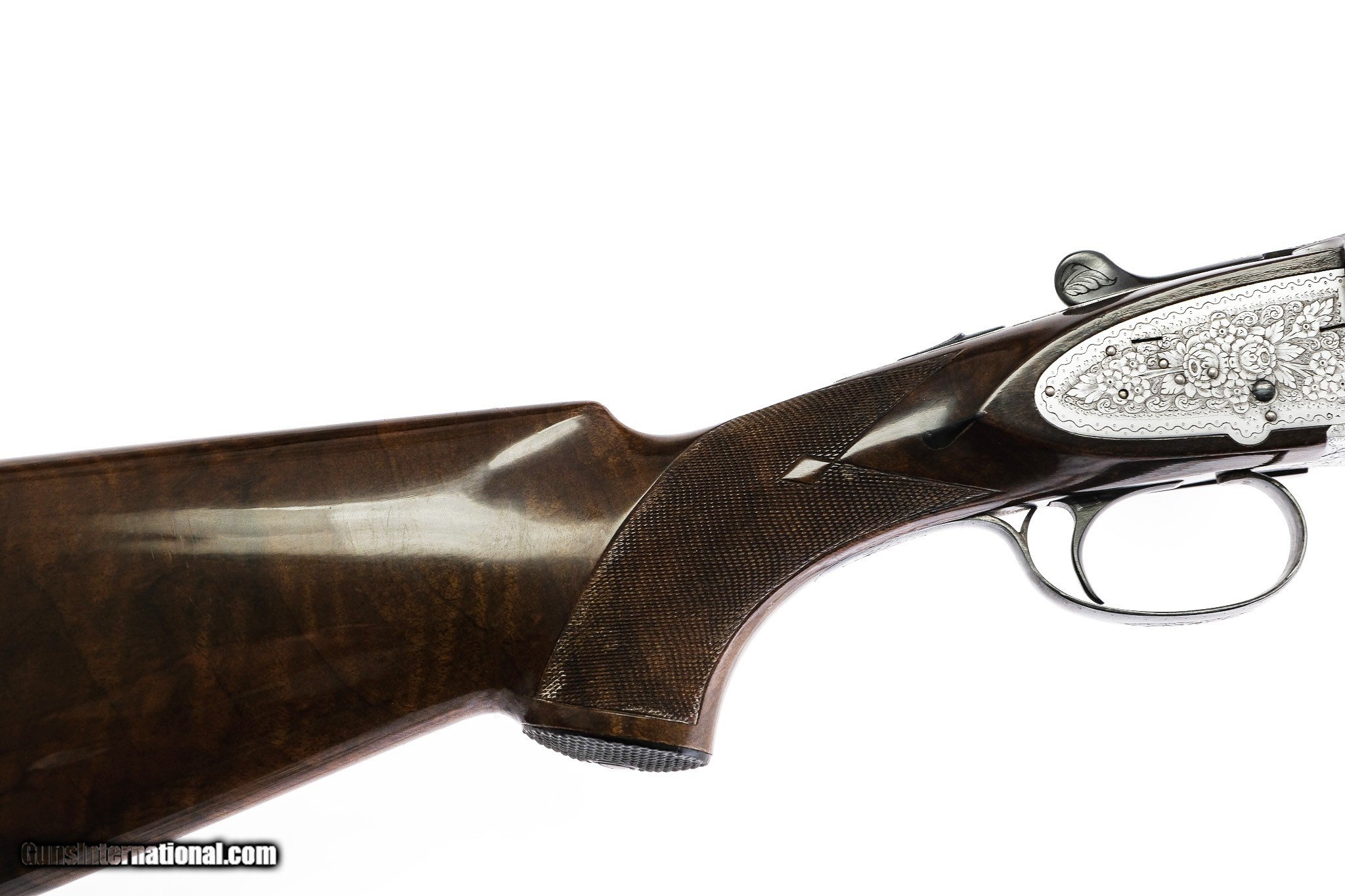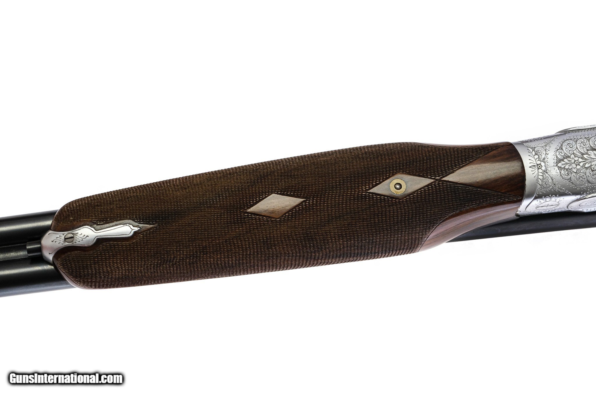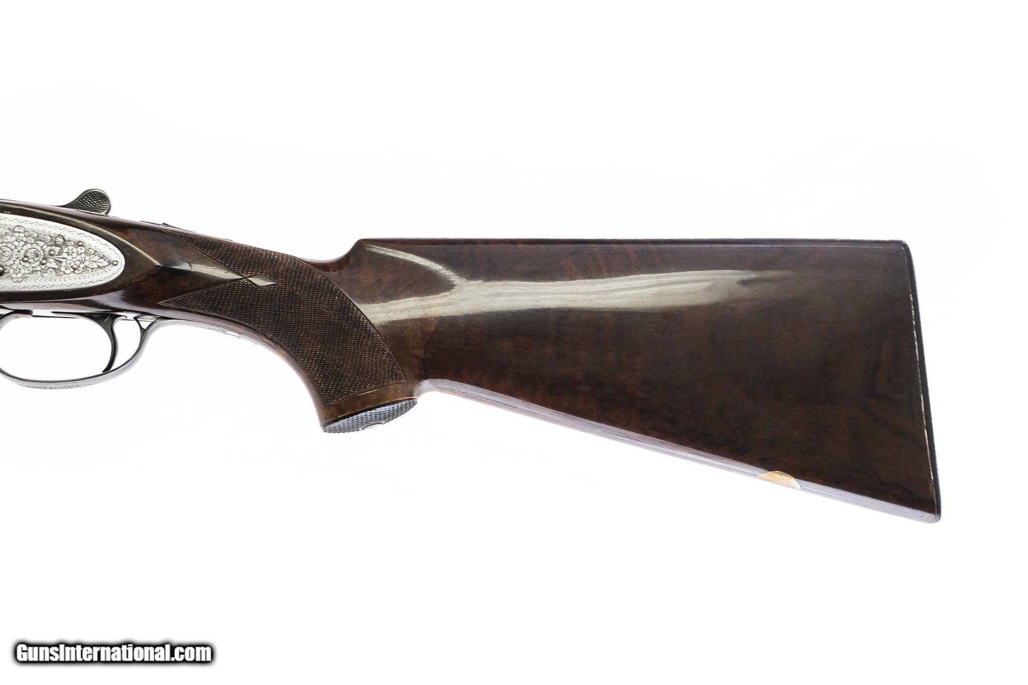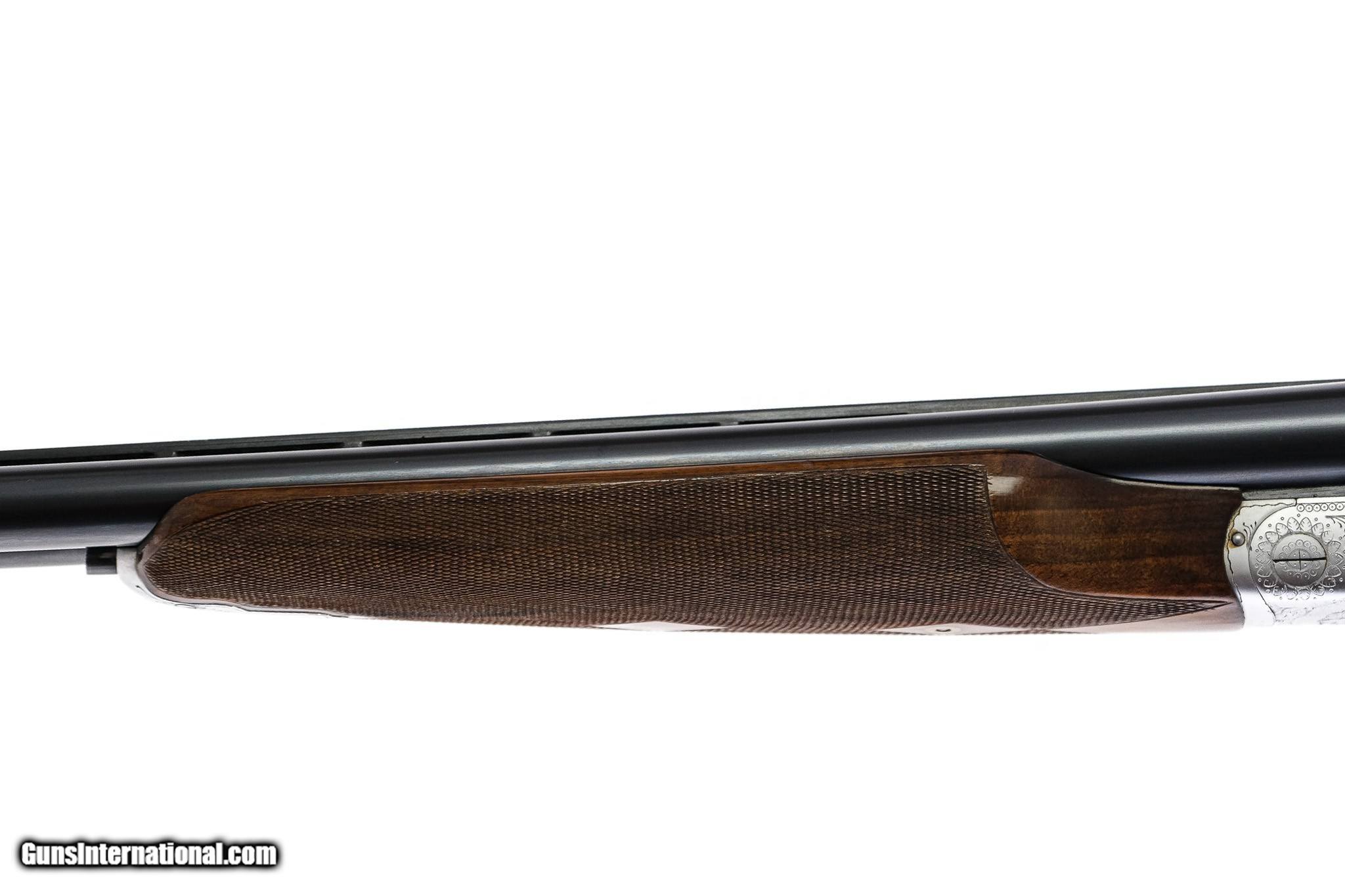Description: Bernadelli L. Satina - SxS, 20ga. 25 ¾" Bohler Barrels Choked M/IM. Made in 1969, 2 ¾" chamber, small raised vent rib, made in Gardone, Italy; small beavertail, beautiful checkered, scroll engraved on a coin finish, engine turned interior, engraving is about 90% by GILLI, single trigger, auto ejector, full pistol grip, buttplate, very lightly used, almost perfect gun! Inv: 76696 6 lbs. 7 oz. 13 ¾" x 1 3/8" x 2 ¼" $3,995.00 SOLD |