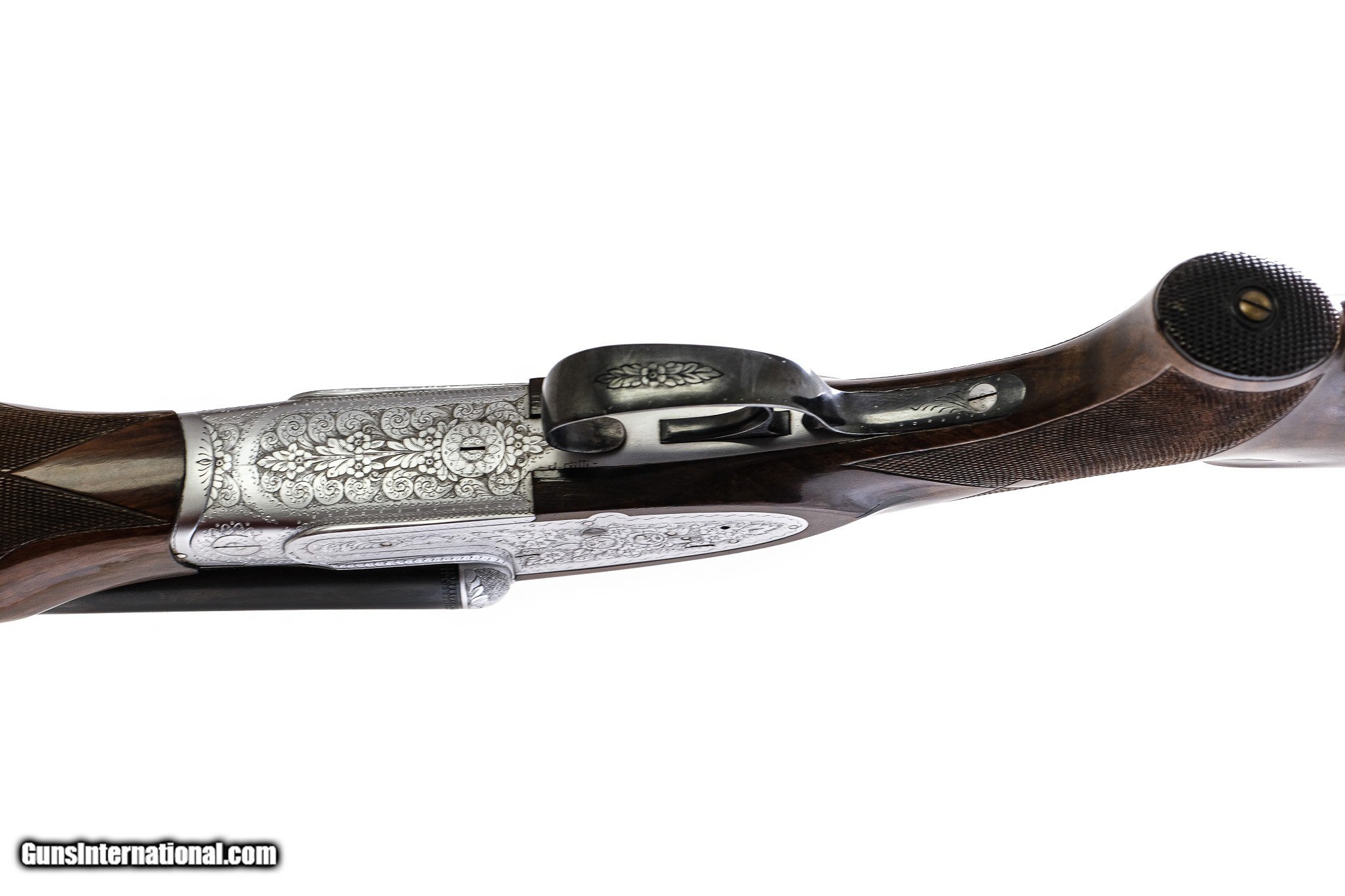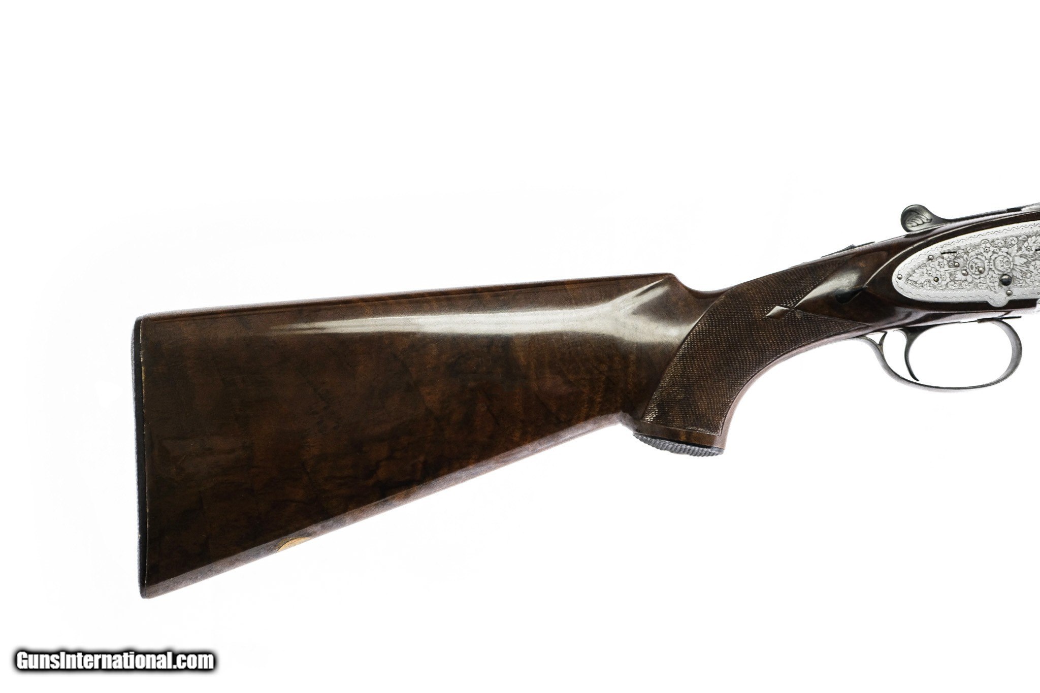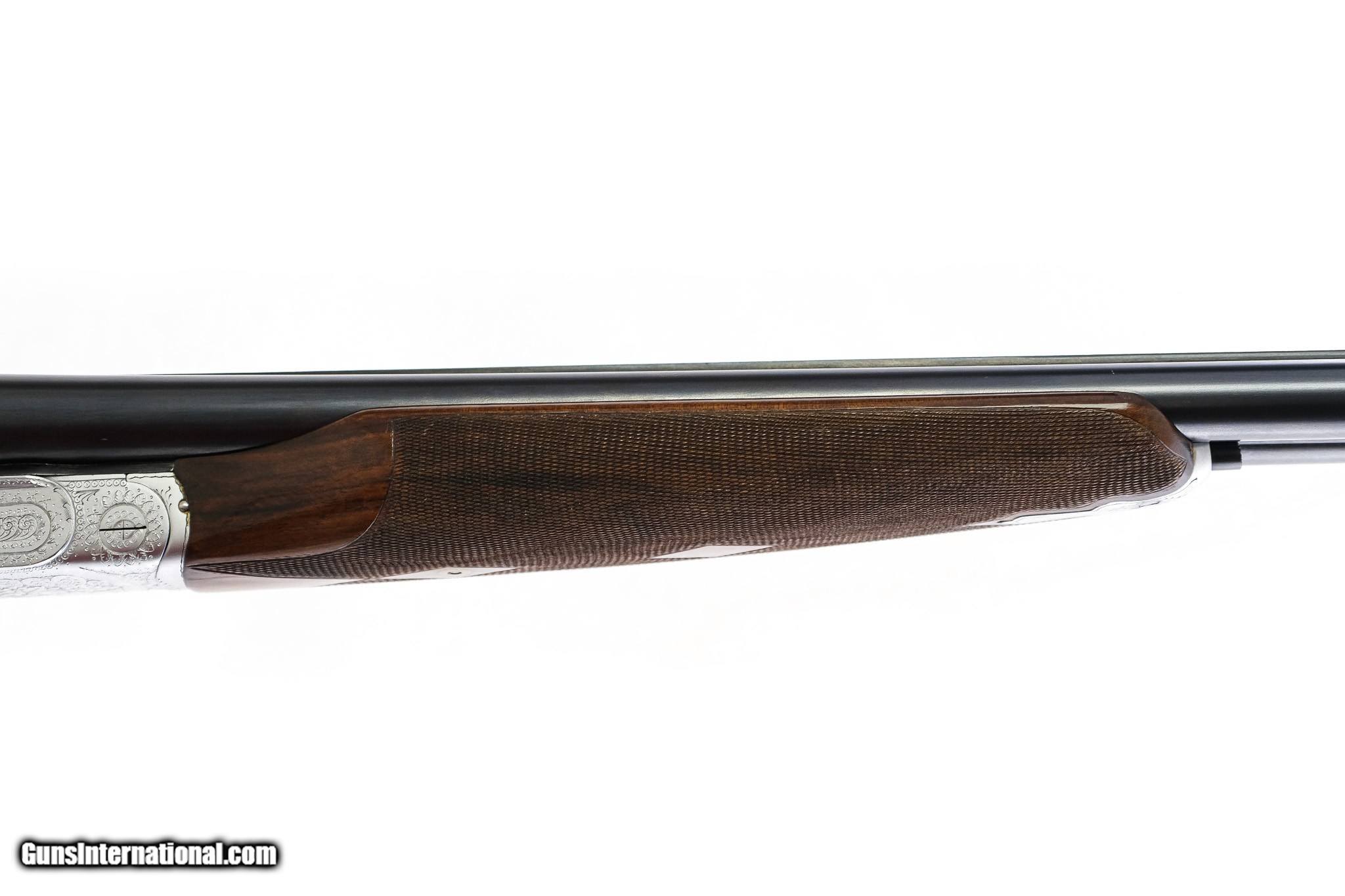 Description: Bernadelli L. Satina - SxS, 20ga. 25 ¾" Bohler Barrels Choked M/IM. Made in 1969, 2 ¾" chamber, small raised vent rib, made in Gardone, Italy; small beavertail, beautiful checkered, scroll engraved on a coin finish, engine turned interior, engraving is about 90% by GILLI, single trigger, auto ejector, full pistol grip, buttplate, very lightly used, almost perfect gun! Inv: 76696 6 lbs. 7 oz. 13 ¾" x 1 3/8" x 2 ¼" $3,995.00 SOLD |