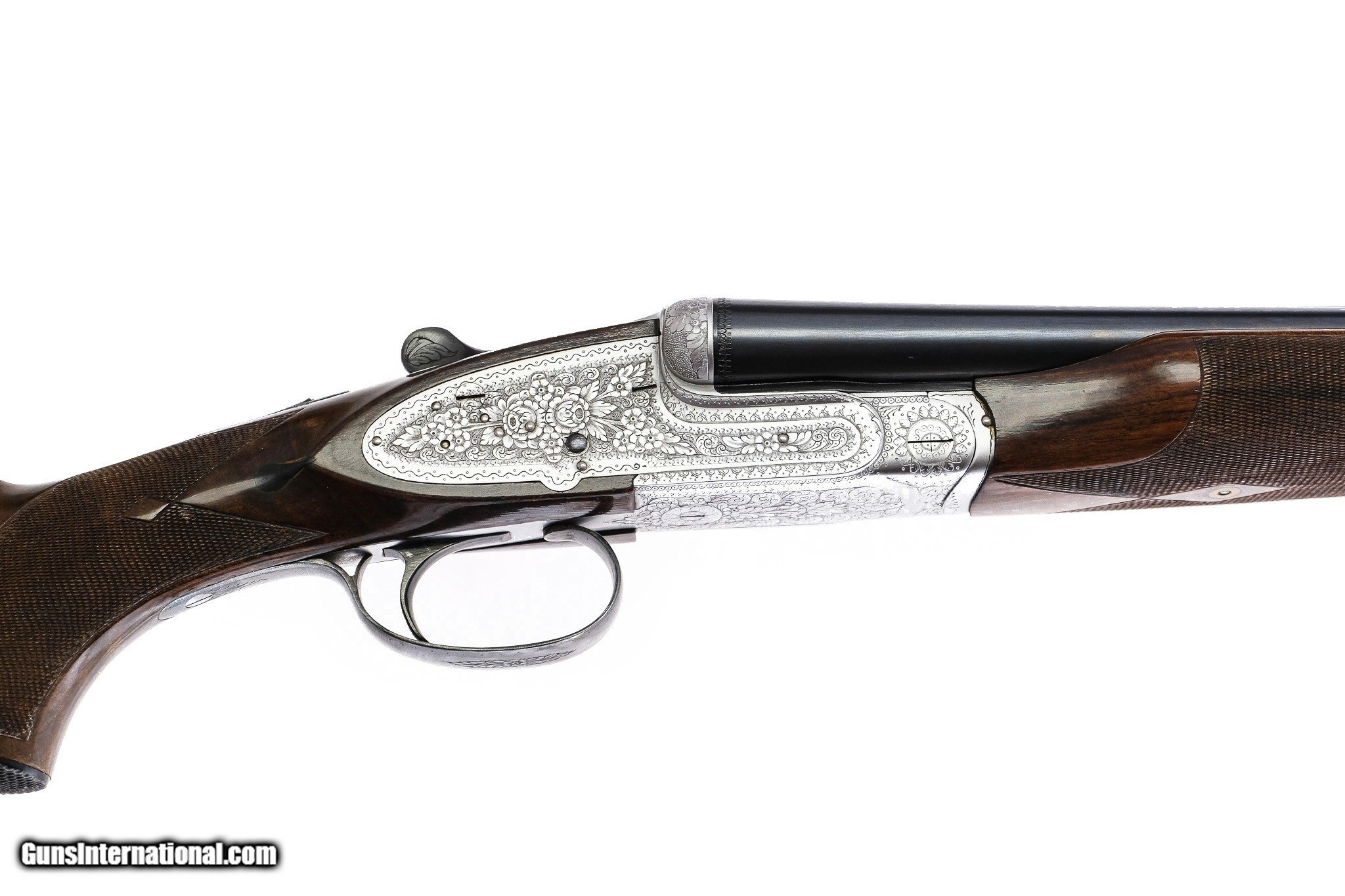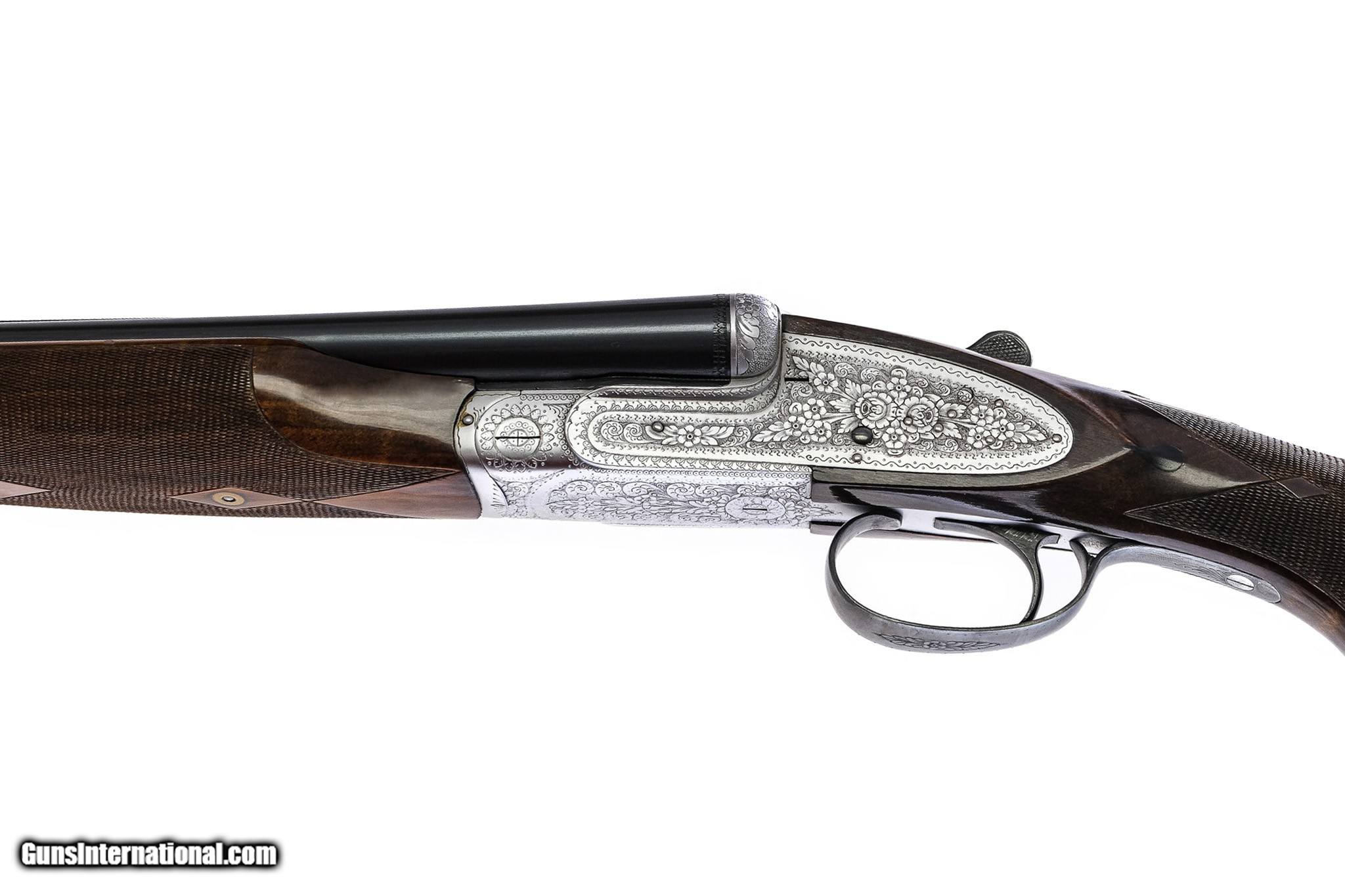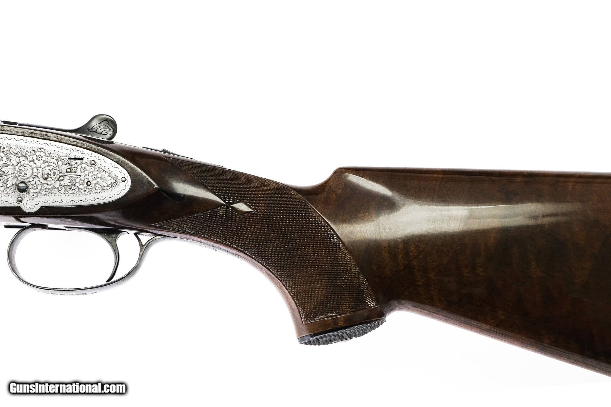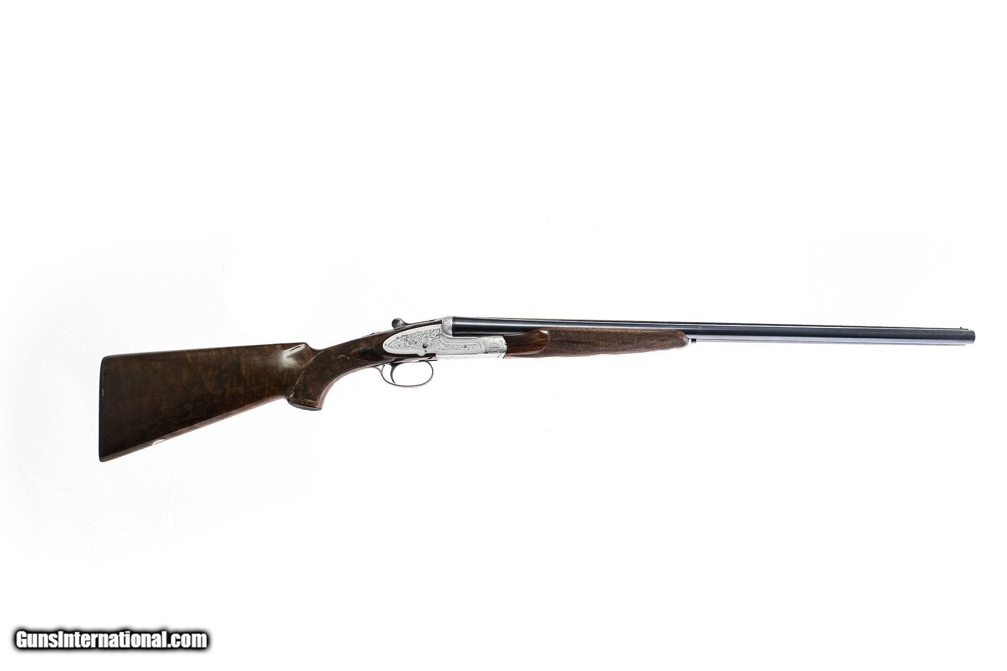 Description: Bernadelli L. Satina - SxS, 20ga. 25 ¾" Bohler Barrels Choked M/IM. Made in 1969, 2 ¾" chamber, small raised vent rib, made in Gardone, Italy; small beavertail, beautiful checkered, scroll engraved on a coin finish, engine turned interior, engraving is about 90% by GILLI, single trigger, auto ejector, full pistol grip, buttplate, very lightly used, almost perfect gun! Inv: 76696 6 lbs. 7 oz. 13 ¾" x 1 3/8" x 2 ¼" $3,995.00 SOLD |