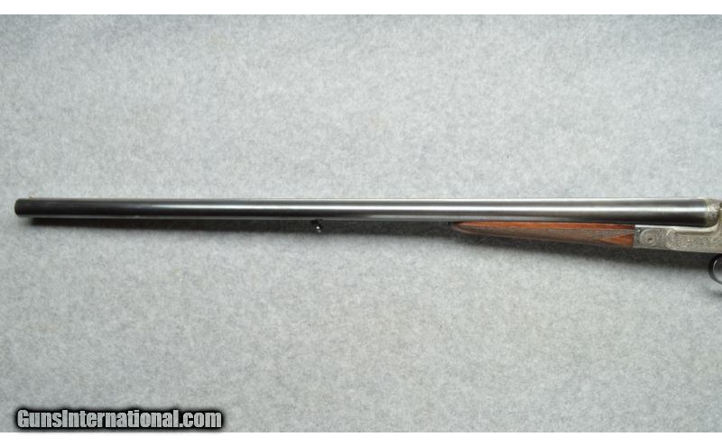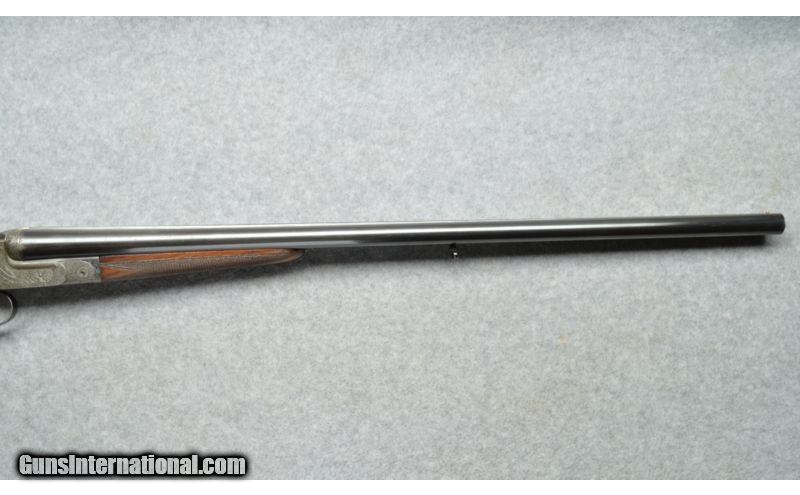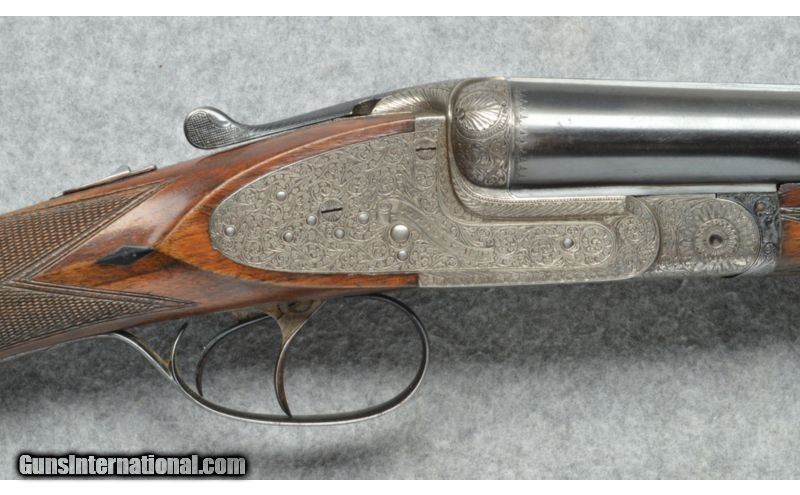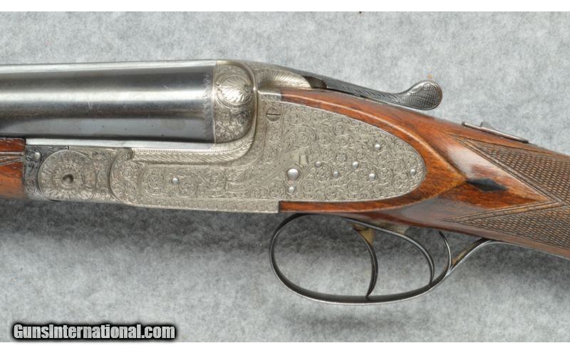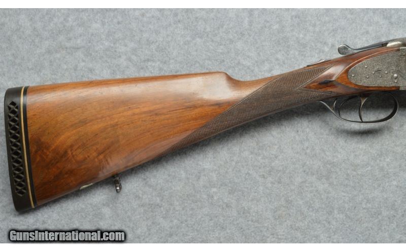Description: SOLD Manufacturer: Cannot verify manufacture date. Caliber Info: 12 Ga. Chambers: Break action side by side, True Sidelock Shotgun. Metal Condition: Good to very good,Some fading of the barrel bluing, receiver is beautifully engraved in the white. Wood Condition: Good condition, some surface scratches on the stock, checkering has lost some of the sharpness. Bore Condition: Clean, shiny, very good. Barrels: 27 1/2 inch blue round barrels. Triggers: Two triggers. Stock: Checkered English style straight grip semi gloss finish. Stock Dimensions: 13 3/4 LOP rear trigger, 14 1/2 LOP front trigger. Fore End: Checkered to match the stock. Butt Pad: Brown recoil absorbing rubber butt pad. Weight: 7 1/4 pounds. Sights: Brass bead at the muzzle. Chokes: Fixed chokes, Modified left, Cylinder right. Item Location: Berlin, MA |
