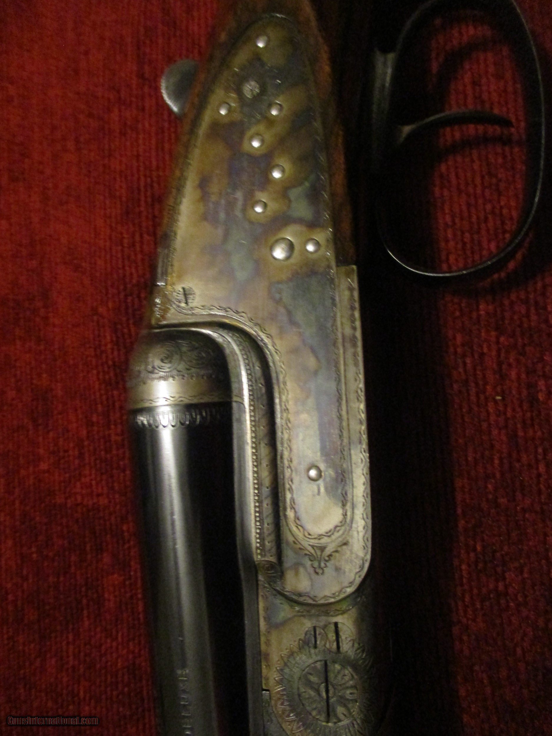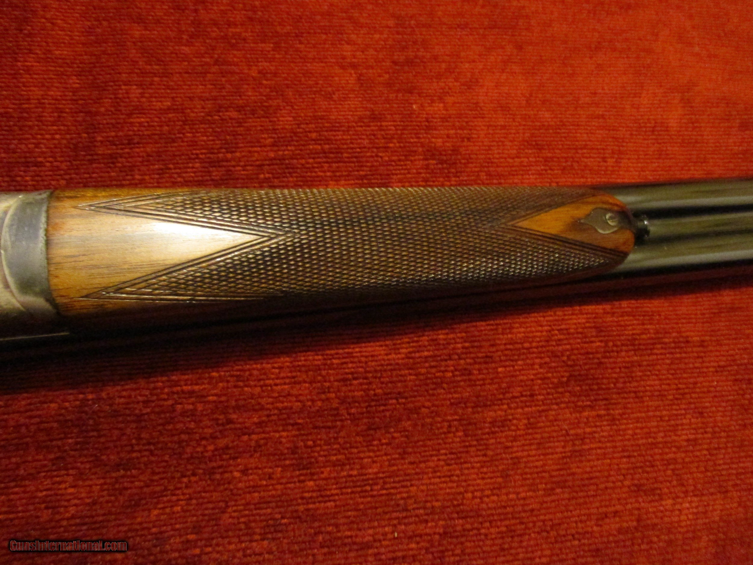 Description: 28" tapered solid rib, choked M/F, double triggers, engraved receiver breech, receiver balls & tangs, jewelled action & flats, very vivid bright case colored frame & sideplates, deluxe preminum grade straight stock, 14 1/8" LOP over factory buttpate, 98% blue & CC, minor handinng, 6 lbs. SOLD |
