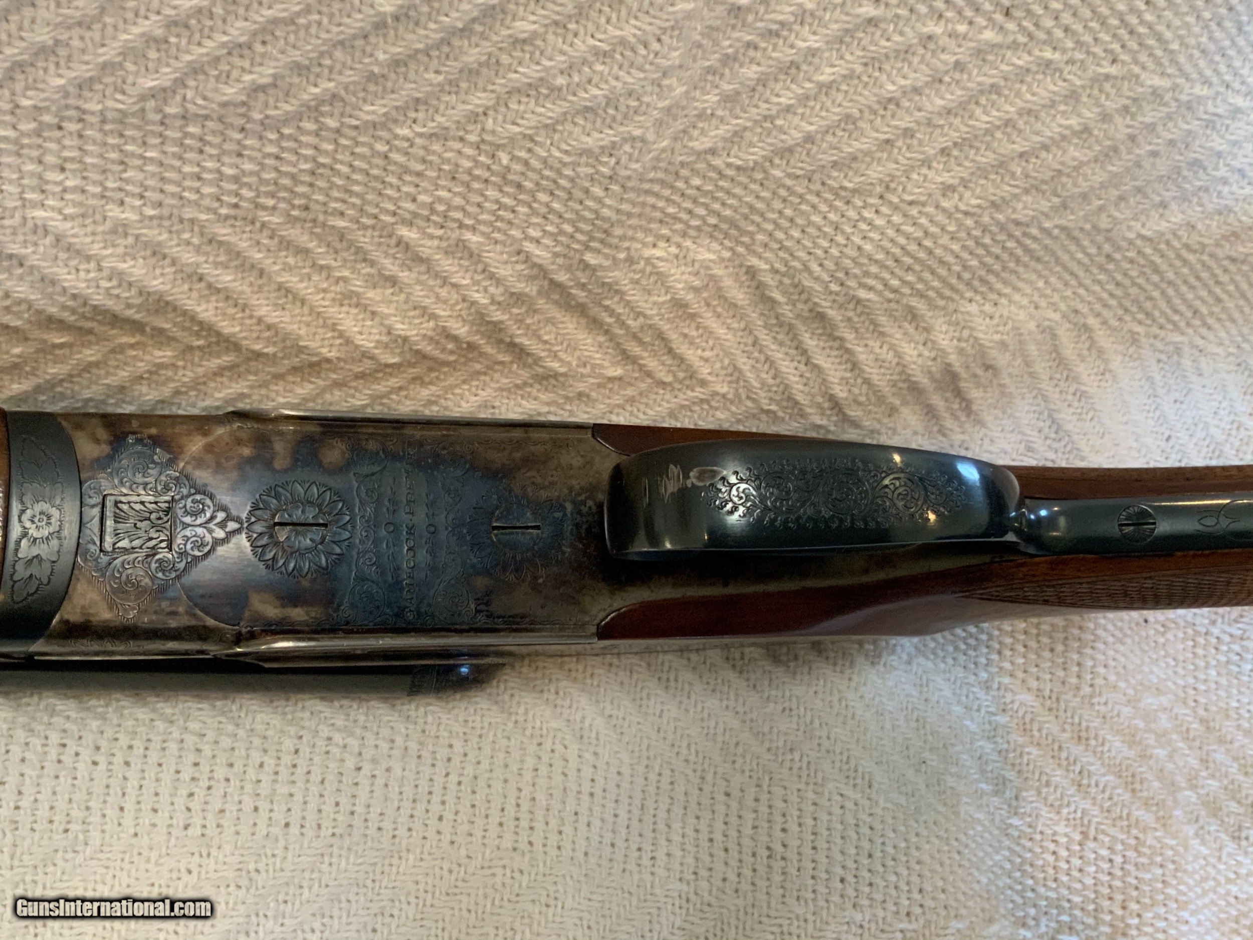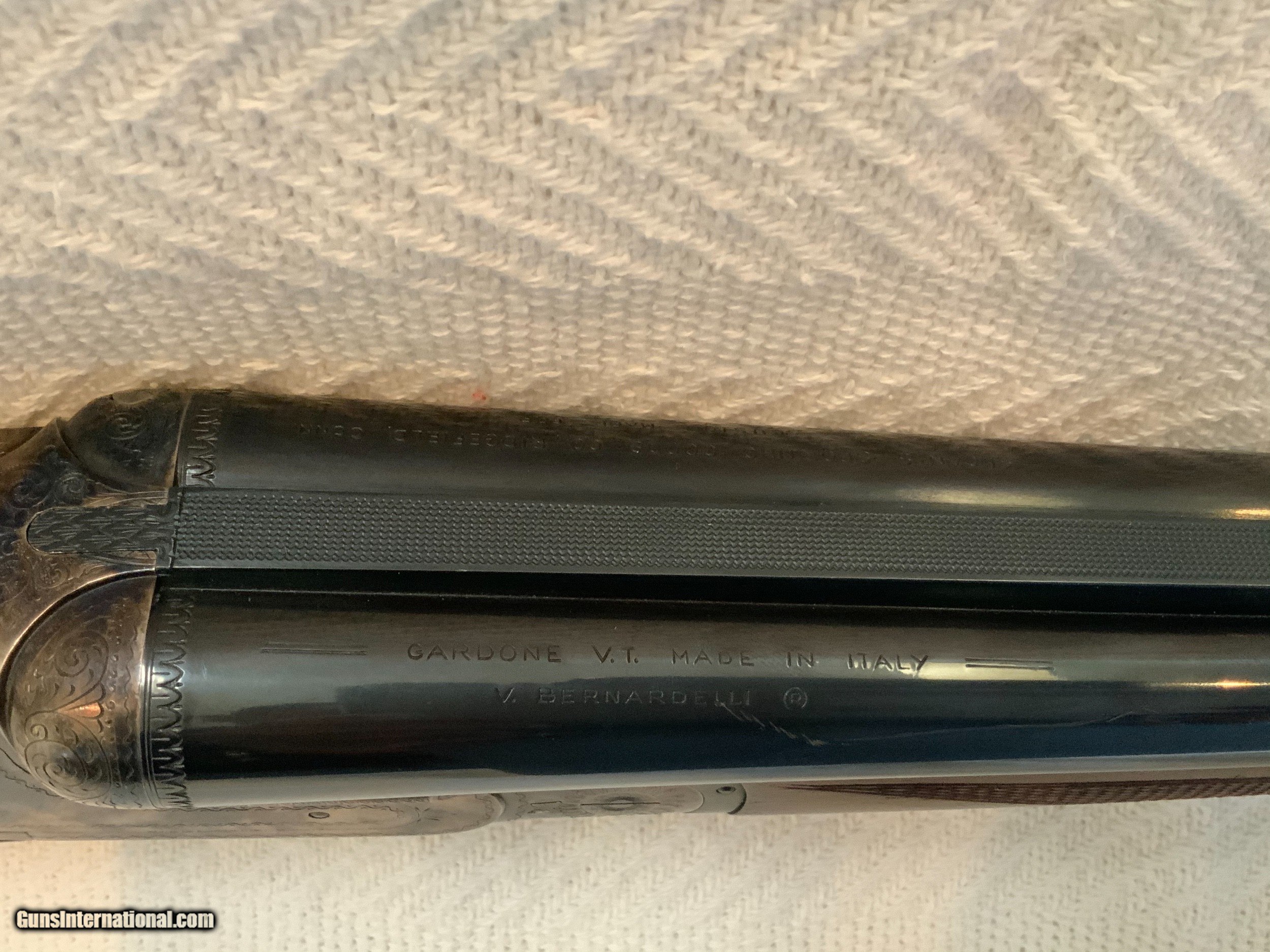 Description: Bernardelli Gamecock 20 ga Premier Shotgun, with Ejectors- Made in Italy. The shotgun is a standard Boxlock configuration with a straight English style stock. Has a recall pad but stock has not been cut. The patina is good with ornate engraving and the bluing is 95% and the wood is in great condition. This shotgun is also lightweight, high quality and rugged. This has a Barrel that is a Cylinder Bore that shows 4 stars and the other Barrel is a Modified showing 2 star. Add an additional $50 to purchase price for shipping. SOLD Shotgun Gauge: 20 Gauge Manufacturer: Bernadelli Barrel Length: 25.5 Metal Condition: 95% Wood Condition: 95% Bore Condition: Excellent |