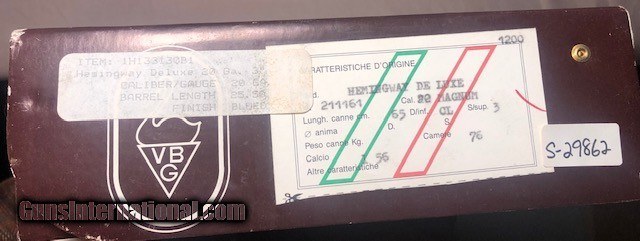 Description: Bernardelli Hemingway Deluxe 20g 26" Excellent- 100% new. One owner. Never fired. SN- 211161 6 lbs Comb 1 1/2" Heel 2 1/8" LOP 14 3/4" Cast 0 26" bbls C/M Double Triggers 3" chambers Please call or email for additional information and photos. SOLD |