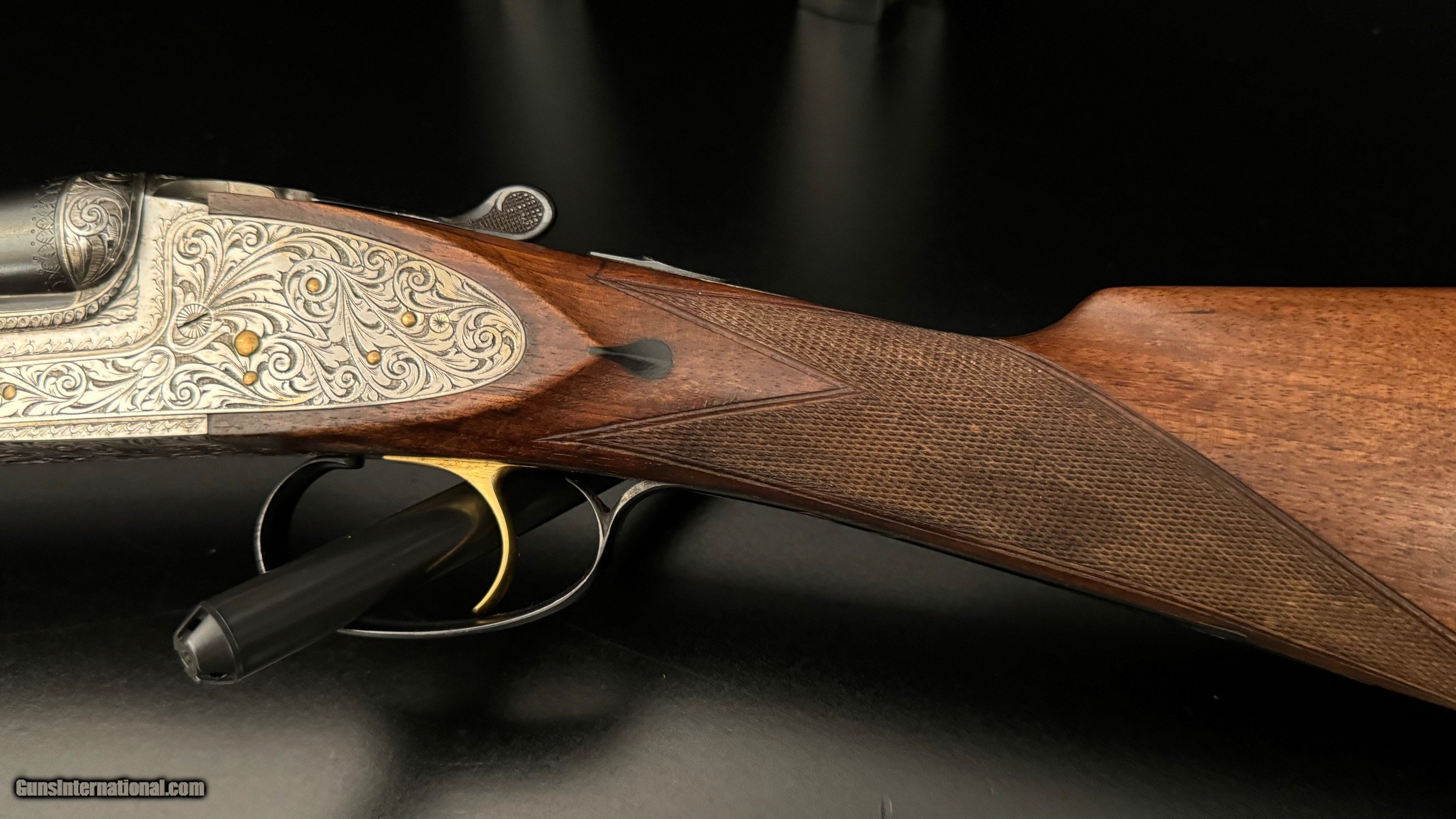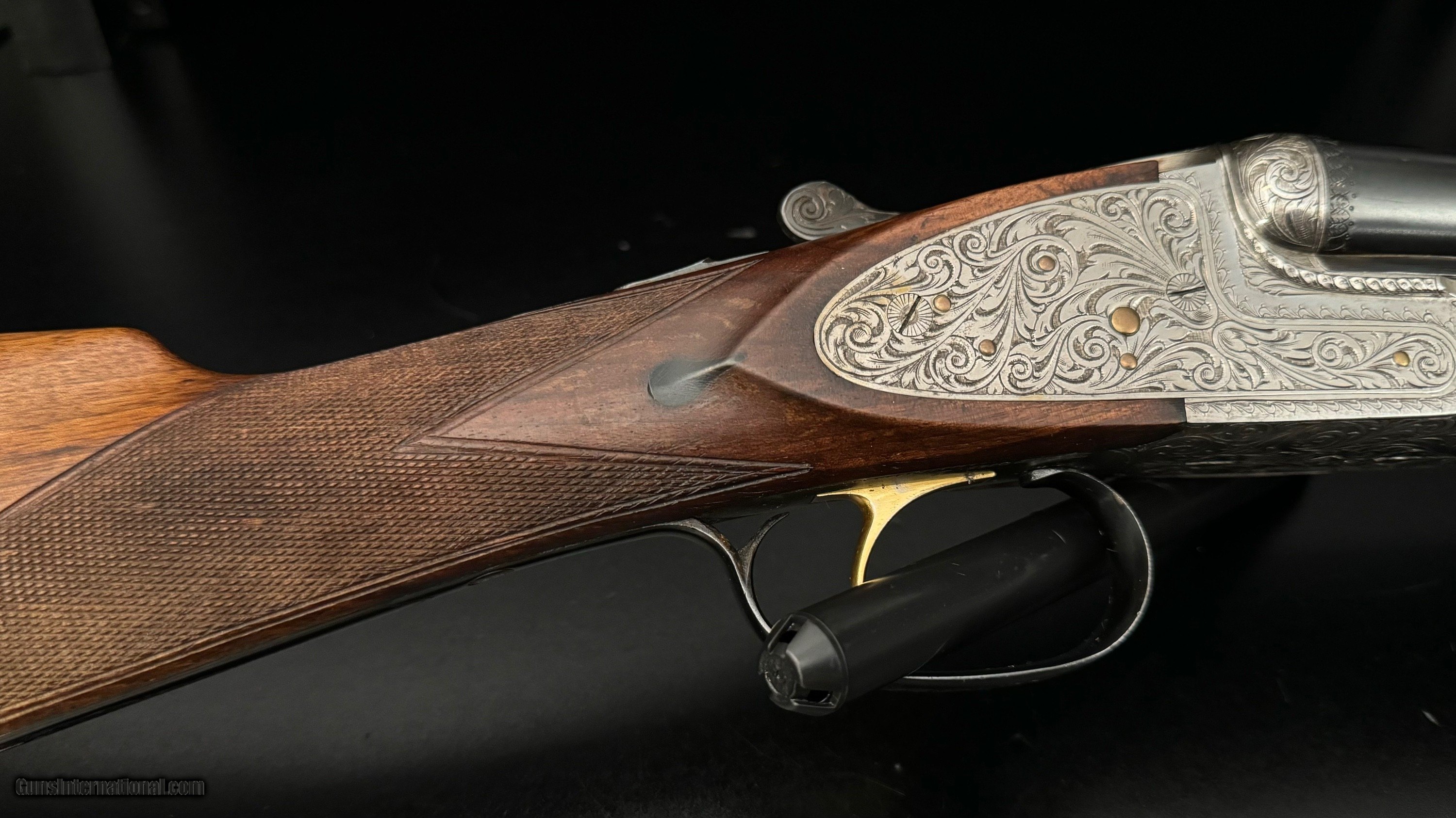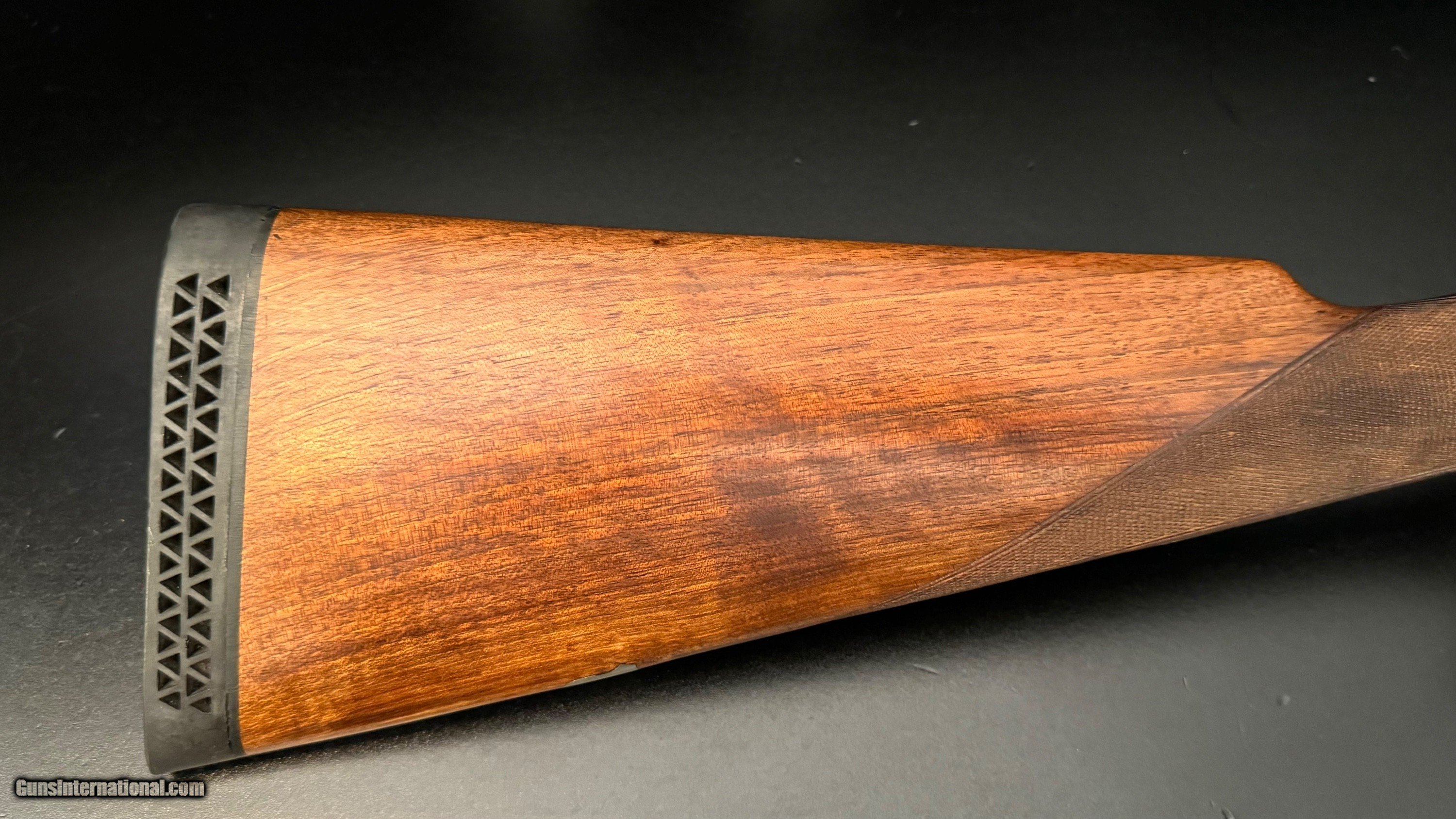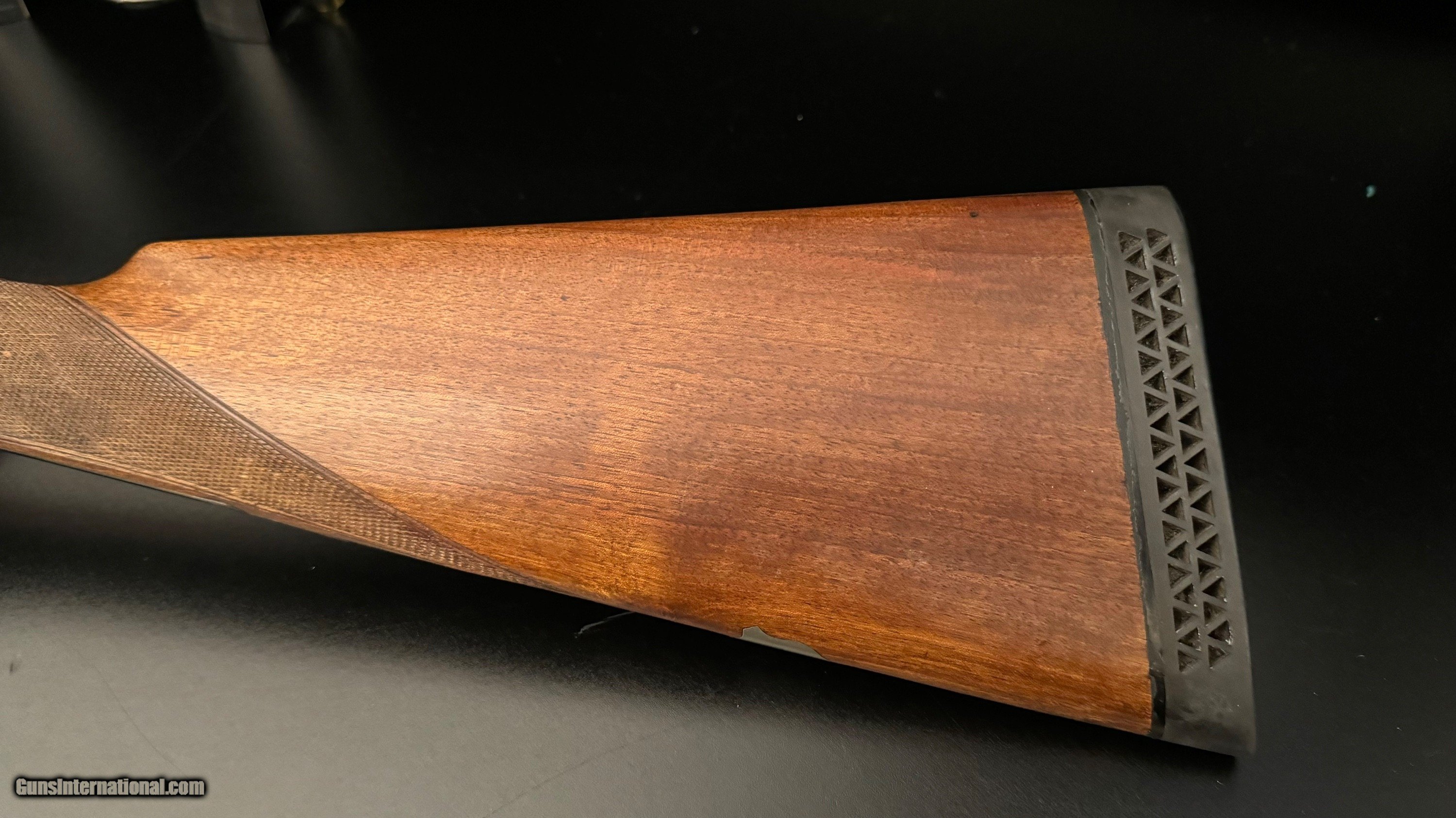 Description: Looking to sell a rare L. Santina Bernardelli 20GA Engraved Side Lock SxS Double Barrel Shotgun. This EXQUISITE shotgun is in used condition and features a 5 pin Holland and Holland style side lock action, 25 1/2" Boehler steel barrels chambered in 2 3/4", fully engraved reciever with gold push pins, checkered walnut stock with silver shield inlay, checkered/diamond pattern forend with engraved push button release, gold trigger, trigger guard is blued with light engraving, beaded fences, auto-ejectors, steel bead front and mid sights, and reco il pad. The left barrel is stamped with 3 stars "MOD" choke and the right barrel is stamped with 4 stars "IMP. CYL" choke. DO NOT consider shooting this until you have the information verified by a good gunsmith that knows shotguns and how to read proof marks. Serial #25162 Standard Italian proof mark (XXVI) on the flat dates it to 1970. OAL - 42 1/2", LOP 14" The detailed engraving on this shotgun is a work of art and speaks for itself. The coin finished receiver is hand engraved and signed by V. Temponi. This shotgun has a overall nice patina and retains 98% of its bluing on the barrels with some light marks here and there. The wood has some light dings and scratches, but no cracks. ALL original matching numbers and proper...this shotgun is a must-have for any collector or gun enthusiast. Please see all pics and you be the judge! Note: ALL SALES ARE FINAL, with the exception of 3-day inspection period for USED guns. Buyer pays $100 shipping & insurance to lower 48 States. PAYMENT: Cashiers Check, USPS Money Order or Personal Check only, unless pre approved by me. Payment is expected within 7 business days, not including weekends or holidays. Warranty/Inspection Period: All firearms should be checked over by your Gunsmith prior to being shot or handled. PLEASE know your own state and local laws prior to purchasing. NO sales to CA or where illegal. I will ship your firearm out via FedEx Ground from my FFL Dealer to your FFL Dealer once payment is received and cleared. Insurance IS INCLUDED in the shipping price. Should you have any questions, please feel free to email me. Thanks SOLD Shotgun Gauge: 20 Gauge Manufacturer: Bernardelli Model: Side Lock Serial Number: 25162 Barrel Length: 25 1/2 Condition: Very Good LOP: 14 Manufacture Date: 1970 |