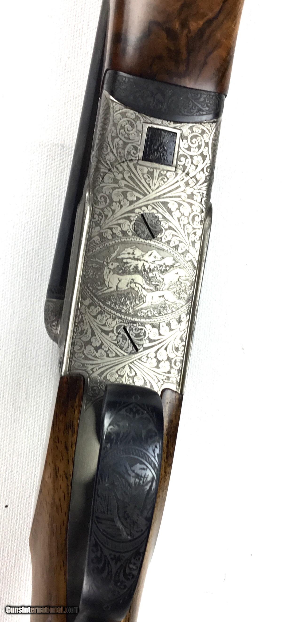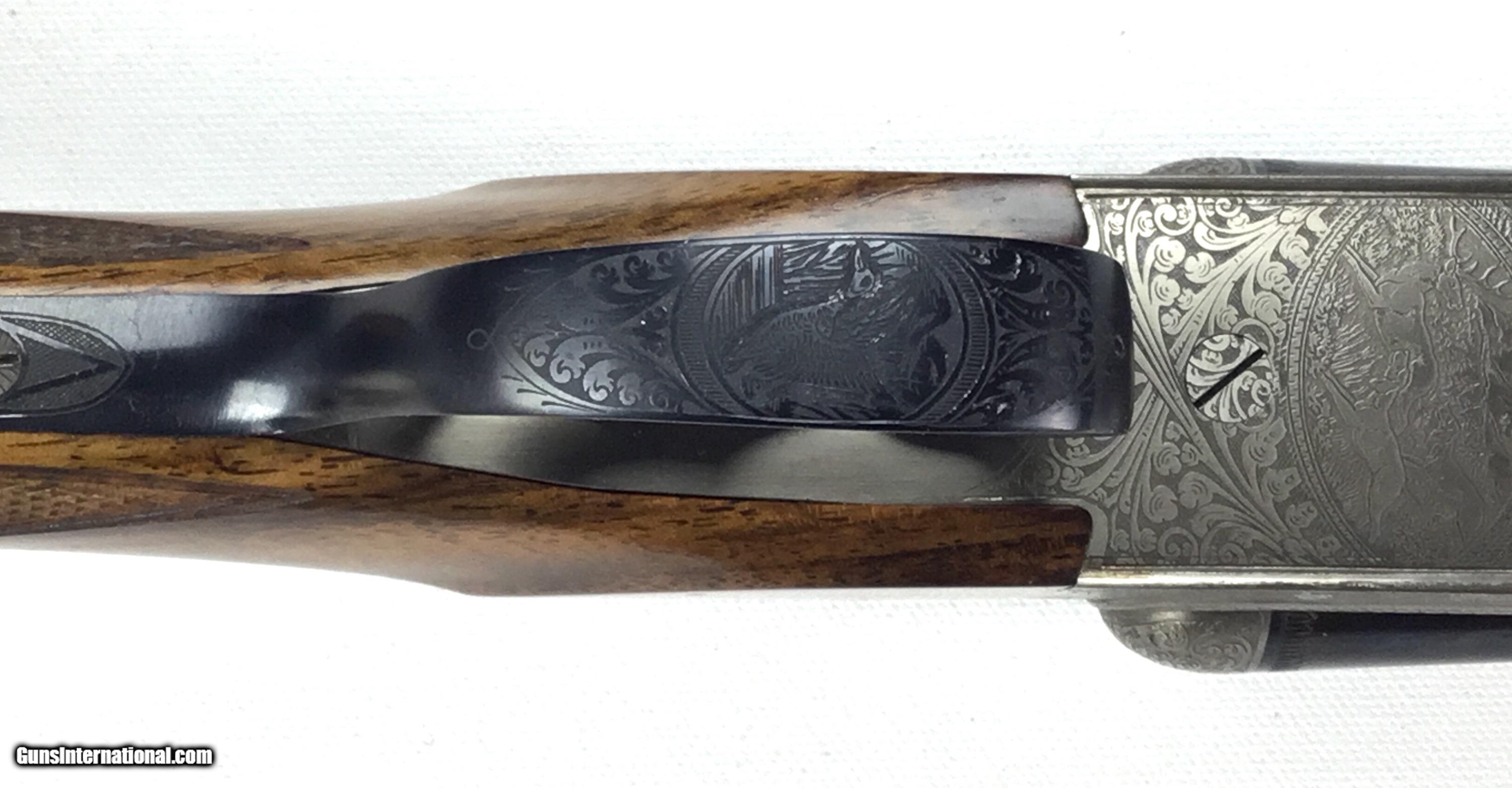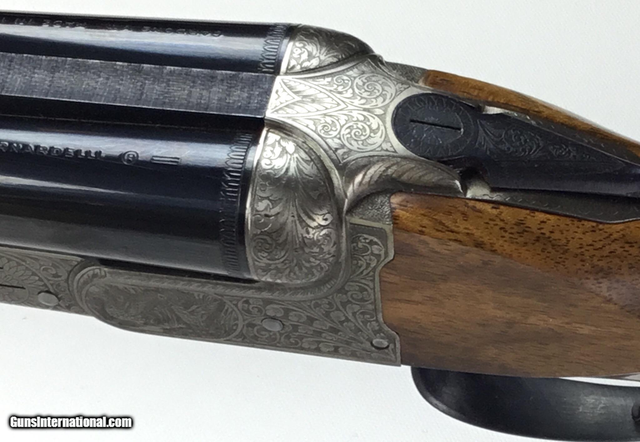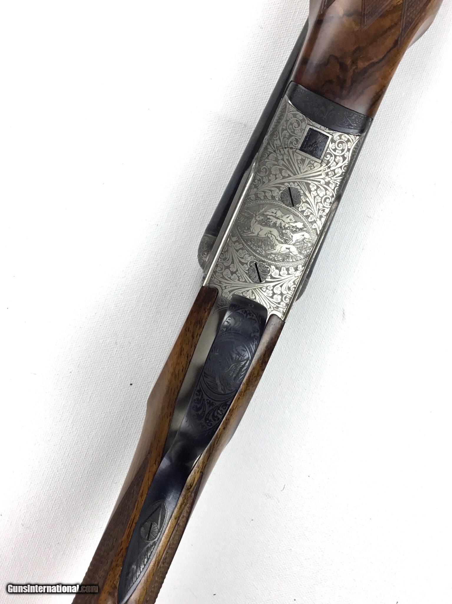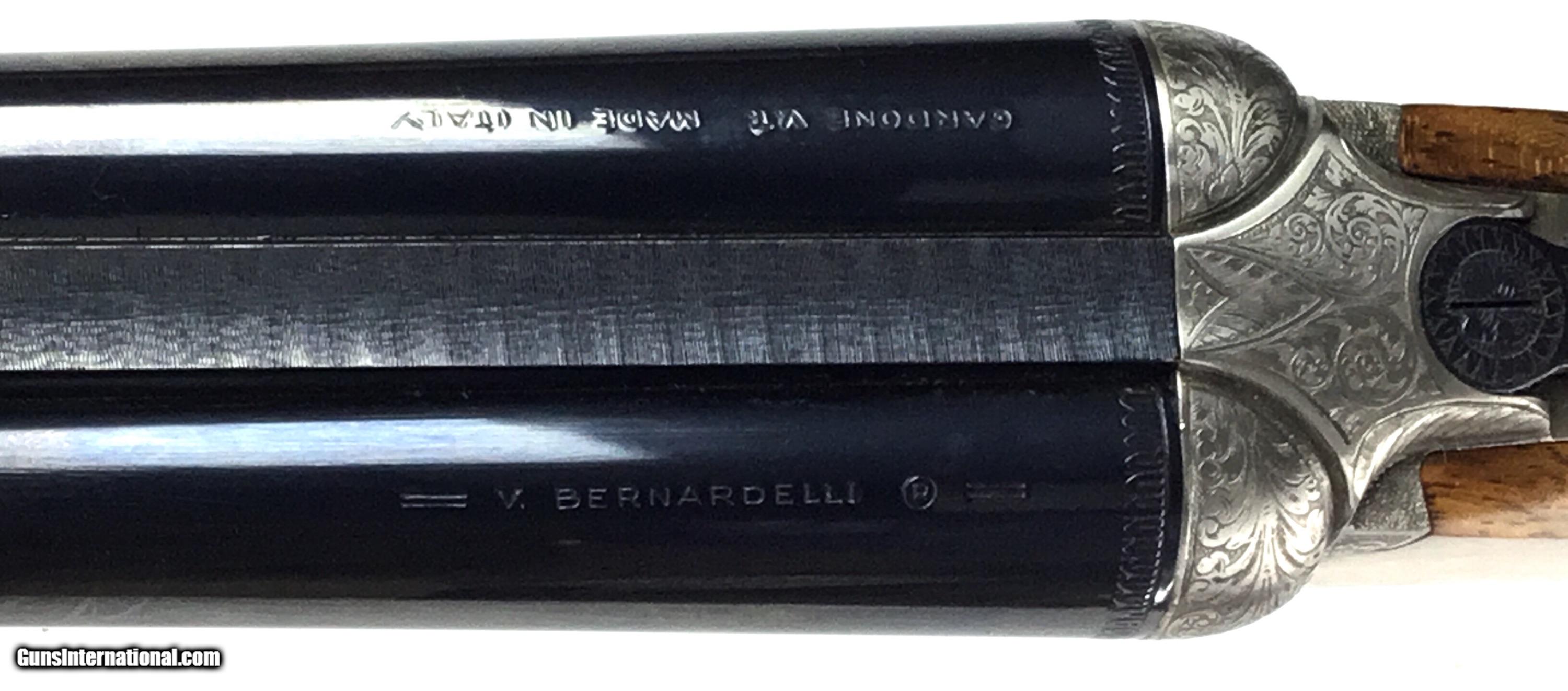 Description: V. BERNADELLI UBERTO FSE SXS 20 GAUGE, Highly Figured Semi-Pistol Grip Stock with Flat Knob Over Checkered Wooden Butt, Checkered Beavertail Forearm, Coin Finish Receiver with Game Scene Engraving, Single Non-Selective Trigger, Automatic Safety, Ejectors, 25 1/2” Bbls with Concave Filed Rib, 2 3/4” or 3” Chambers Choked IC and Mod, Weight 5 lbs. 12.4 oz., LOP: 14 1/4”, Drop Comb: 1 3/8”, Drop Face: 1 7/8”, Drop Heel: 2 5/16” Cast Face 1/8” Off, Cast Heel: 1/4” Off, Leather Hard Case, Light Handling Marks on Stock, Condition Overall Excellent, This is an Absolutely Magnificent Grouse and Woodcock Shotgun, Manufactured in Gardonne Italy, SN-199560, #2803, $2,295.00, HAMPELSGUNCO SINCE 1919. SOLD |