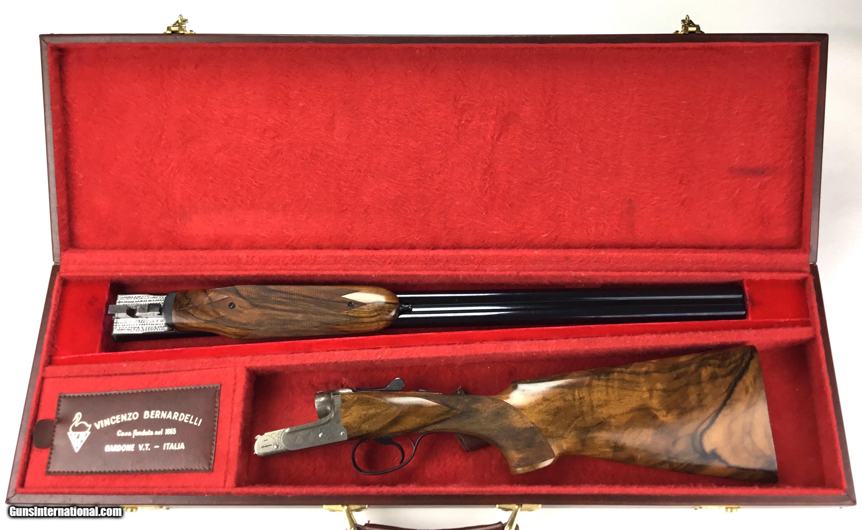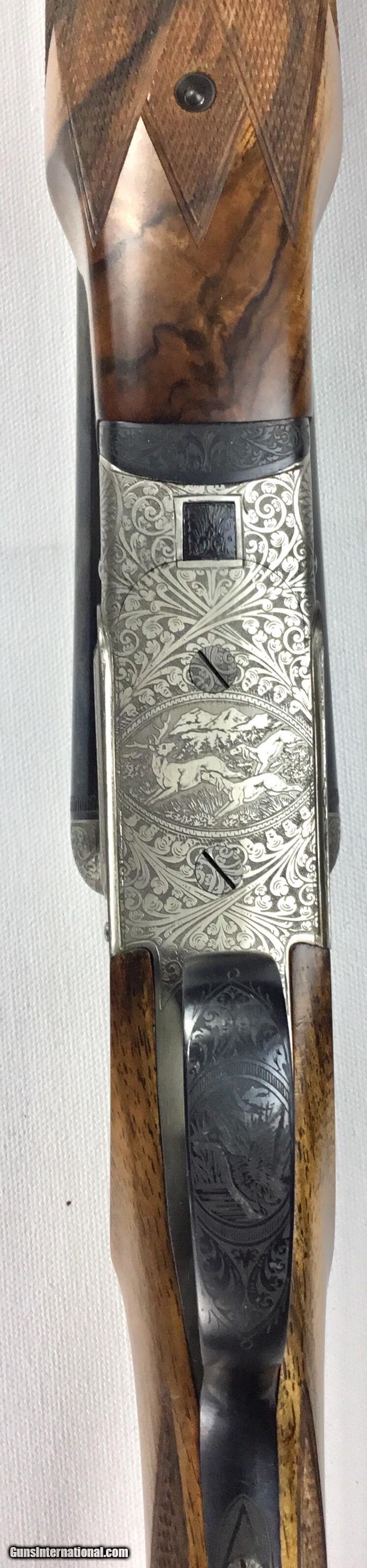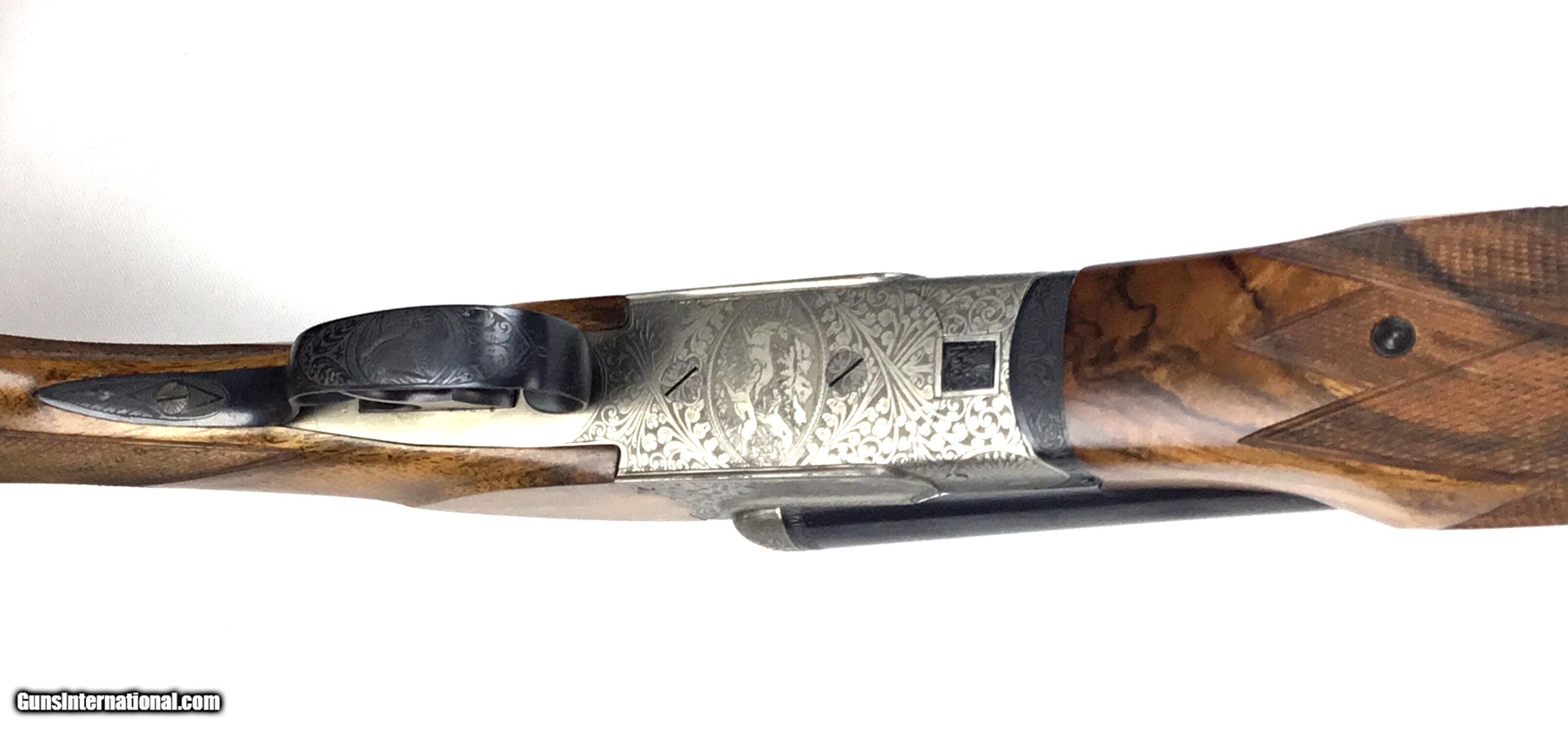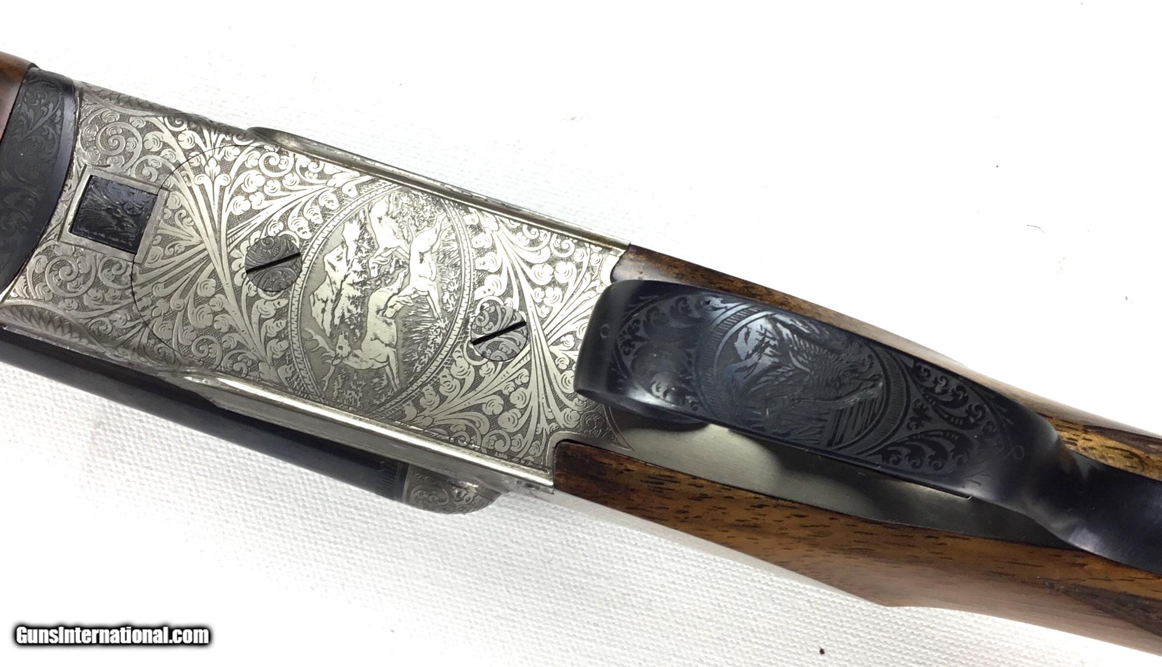 Description: V. BERNADELLI UBERTO FSE SXS 20 GAUGE, Highly Figured Semi-Pistol Grip Stock with Flat Knob Over Checkered Wooden Butt, Checkered Beavertail Forearm, Coin Finish Receiver with Game Scene Engraving, Single Non-Selective Trigger, Automatic Safety, Ejectors, 25 1/2” Bbls with Concave Filed Rib, 2 3/4” or 3” Chambers Choked IC and Mod, Weight 5 lbs. 12.4 oz., LOP: 14 1/4”, Drop Comb: 1 3/8”, Drop Face: 1 7/8”, Drop Heel: 2 5/16” Cast Face 1/8” Off, Cast Heel: 1/4” Off, Leather Hard Case, Light Handling Marks on Stock, Condition Overall Excellent, This is an Absolutely Magnificent Grouse and Woodcock Shotgun, Manufactured in Gardonne Italy, SN-199560, #2803, $2,295.00, HAMPELSGUNCO SINCE 1919. SOLD |