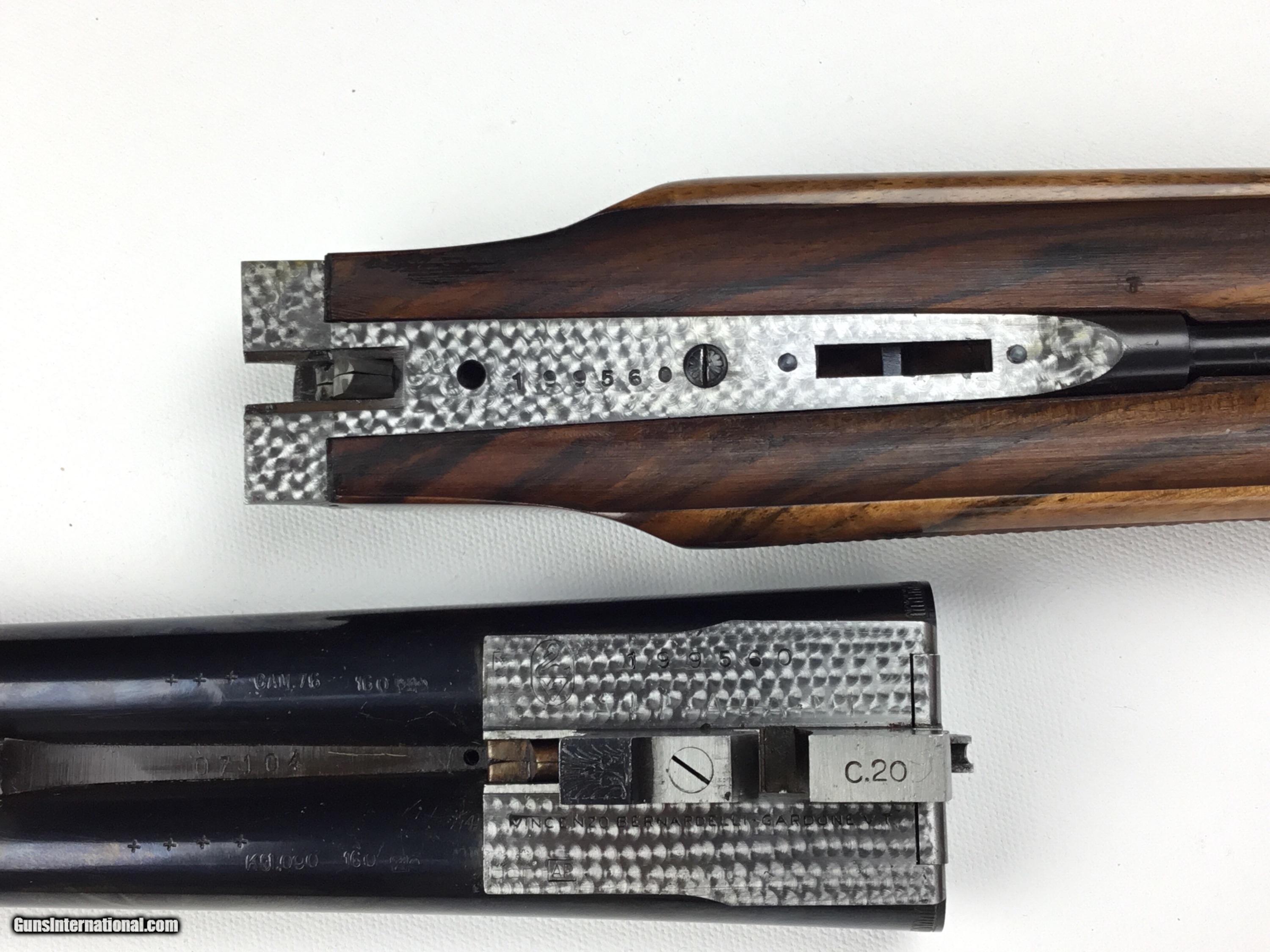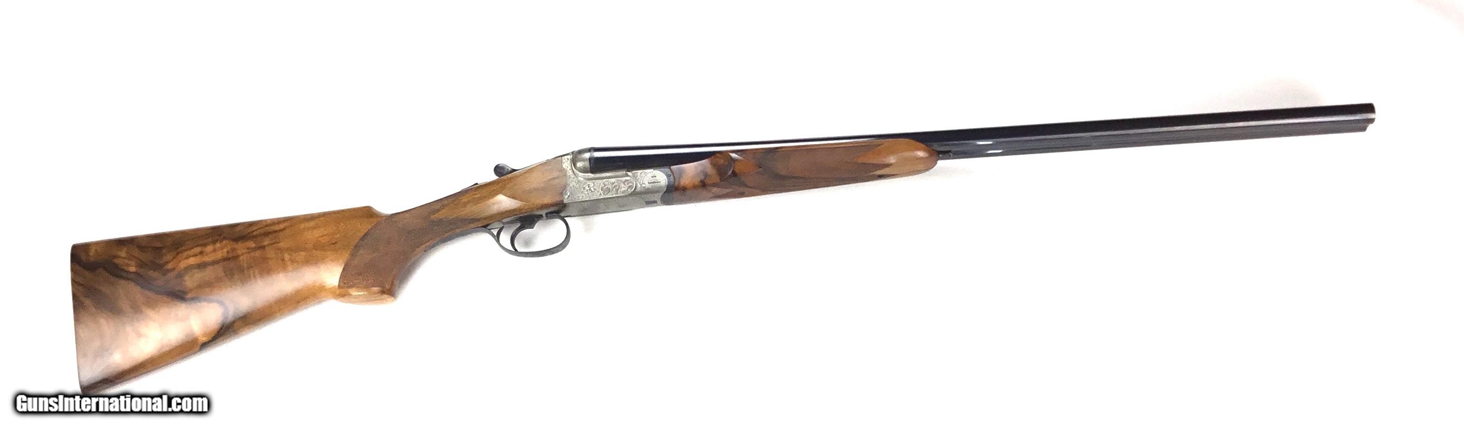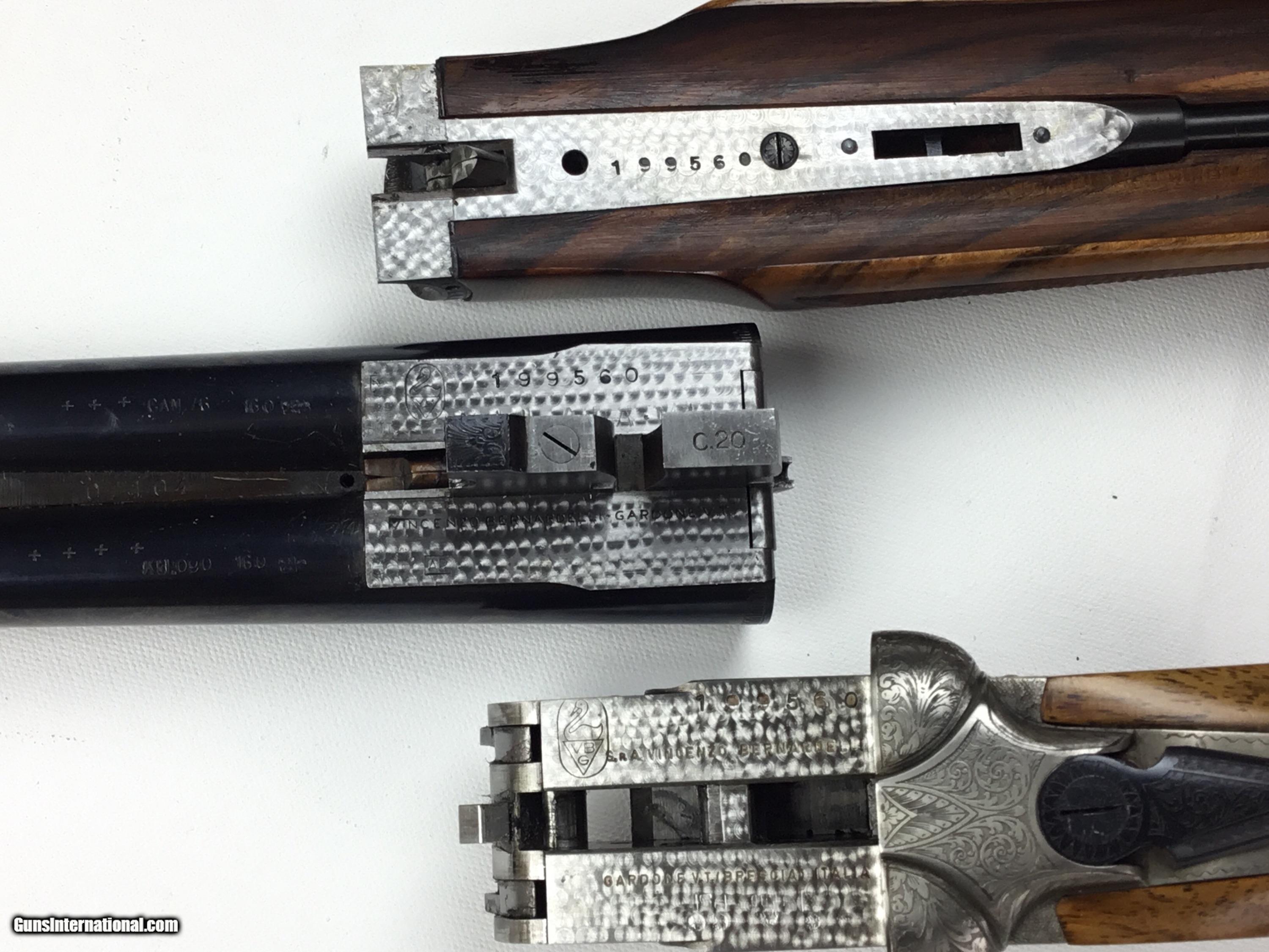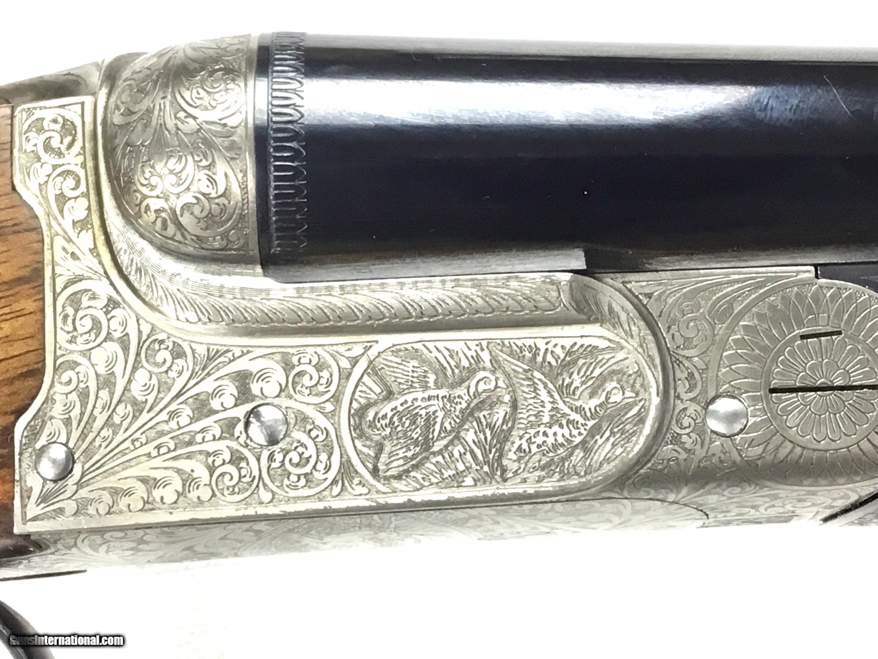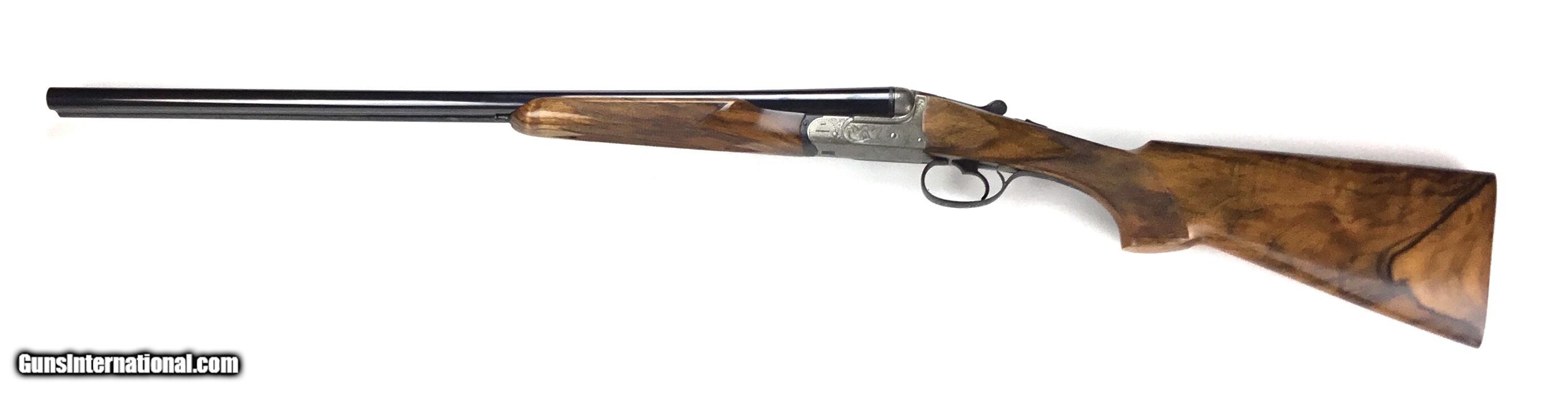 Description: V. BERNADELLI UBERTO FSE SXS 20 GAUGE, Highly Figured Semi-Pistol Grip Stock with Flat Knob Over Checkered Wooden Butt, Checkered Beavertail Forearm, Coin Finish Receiver with Game Scene Engraving, Single Non-Selective Trigger, Automatic Safety, Ejectors, 25 1/2” Bbls with Concave Filed Rib, 2 3/4” or 3” Chambers Choked IC and Mod, Weight 5 lbs. 12.4 oz., LOP: 14 1/4”, Drop Comb: 1 3/8”, Drop Face: 1 7/8”, Drop Heel: 2 5/16” Cast Face 1/8” Off, Cast Heel: 1/4” Off, Leather Hard Case, Light Handling Marks on Stock, Condition Overall Excellent, This is an Absolutely Magnificent Grouse and Woodcock Shotgun, Manufactured in Gardonne Italy, SN-199560, #2803, $2,295.00, HAMPELSGUNCO SINCE 1919. SOLD |