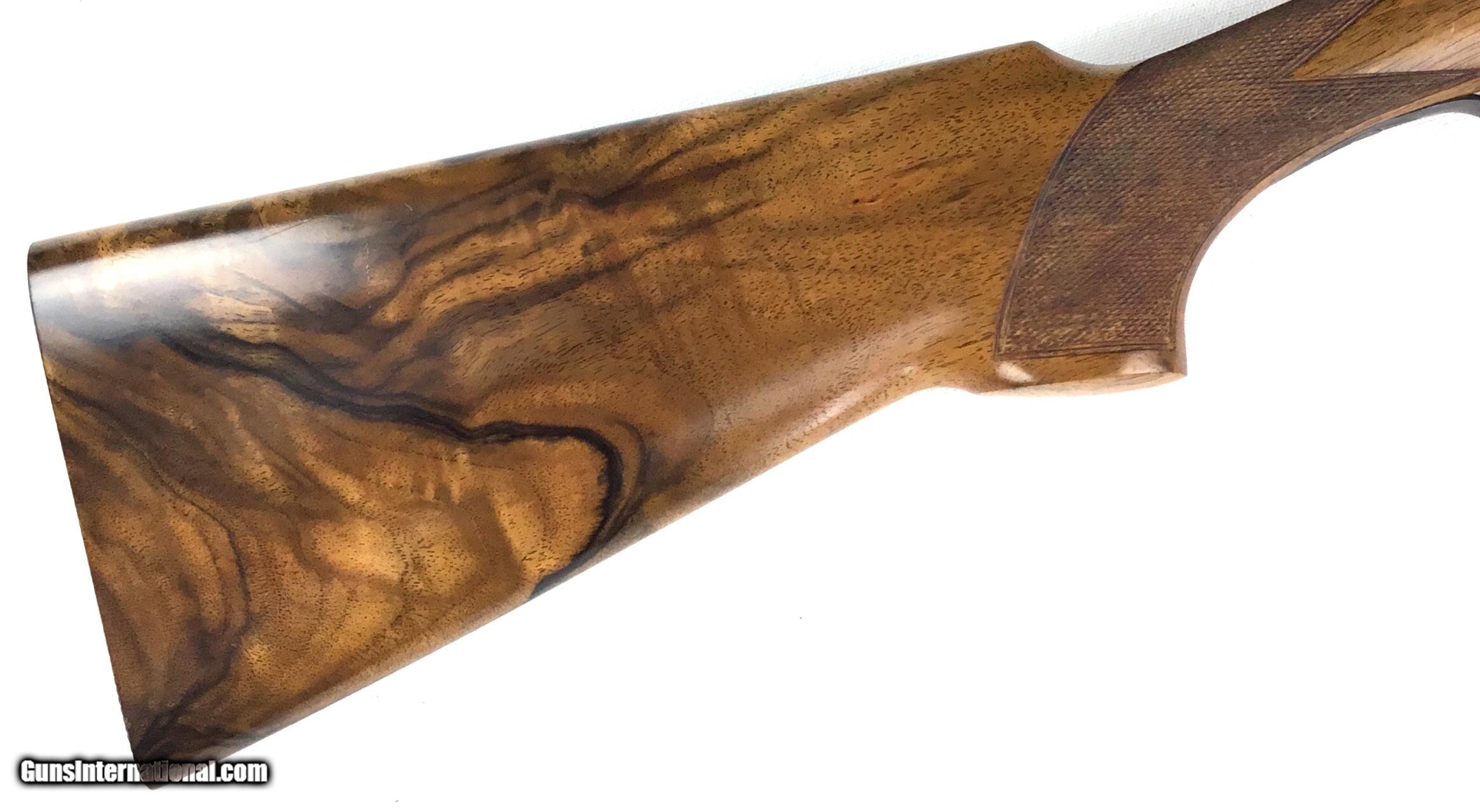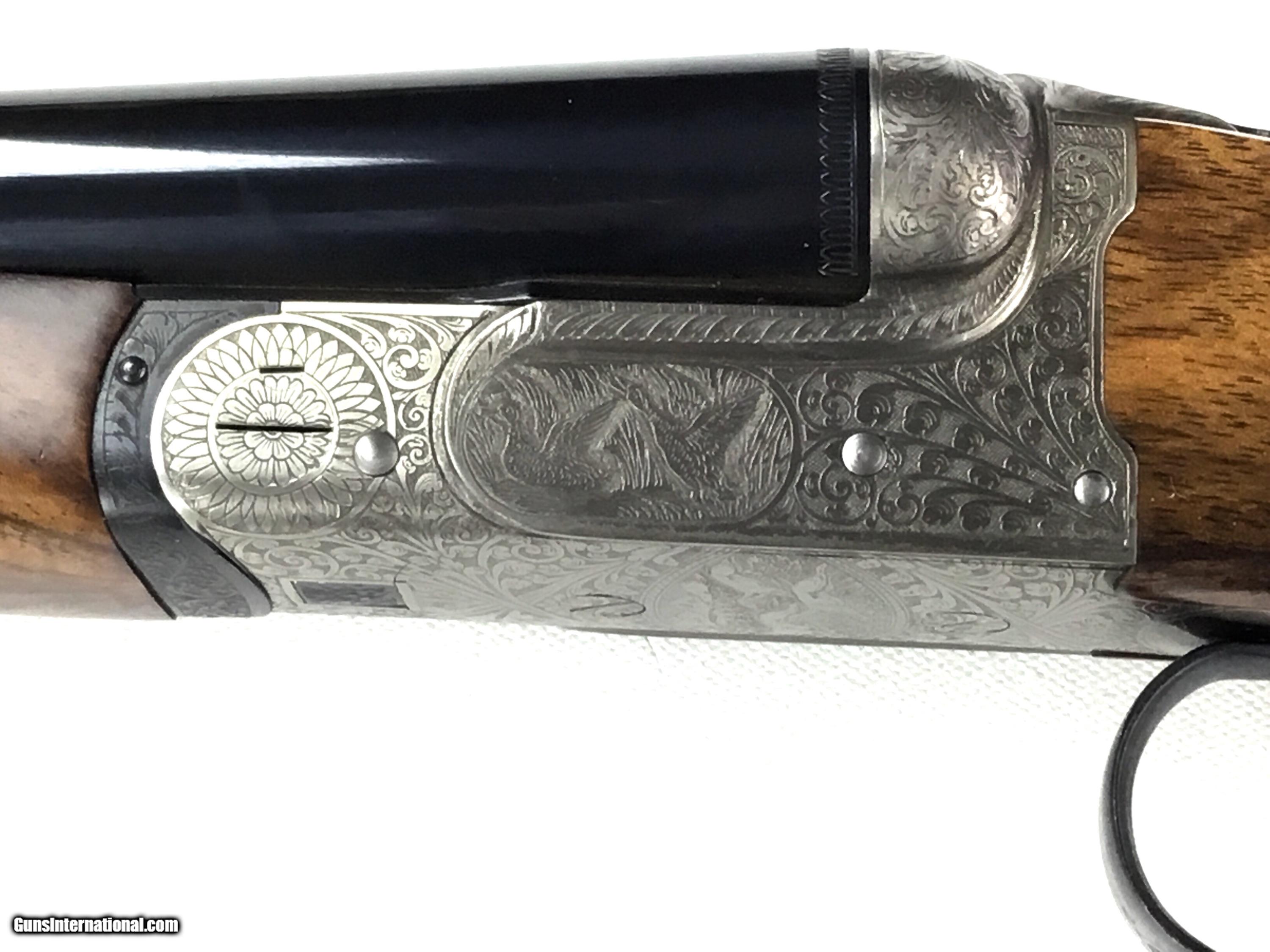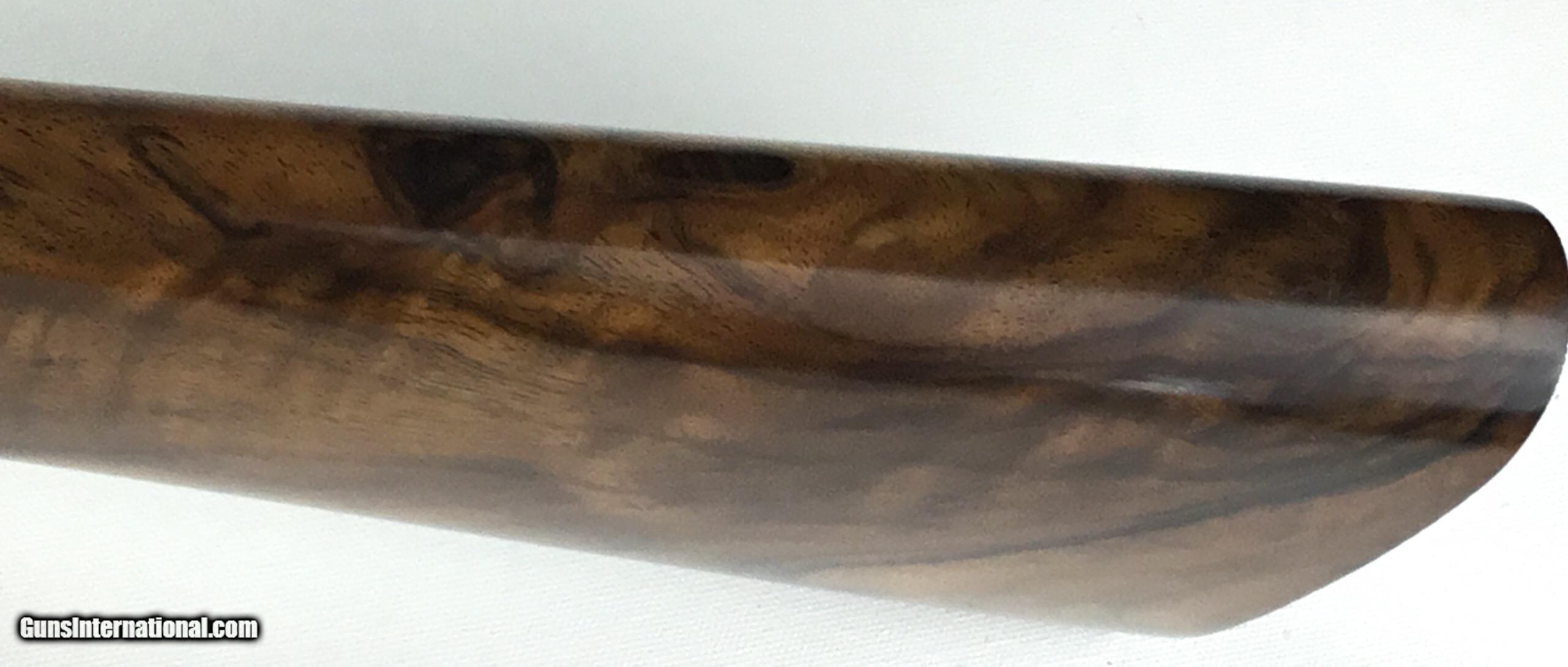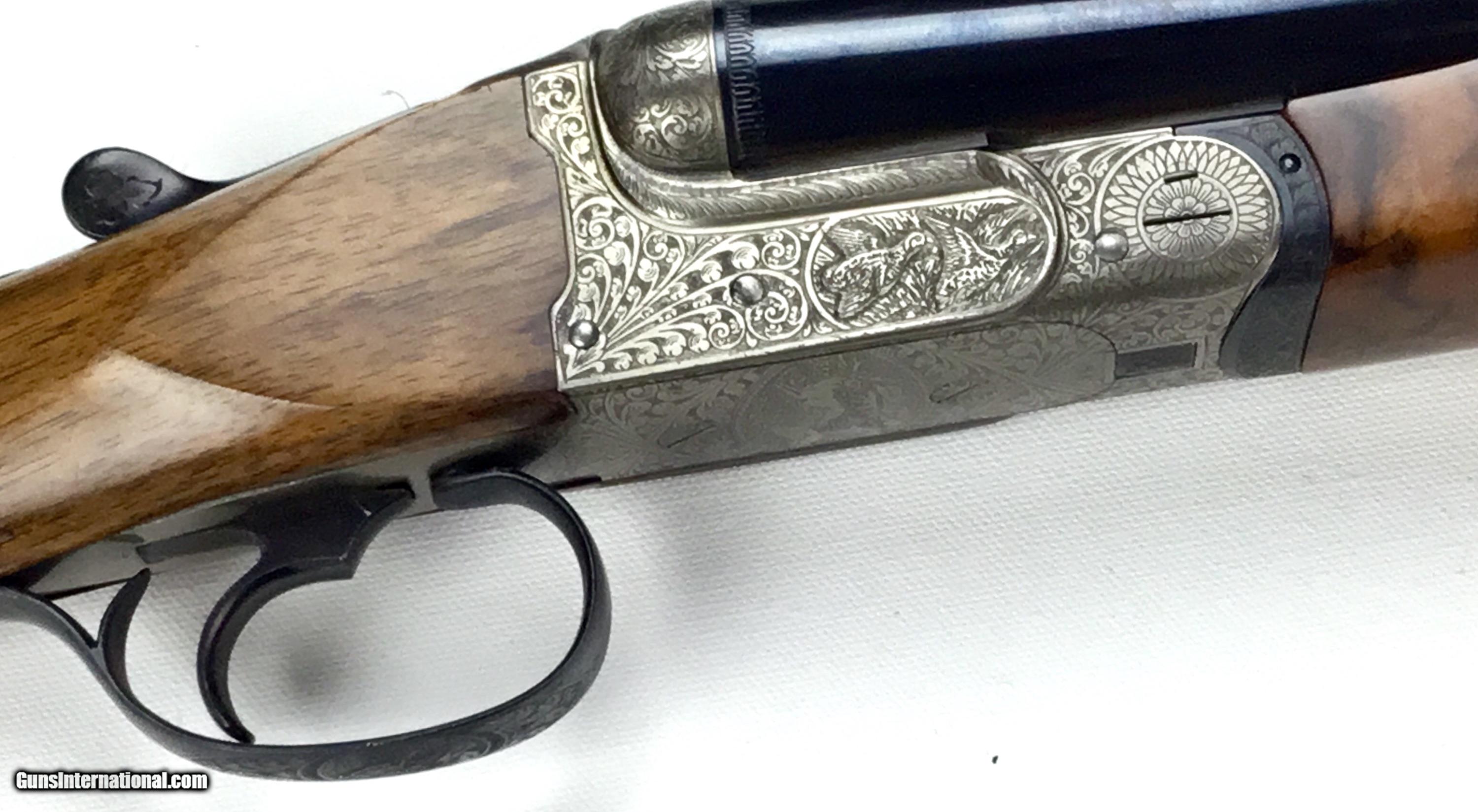 Description: V. BERNADELLI UBERTO FSE SXS 20 GAUGE, Highly Figured Semi-Pistol Grip Stock with Flat Knob Over Checkered Wooden Butt, Checkered Beavertail Forearm, Coin Finish Receiver with Game Scene Engraving, Single Non-Selective Trigger, Automatic Safety, Ejectors, 25 1/2” Bbls with Concave Filed Rib, 2 3/4” or 3” Chambers Choked IC and Mod, Weight 5 lbs. 12.4 oz., LOP: 14 1/4”, Drop Comb: 1 3/8”, Drop Face: 1 7/8”, Drop Heel: 2 5/16” Cast Face 1/8” Off, Cast Heel: 1/4” Off, Leather Hard Case, Light Handling Marks on Stock, Condition Overall Excellent, This is an Absolutely Magnificent Grouse and Woodcock Shotgun, Manufactured in Gardonne Italy, SN-199560, #2803, $2,295.00, HAMPELSGUNCO SINCE 1919. SOLD |