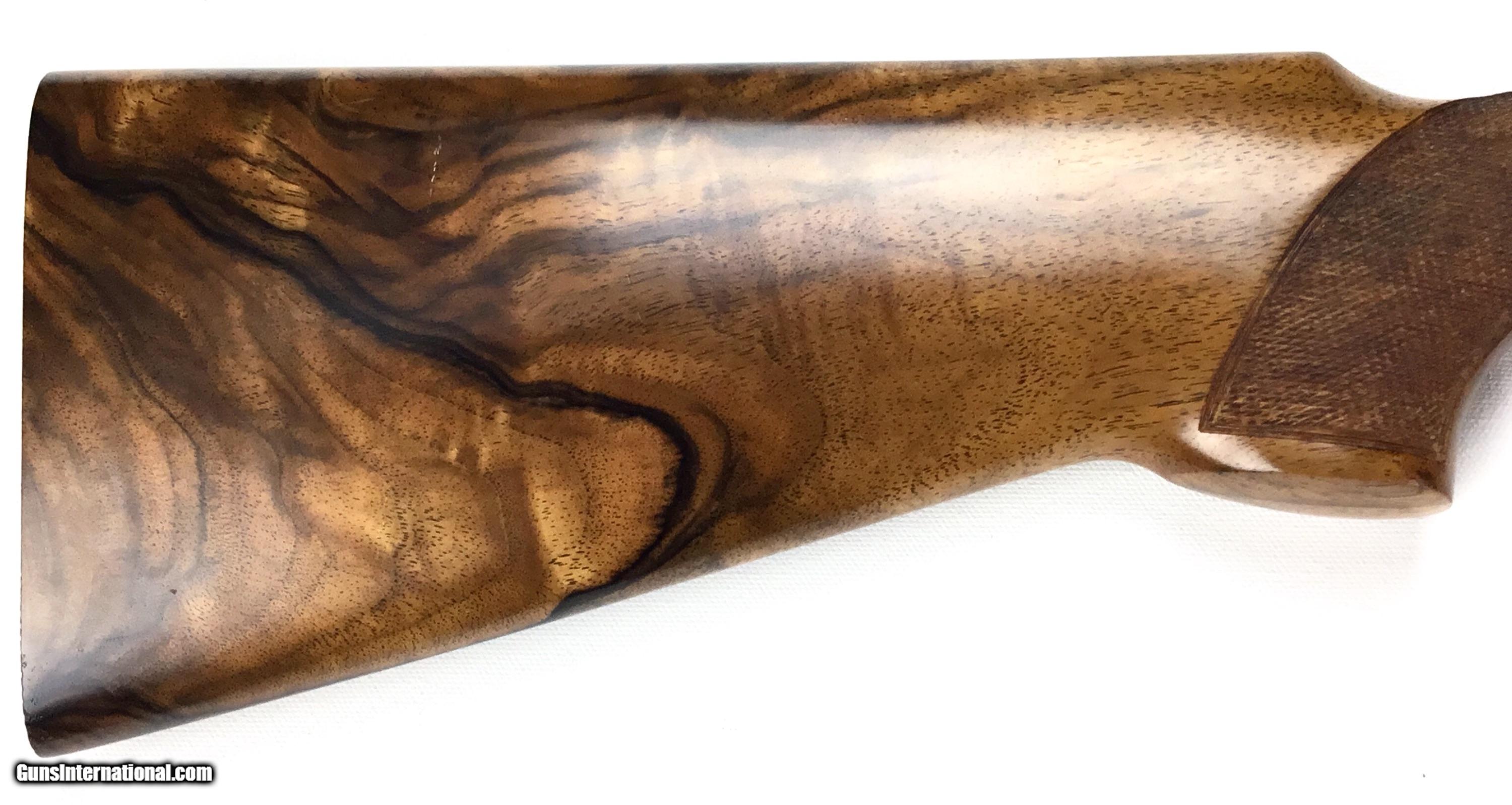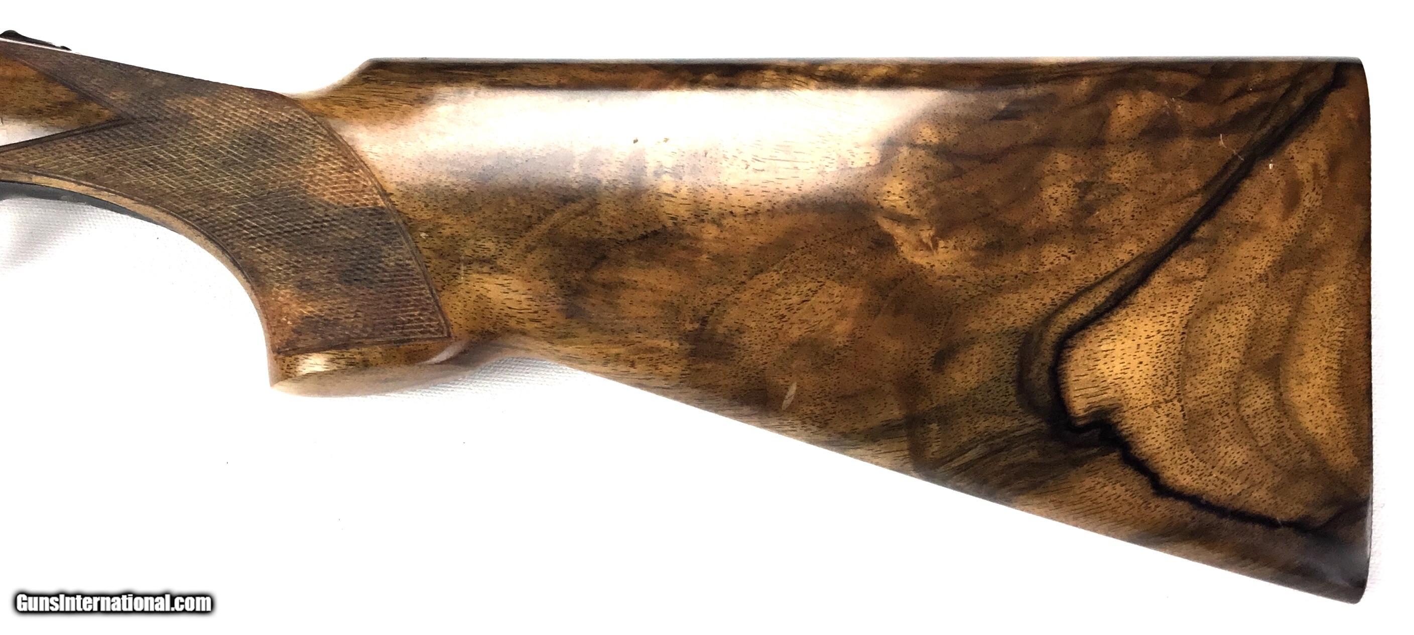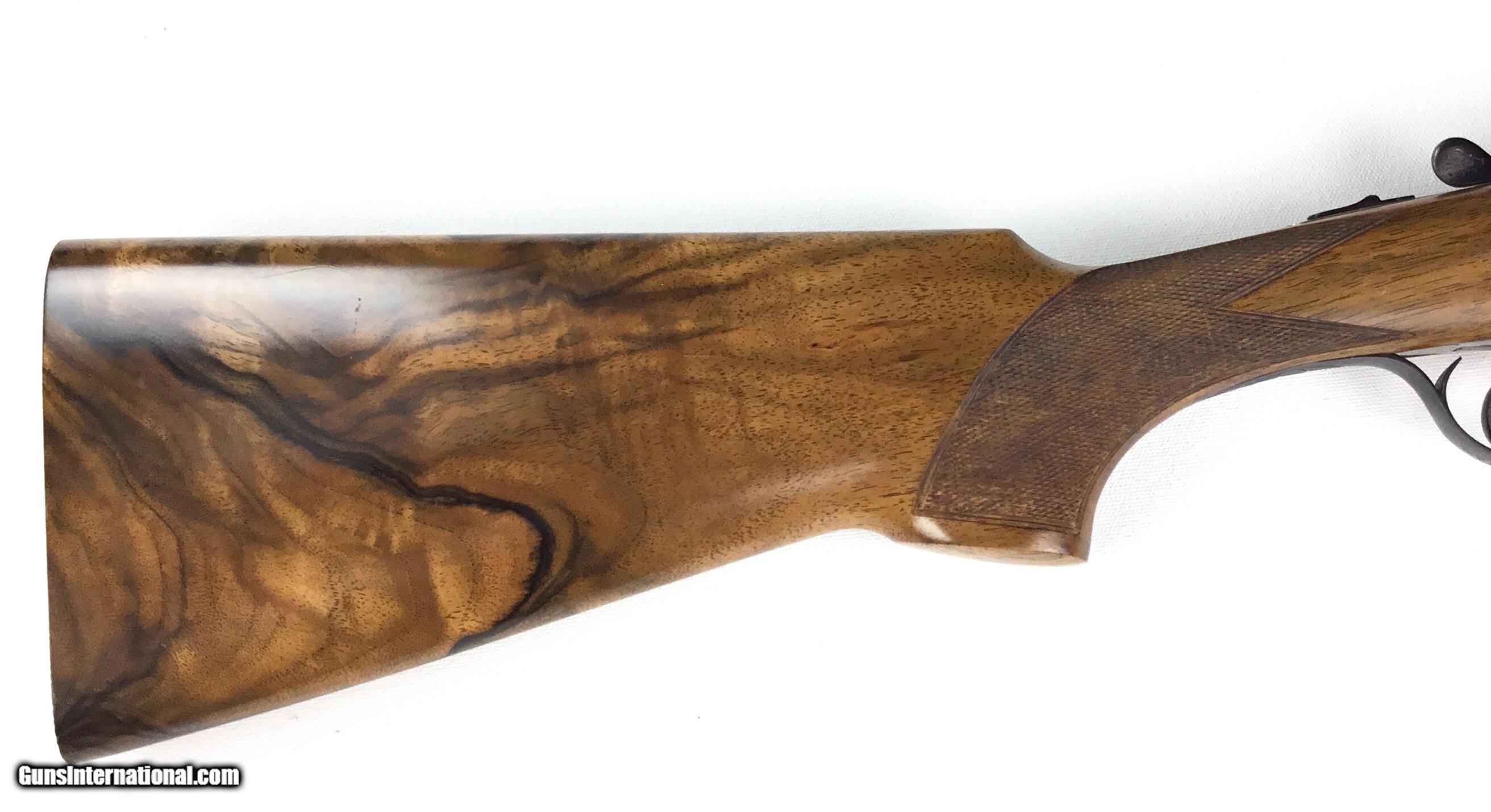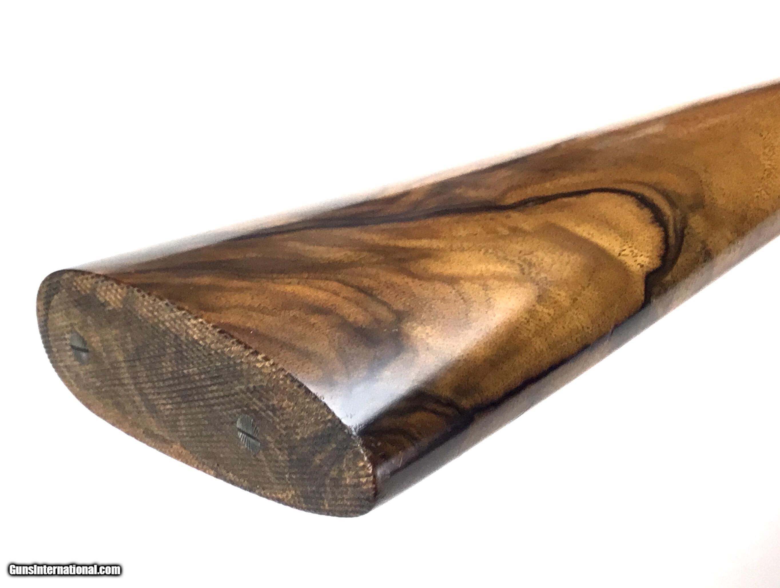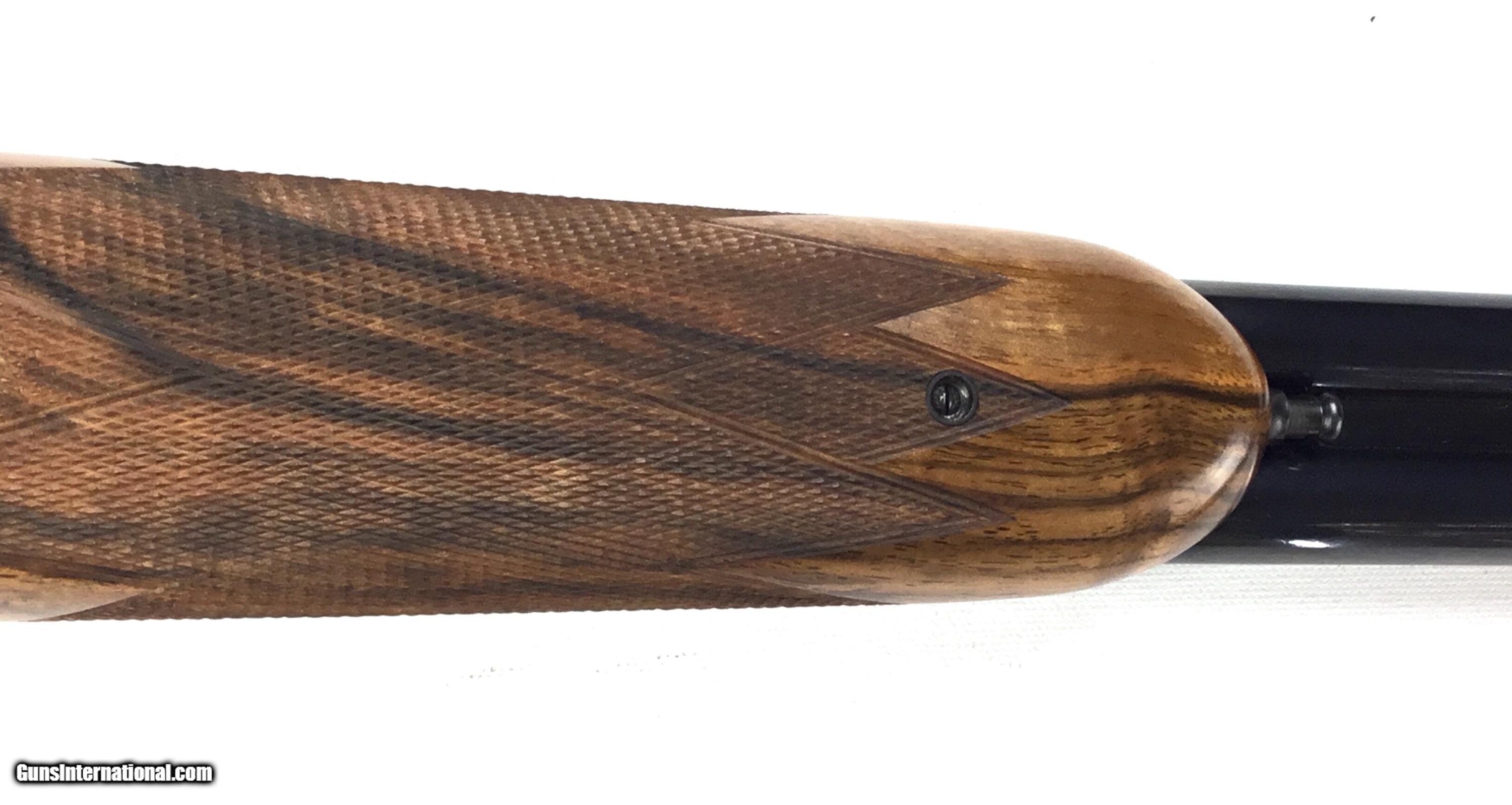 Description: V. BERNADELLI UBERTO FSE SXS 20 GAUGE, Highly Figured Semi-Pistol Grip Stock with Flat Knob Over Checkered Wooden Butt, Checkered Beavertail Forearm, Coin Finish Receiver with Game Scene Engraving, Single Non-Selective Trigger, Automatic Safety, Ejectors, 25 1/2” Bbls with Concave Filed Rib, 2 3/4” or 3” Chambers Choked IC and Mod, Weight 5 lbs. 12.4 oz., LOP: 14 1/4”, Drop Comb: 1 3/8”, Drop Face: 1 7/8”, Drop Heel: 2 5/16” Cast Face 1/8” Off, Cast Heel: 1/4” Off, Leather Hard Case, Light Handling Marks on Stock, Condition Overall Excellent, This is an Absolutely Magnificent Grouse and Woodcock Shotgun, Manufactured in Gardonne Italy, SN-199560, #2803, $2,295.00, HAMPELSGUNCO SINCE 1919. SOLD |