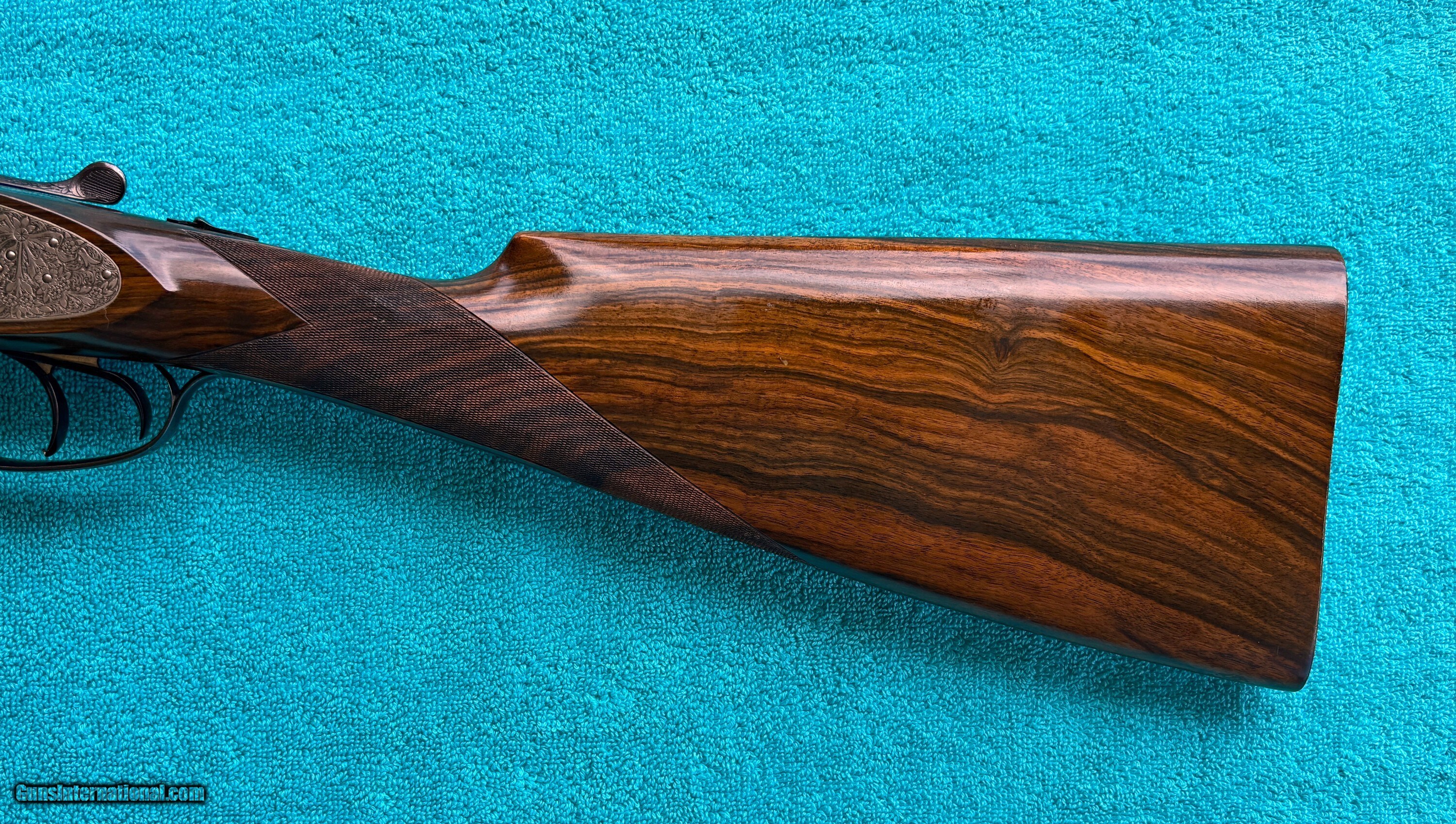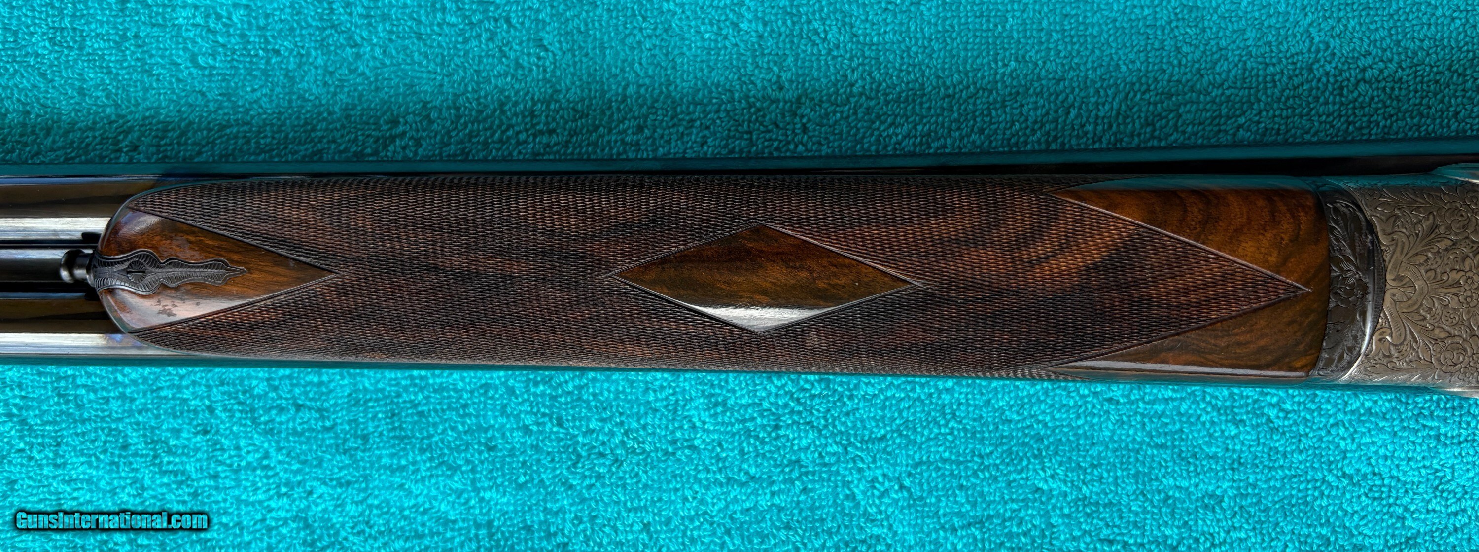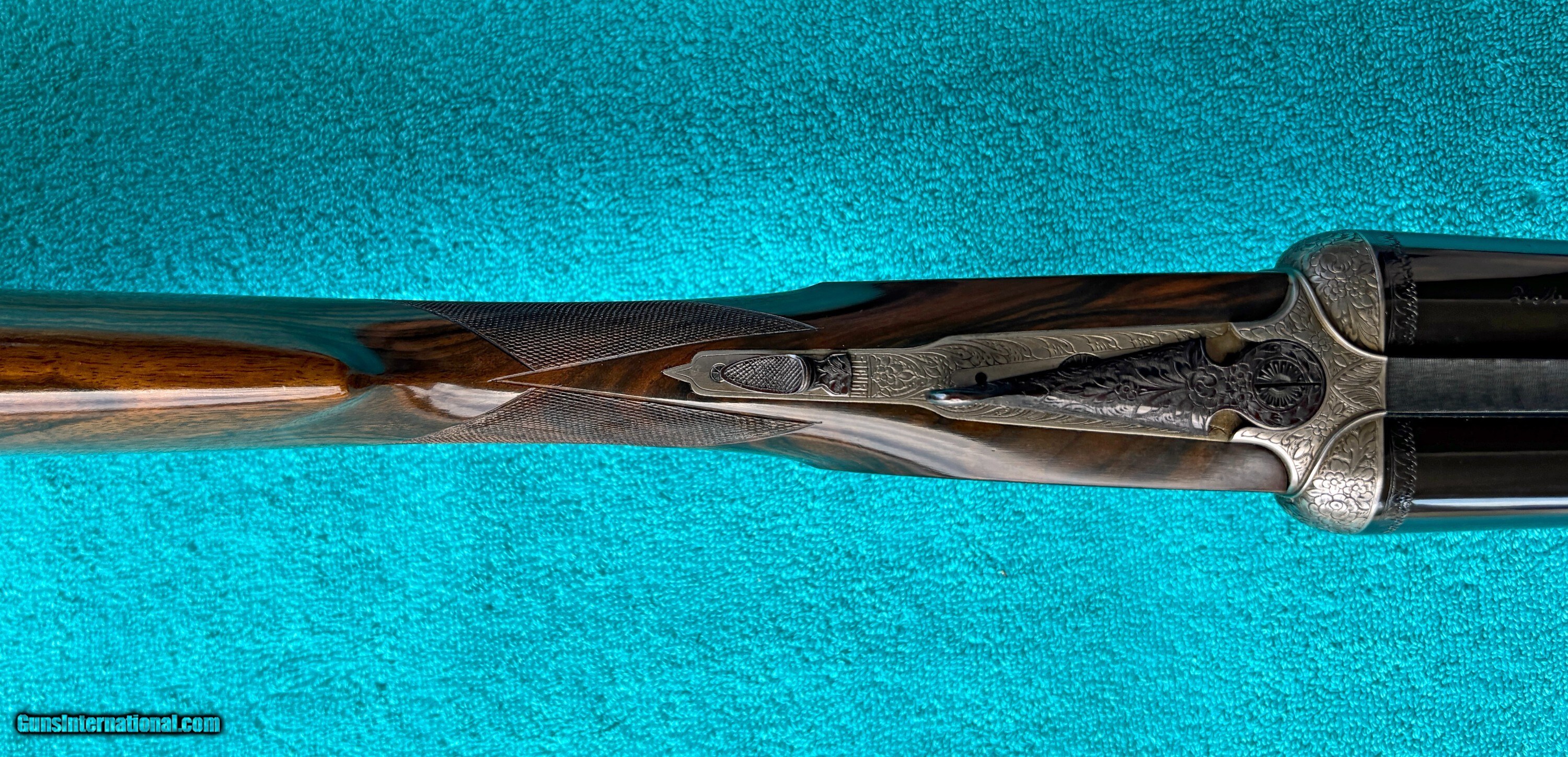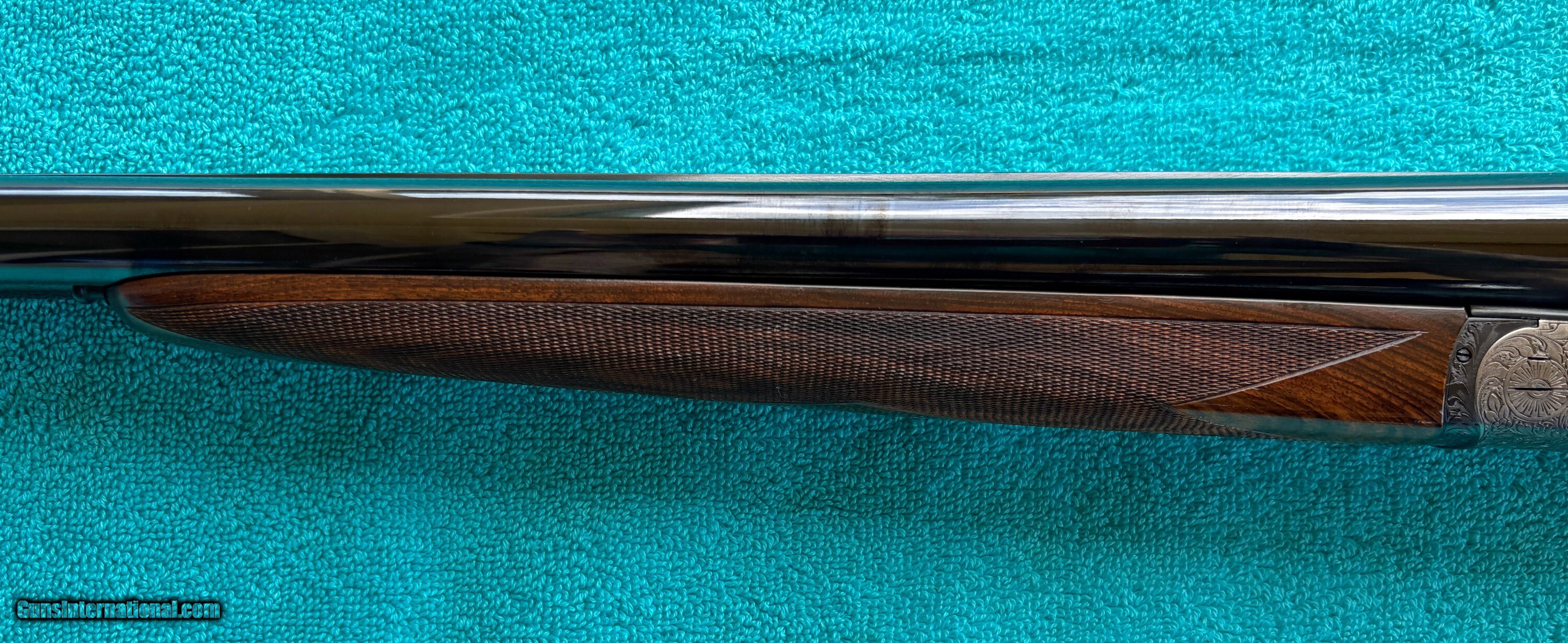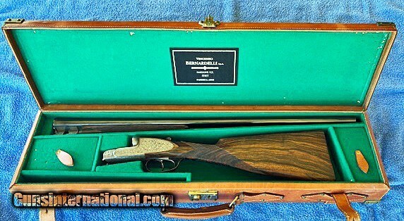 Description: V. Bernardelli Holland VB Extra SLE, Best Gun 12 Ga 28” bls 3” F/M, with leather case Engraved by Gianfranco Pedersoli, 1984 99% VERY RARE (Not to be confused with Pietro Bernardelli, a lower cost/quality Italian gumaker with similar name). V.Bernardelli’s Holland VB Extra is a handmade top-of-the-line sidelock side-by-side, an improved H&H Royal sidelock with more bells and whistles than H&H Royals and arguably equal in quality. This gun is featured with a 33 minute video at rogerrule, on YouTube, Special Guns with Roger Rule, Episode 40. A true handmade H&H 7-pin sidelock ejector action, that locks up with a Purdey triple compass turn lock (triple bolt) instead of the traditional double underlug (like H&H). It is engraved by the late great superstar* Gianfranco Pedersoli with his della robbia style that became his signature. Description: 12 guage, 3” chambers, choked M (.022) and XF (.042), 28” chopper-lump barrels (both bores measure .723) with grooved and finely arabesque rib and small silver front bead, built with the traditional classic English pattern -- straight-hand grip and splinter forearm (10 inches) –articulated front trigger and coin-finished receiver. Quality Features: This Holland VB Extra has all highest quality features: chopper-lump barrels, H&H high-grade double seared 7-pin sidelocks, H&H Southgate ejectors, integral bridles, H&H double safety sears, bushed strikers (with engraved locking screws), gas escape valves, cocking indicators, beaded fences, and a manual safety. The top lever is serrated for either hand. In addition to the two locking screws for the bushed strikers, there are five more: each side of the sidelock action screw, the front locking lug, and inside of the forearm iron… seven total. Notice also how the upper tang and the two-screw-down lower tang are designed with stepped-down points inlayed perfectly into the surrounding wood (best-gun only quality). Rub your finger over the area and you can’t detect where the metal ends and the wood starts. These are features that give away that this is a quality handmade gun, features generally found on Boss's, Purdey's and H&H Royals which new cost between 100K and 200K today! In fact, if the maker’s name was concealed for my inspection, I would bet heavy money that this shotgun is a F.lli Rizzini R1E, until I broke it open and see the Purdey 3rd bite which makes it more prestigious than a R1E. Like Beretta, V.Bernardelli built a large factory on the Mella River in Gardone. And like Beretta, besides their production guns made for the trades, V.Bernardelli also had a custom house that only built bespoke handmade best guns (of the highest quality of any Italian handmade gunmaker and priced similarly). Inscriptions: There are four: left barrel --”V.Bernardelli S.p.A. Gardone V.T.”; right barrel -- “Made in Italy”; and on the underside in a semi-circle bannner, ”V.Bernardelli Gardone V.T., and left of the trigger guard, the engraver’s signature, “Pedersoli.” The water table is stamped “AM” for 1984 – hard to believe looking at its 99% condition. The barrel flat is inscribed with maker’s name, serial number, proofs, logo stamp, “3” for chamber and “12” for gauge. Engraving: From the book, The Italian Gun, the authors state the Holland VB Extra features “Holland-style bouquet and scroll engraving on a coin-finished receiver,” buyer’s choice of either floral and scroll engraving or game-scene. A close examination shows this gun has the finest floral, bouquet, and ribbon scrollwork as only Pedersoli would do, and signed by him. Stock: Made of outstanding 4A walnut from Turkey, its contrasting dark and light streaks look rich, and shows equally on both sides and match the forend with its delicately inlaid Anson push-button release. The point pattern hand-checkering is 32 lpi, executed flawlessly and is generous with single borders wrapping around the forearm broken up with a diamond field. The pattern comes together surrounding the lower tang inlay with artistic detail. Finish: The pleasing walnut figure and great color contrasts stunningly with the clean polished coin-finished frame and deep rust blue barrels. The stock is finished with a hand-rubbed oil finish. Measurements: Dimensions are for modern shooters, 1 3/16” x 1 3/4” x 14 5/8" front trigger to checkered butt with neutral cast. Weight 7 lbs 7 oz. Includes maker’s leather trunk case and accessories. Condition: Near Mint: Although built in 1984, this gun has not been used and is 99.9% condition with the original case. Price: $ 12,450.00 Seller is the author of The Rifleman’s Rifle (Winchester pre-64 Model 70s), is liquidating his collection and will furnish a Letter of Provenance that this gun is from his collection. Please check out author’s feedback on ebay under rcrwin70roger. 3-day non-firing inspection for full refund, buyer contributes $100 shipping to buyer’s FFL, payment by MO, certified check, wire transfer or personal check with wait for validation. For questions, call (808) 989-1863 and ask for Roger. About the Engraver, Gianfranco Pedersoli September 7, 1946 -- July 24, 2021. From his published obituary: “At the age of 14 (1960), possessing good drawing skills, he abandoned his studies to devote himself fully to his art and began an internship with Master Engraver Giulio Timpini, who immediately became aware of his great talent. Eventually, Pedersoli created work on commission for clients that left him total freedom both for choice of subject and for his choice of themes. After each specific creation was developed, it was never repeated. Each work became unique. He is considered one of the most important engravers both nationally and internationally. In 2007, Blue Book Publications, Inc., produced a beautiful book entitled Gianfranco Pedersoli Master Engraver authored by Dag Sundeth about the man and his engraving art with magical photographs. Gianfranco Pedersoli’s