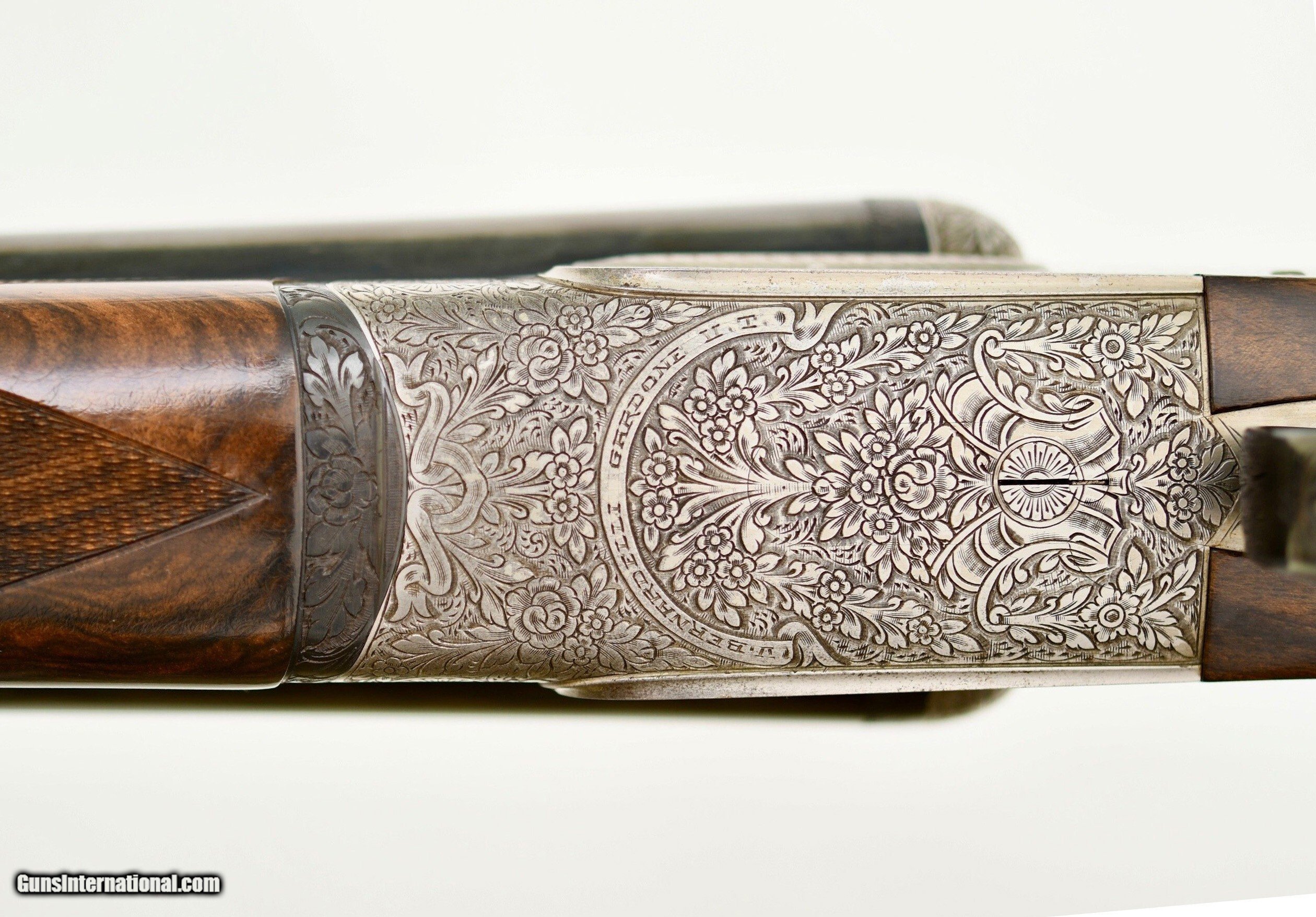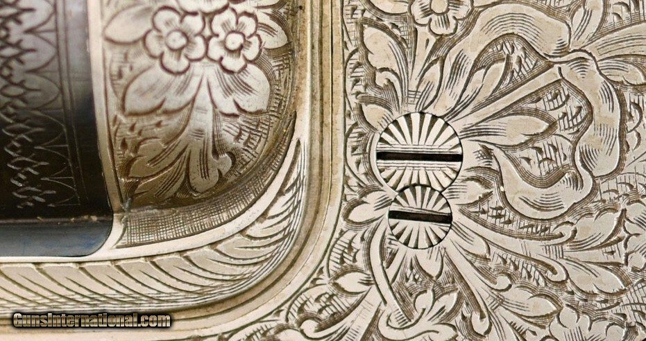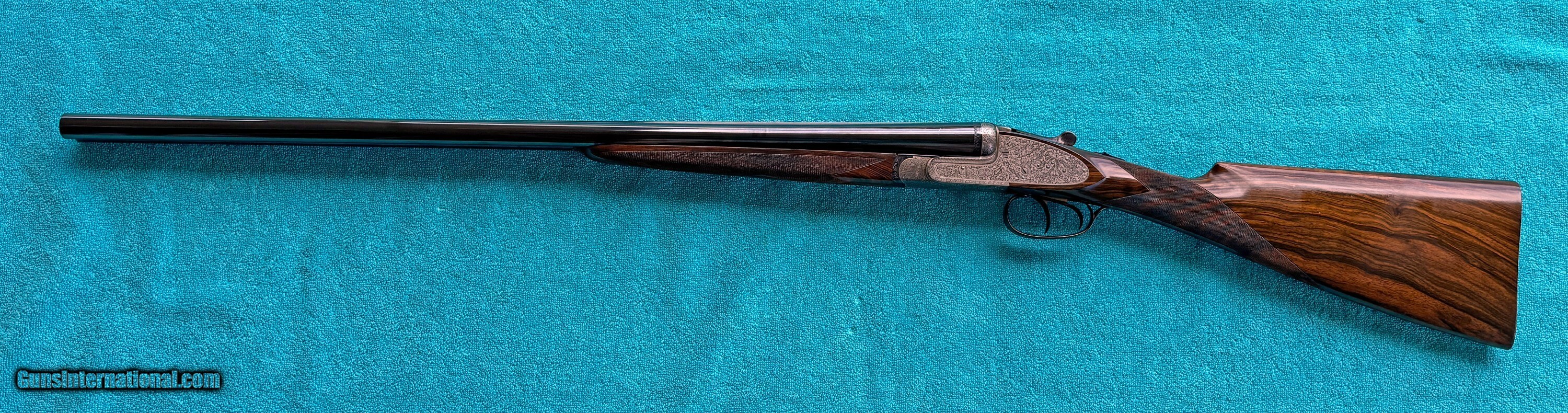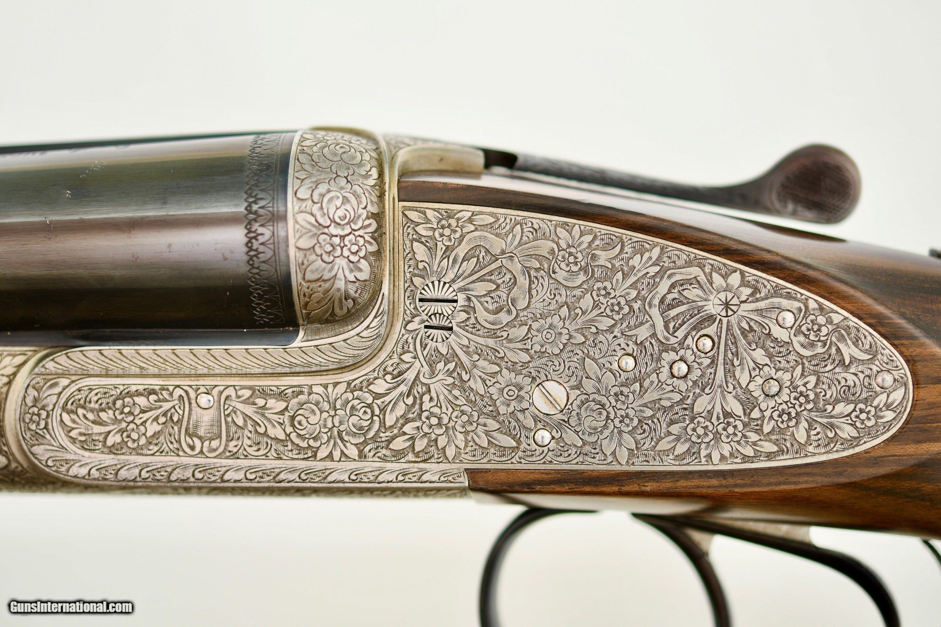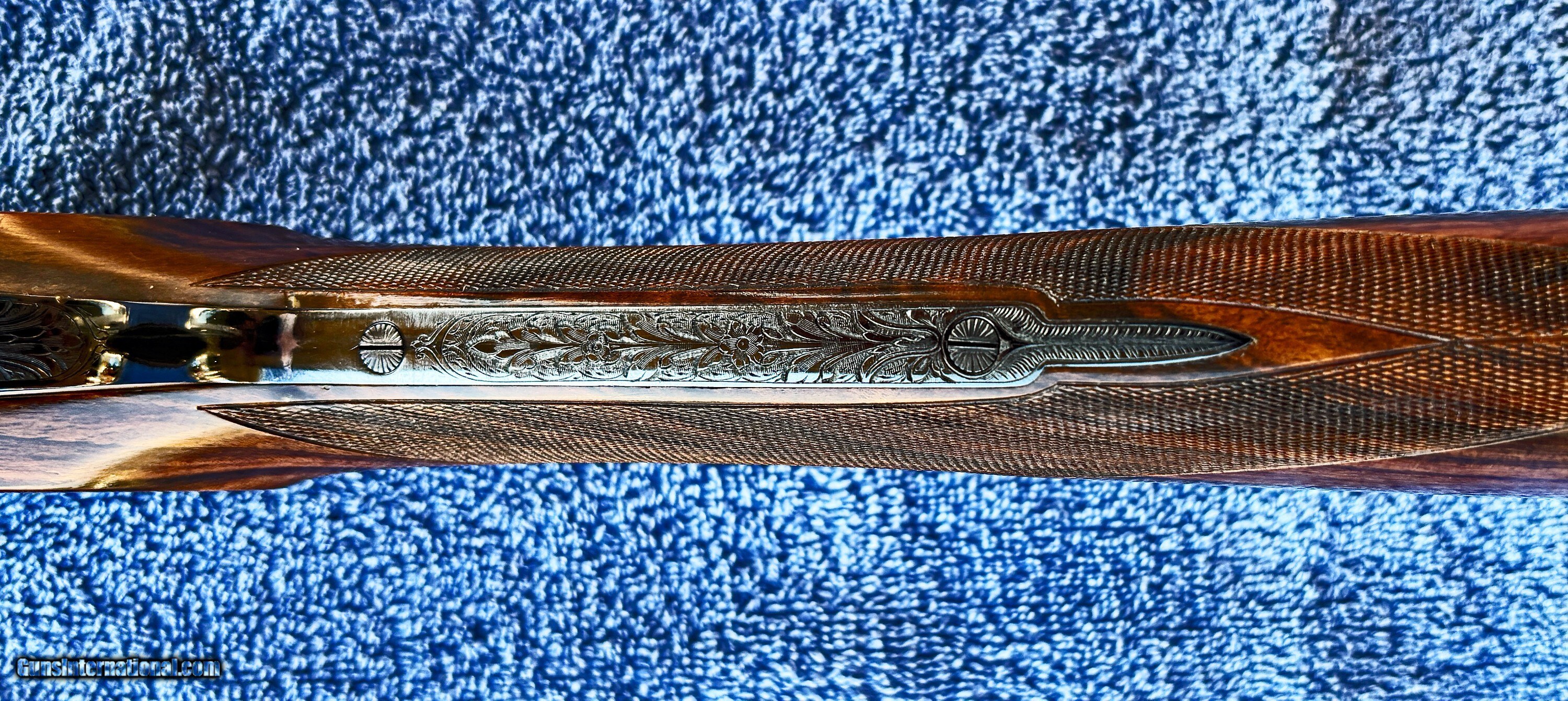 Description: V. Bernardelli Holland VB Extra SLE, Best Gun 12 Ga 28” bls 3” F/M, with leather case Engraved by Gianfranco Pedersoli, 1984 99% VERY RARE (Not to be confused with Pietro Bernardelli, a lower cost/quality Italian gumaker with similar name). V.Bernardelli’s Holland VB Extra is a handmade top-of-the-line sidelock side-by-side, an improved H&H Royal sidelock with more bells and whistles than H&H Royals and arguably equal in quality. This gun is featured with a 33 minute video at rogerrule, on YouTube, Special Guns with Roger Rule, Episode 40. A true handmade H&H 7-pin sidelock ejector action, that locks up with a Purdey triple compass turn lock (triple bolt) instead of the traditional double underlug (like H&H). It is engraved by the late great superstar* Gianfranco Pedersoli with his della robbia style that became his signature. Description: 12 guage, 3” chambers, choked M (.022) and XF (.042), 28” chopper-lump barrels (both bores measure .723) with grooved and finely arabesque rib and small silver front bead, built with the traditional classic English pattern -- straight-hand grip and splinter forearm (10 inches) –articulated front trigger and coin-finished receiver. Quality Features: This Holland VB Extra has all highest quality features: chopper-lump barrels, H&H high-grade double seared 7-pin sidelocks, H&H Southgate ejectors, integral bridles, H&H double safety sears, bushed strikers (with engraved locking screws), gas escape valves, cocking indicators, beaded fences, and a manual safety. The top lever is serrated for either hand. In addition to the two locking screws for the bushed strikers, there are five more: each side of the sidelock action screw, the front locking lug, and inside of the forearm iron… seven total. Notice also how the upper tang and the two-screw-down lower tang are designed with stepped-down points inlayed perfectly into the surrounding wood (best-gun only quality). Rub your finger over the area and you can’t detect where the metal ends and the wood starts. These are features that give away that this is a quality handmade gun, features generally found on Boss's, Purdey's and H&H Royals which new cost between 100K and 200K today! In fact, if the maker’s name was concealed for my inspection, I would bet heavy money that this shotgun is a F.lli Rizzini R1E, until I broke it open and see the Purdey 3rd bite which makes it more prestigious than a R1E. Like Beretta, V.Bernardelli built a large factory on the Mella River in Gardone. And like Beretta, besides their production guns made for the trades, V.Bernardelli also had a custom house that only built bespoke handmade best guns (of the highest quality of any Italian handmade gunmaker and priced similarly). Inscriptions: There are four: left barrel --”V.Bernardelli S.p.A. Gardone V.T.”; right barrel -- “Made in Italy”; and on the underside in a semi-circle bannner, ”V.Bernardelli Gardone V.T., and left of the trigger guard, the engraver’s signature, “Pedersoli.” The water table is stamped “AM” for 1984 – hard to believe looking at its 99% condition. The barrel flat is inscribed with maker’s name, serial number, proofs, logo stamp, “3” for chamber and “12” for gauge. Engraving: From the book, The Italian Gun, the authors state the Holland VB Extra features “Holland-style bouquet and scroll engraving on a coin-finished receiver,” buyer’s choice of either floral and scroll engraving or game-scene. A close examination shows this gun has the finest floral, bouquet, and ribbon scrollwork as only Pedersoli would do, and signed by him. Stock: Made of outstanding 4A walnut from Turkey, its contrasting dark and light streaks look rich, and shows equally on both sides and match the forend with its delicately inlaid Anson push-button release. The point pattern hand-checkering is 32 lpi, executed flawlessly and is generous with single borders wrapping around the forearm broken up with a diamond field. The pattern comes together surrounding the lower tang inlay with artistic detail. Finish: The pleasing walnut figure and great color contrasts stunningly with the clean polished coin-finished frame and deep rust blue barrels. The stock is finished with a hand-rubbed oil finish. Measurements: Dimensions are for modern shooters, 1 3/16” x 1 3/4” x 14 5/8" front trigger to checkered butt with neutral cast. Weight 7 lbs 7 oz. Includes maker’s leather trunk case and accessories. Condition: Near Mint: Although built in 1984, this gun has not been used and is 99.9% condition with the original case. Price: $ 12,450.00 Seller is the author of The Rifleman’s Rifle (Winchester pre-64 Model 70s), is liquidating his collection and will furnish a Letter of Provenance that this gun is from his collection. Please check out author’s feedback on ebay under rcrwin70roger. 3-day non-firing inspection for full refund, buyer contributes $100 shipping to buyer’s FFL, payment by MO, certified check, wire transfer or personal check with wait for validation. For questions, call (808) 989-1863 and ask for Roger. About the Engraver, Gianfranco Pedersoli September 7, 1946 -- July 24, 2021. From his published obituary: “At the age of 14 (1960), possessing good drawing skills, he abandoned his studies to devote himself fully to his art and began an internship with Master Engraver Giulio Timpini, who immediately became aware of his great talent. Eventually, Pedersoli created work on commission for clients that left him total freedom both for choice of subject and for his choice of themes. After each specific creation was developed, it was never repeated. Each work became unique. He is considered one of the most important engravers both nationally and internationally. In 2007, Blue Book Publications, Inc., produced a beautiful book entitled Gianfranco Pedersoli Master Engraver authored by Dag Sundeth about the man and his engraving art with magical photographs. Gianfranco Pedersoli’s