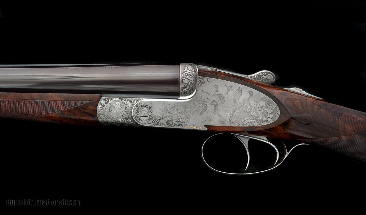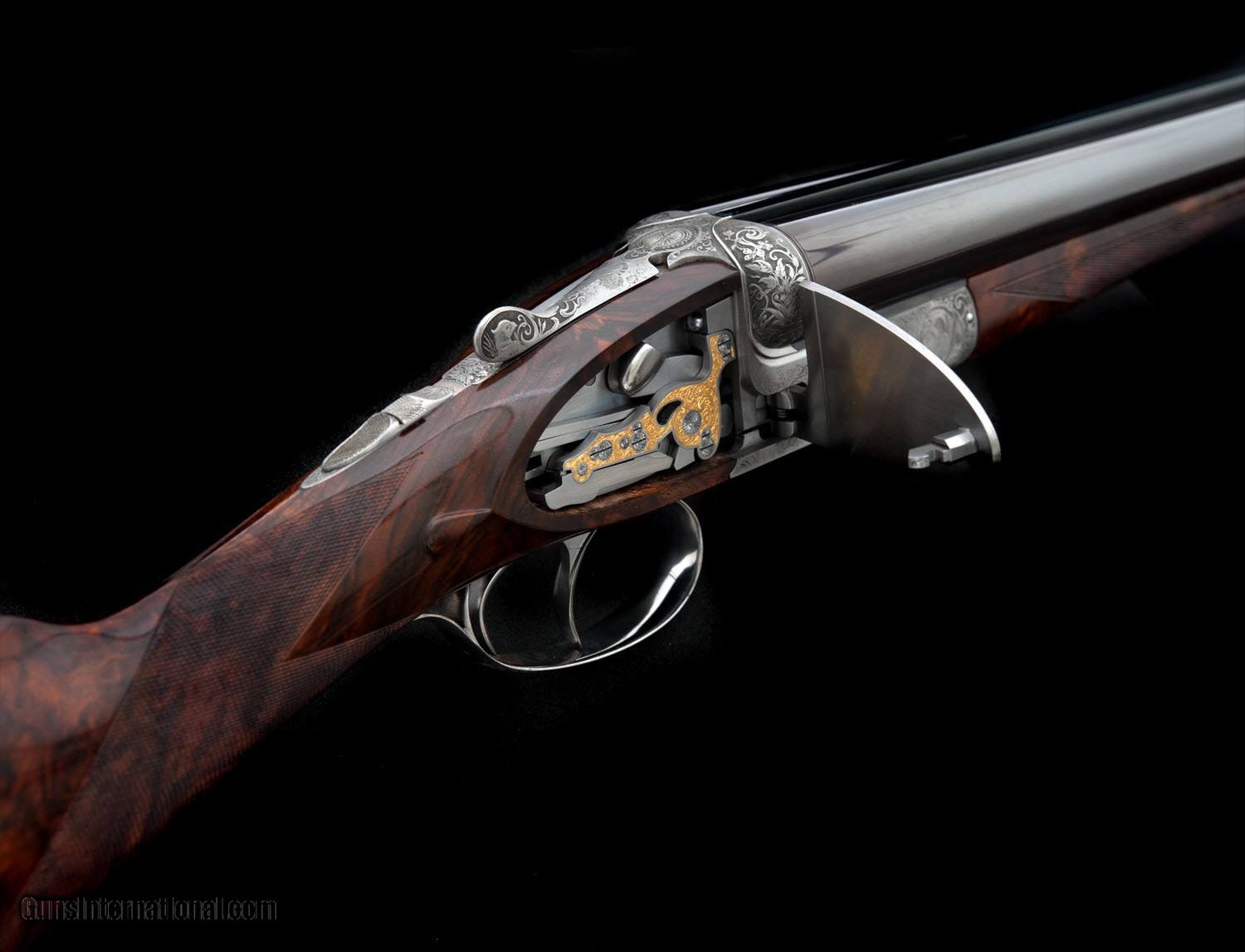Description: F.lli Bertuzzi - Ala di Gabbiano - 12 ga - Item Number: BER6021.1 Shotgun type: SxS Action: Pinless Sidelock Ejectors: Yes Trigger: Double Grip: Straight Grip Forend: Checkered Lop: 14 3/4 " Pad thickness: " Type of butt: Checkered Wood Drop comb: 1 1/2 " Drop heel: 2 1/8 " Cast amount: 0 " Weight: 7 lbs, oz Manufactured in: Italy Finish: Coin & Black Overall condition: As New Stock condition: As New Metal condition: As New Stock: Original finish Metal: Original finish Type of Case: Leather Case Extra barrels: 0 Barrel info: Gauge: 12 ga Chamber: 2 3/4 " Length: 28 " Chokes: Full Mod Rib type: Concave Comments : Needless to say work of this quality and rarity did and does not come cheap. Each new Bertuzzi Ala di Gabbiano (Gullwing) was usually spoken for long before completion. One of only 12 that will ever be produced. This stunning example is engraved by one of the masters of Italian Bulino engraving, Gianfranco Pedersoli. Visit us at Hudson Farm, even if just to view this unique piece of artistry and mechanical genius. SG-115 SOLD |