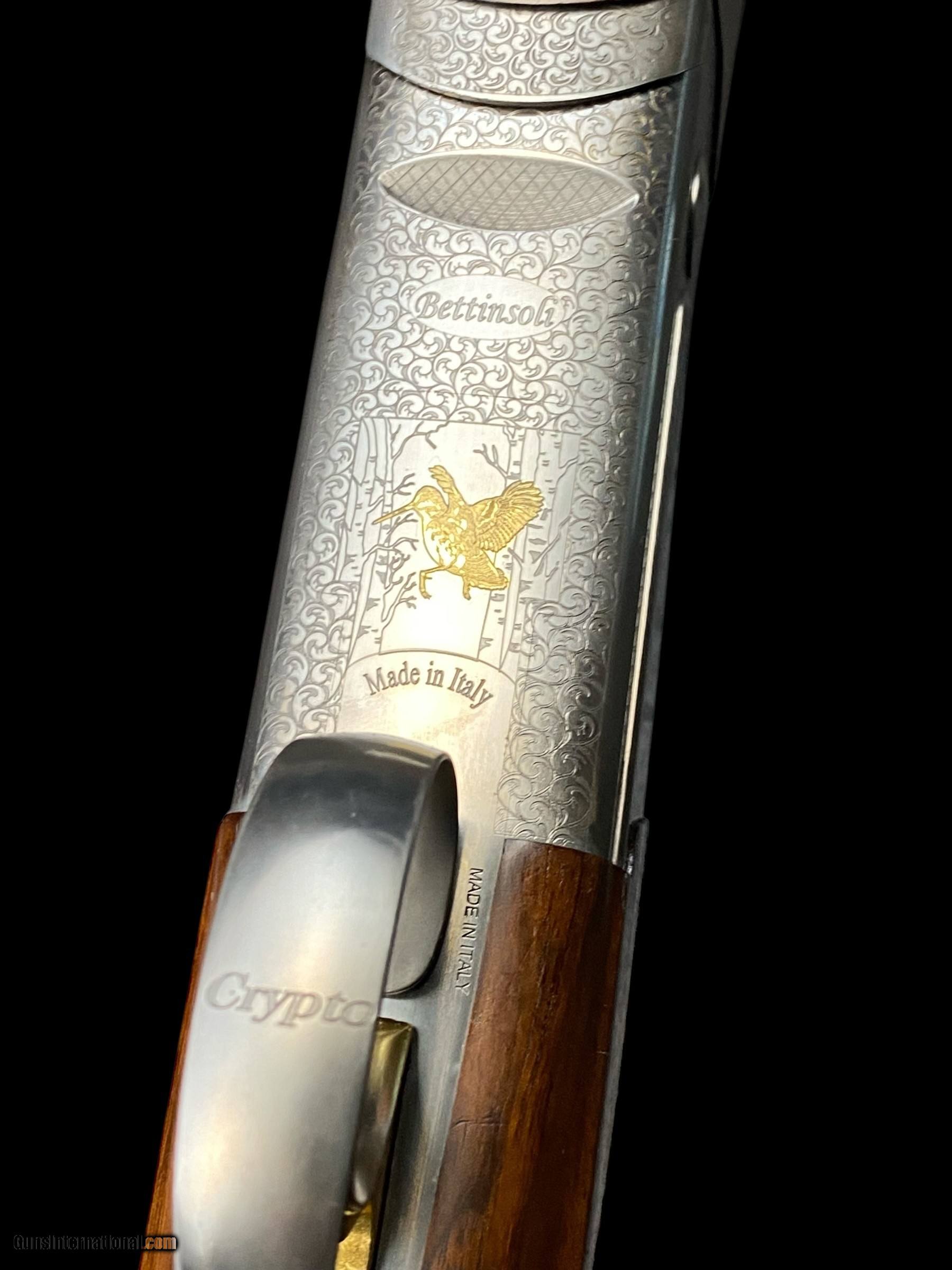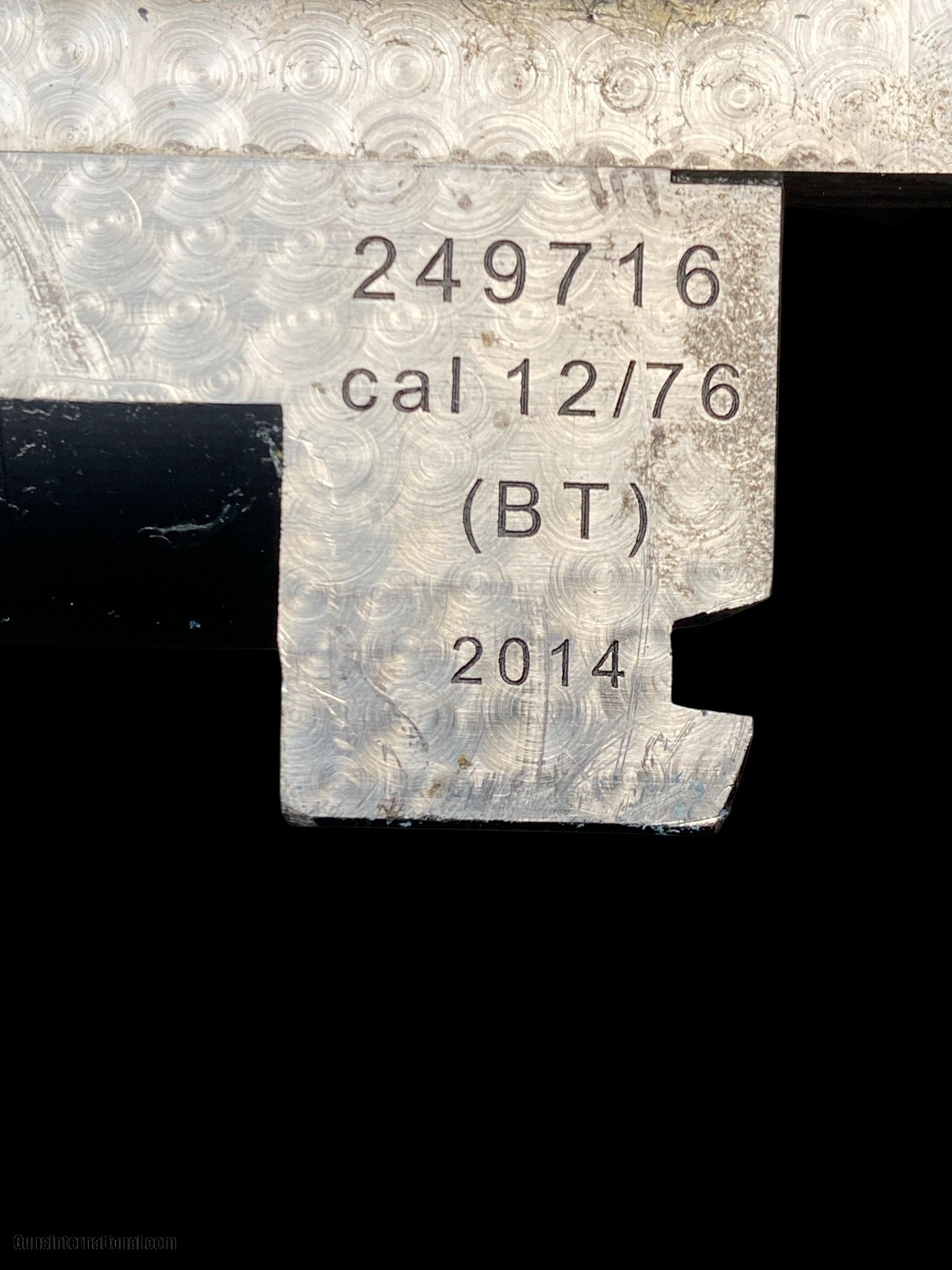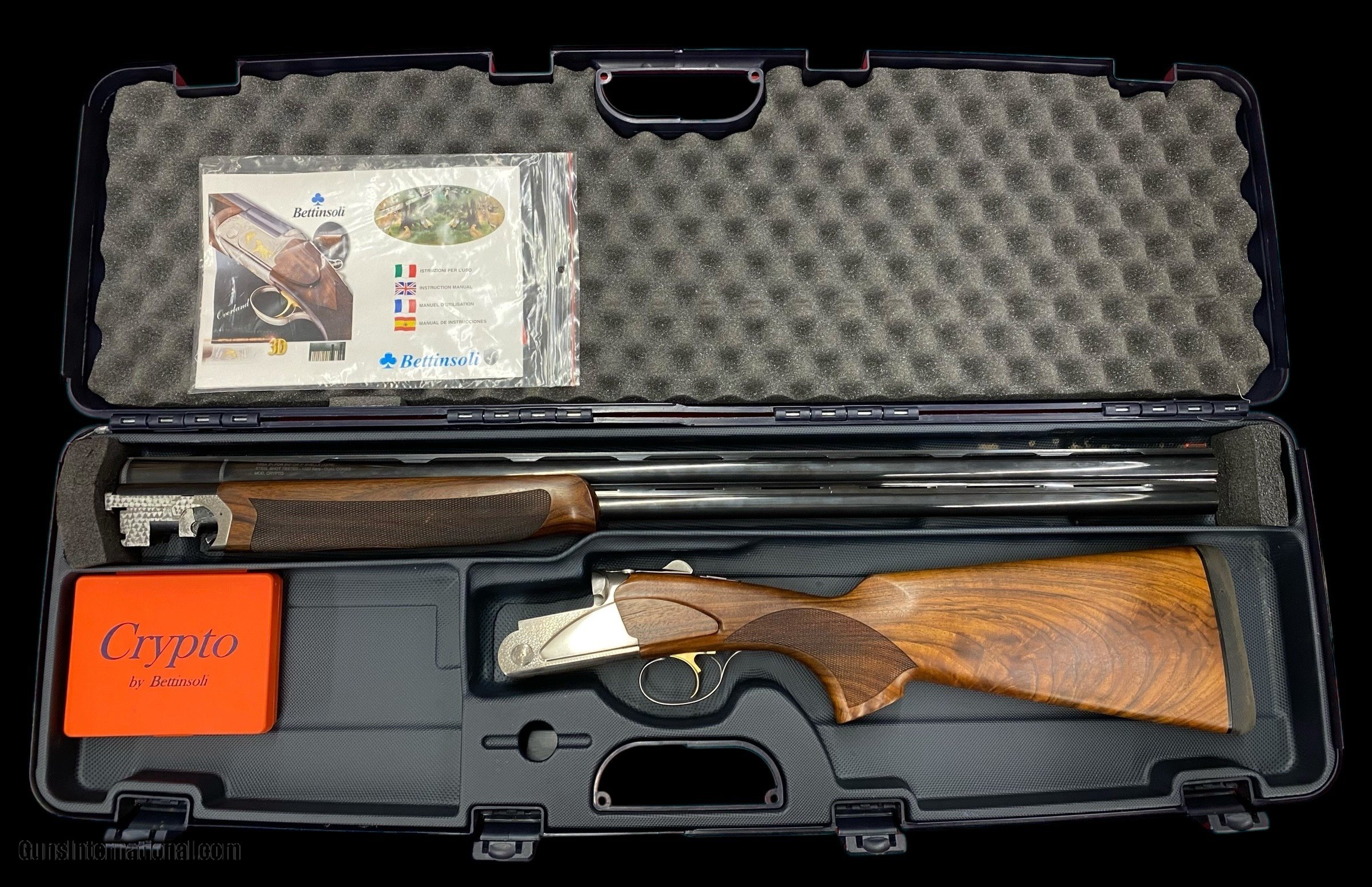 Description: BETTINSOLI - ITALY - MFG 2014 MODEL: CRYPTO O/U SHOTGUN - 30" VENT RIB AND VENT MID-RIB HIGH GLOSS BLUE BARRELS W/ MULTICHOKE SYSTEM - CIP STEEL PROOFS BEAUTIFUL SCROLL AND GAME SCENE ENGRAVED W/ GOLD WOODCOCK ON ACTION BOTTOM SINGLE SELECTIVE GOLD TRIGGER EJECTORS FANTASTIC TURKISH WALNUT FIGURED PISTOL GRIP STOCK W/ SOLID BLACK RUBBER PAD DIMS: LOP: 14 3/4" | DAC: 1 1/2" | DAH: 2 1/4" WEIGHT: 7LBS 9OZ CASED IN BETTINSOLI POLY CASE WITH MANUAL AND SPARE CHOKE TUBES / WRENCH CONDITION: GUN IS IN EXCELLENT ORIGINAL OVERALL CONDITION SHOWING VERY LIGHT SIGNS OF USE. ALL LUSTROUS BLUE REMAINS. BORES CLEAR AND BRIGHT. TRIGGER CRISP. EJECTORS STRONG AND IN-TIME. GUN LOCK-UP IS TIGHT. WOOD OIL FINISH REMAINS EXCELLENT WITH SCANT AND SUPERFICIAL MARKS. NICE GUN! GENTLEMEN, THIS IS A SOLID AND BEAUTIFULLY BUILT OVER UNDER SHOTGUN. THE WOOD IS EXCEPTIONAL. A BEAUTIFUL GUN FOR THE SPORTING CLAYS COURSE OR AFIELD. QUALITY OF THIS GUN WILL COMPETE WITH ANY COMPARABLE BERETTA, RIZZINI, CAESER GUERINI, OR ZOLI SHOTGUN. YOU WILL BE PLEASED WITH THIS FINE FIREARM! THIS WAS A TOP OF LINE MODEL IN 2014. PLEASE CALL NOW! FFL REQUIRED FLAT $50 S/H/I CARD FEE APPLIES SOLD Shotgun Gauge: 12 Gauge Manufacturer: BETTINSOLI Model: CRYPTO Serial Number: 24971x Barrel Length: 30 Chambers: 3" - 76MM Ejectors: YES Condition: EXC Metal Condition: EXC Wood Condition: EXC Bore Condition: EXC Action: BLE Triggers: SINGLE SELECTIVE Chokes: MULTI Case: YES Proof:Nitro: YES |