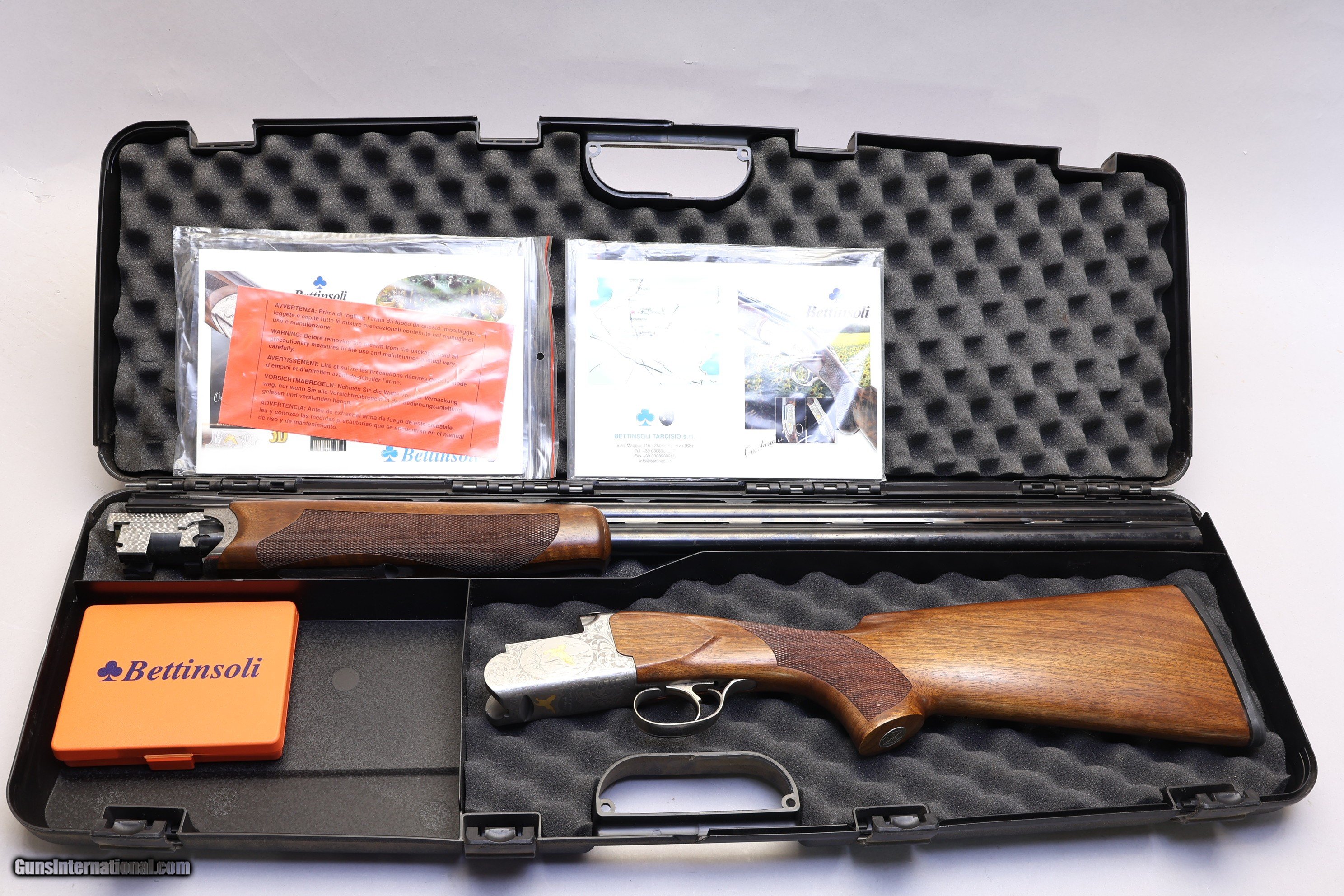 Description: 3" Chambers | Multi Choke | ABS Hard Case | Good Condition Bettinsoli Diamond X Grade Over/Under in 12 Ga, an Italian-made shotgun built for reliable performance with solid construction and smooth handling. It has a wood stock with a comfortable pistol grip and a ventilated tapered rib for a steady sight picture. Overall condition is good with clear signs of limited use. The stock shows crisp checkering and the top lever sits right, indicating minimal wear. There is a small indent on the fore-end, and the barrels show surface rust that affects appearance but not function. The action locks up tight, though slightly stiff. It comes with a universal ABS hard case, a full choke set including Improved Modified, Cylinder, Full, Improved Cylinder, and Modified, and a choke tool. Made in 2008 in Italy.