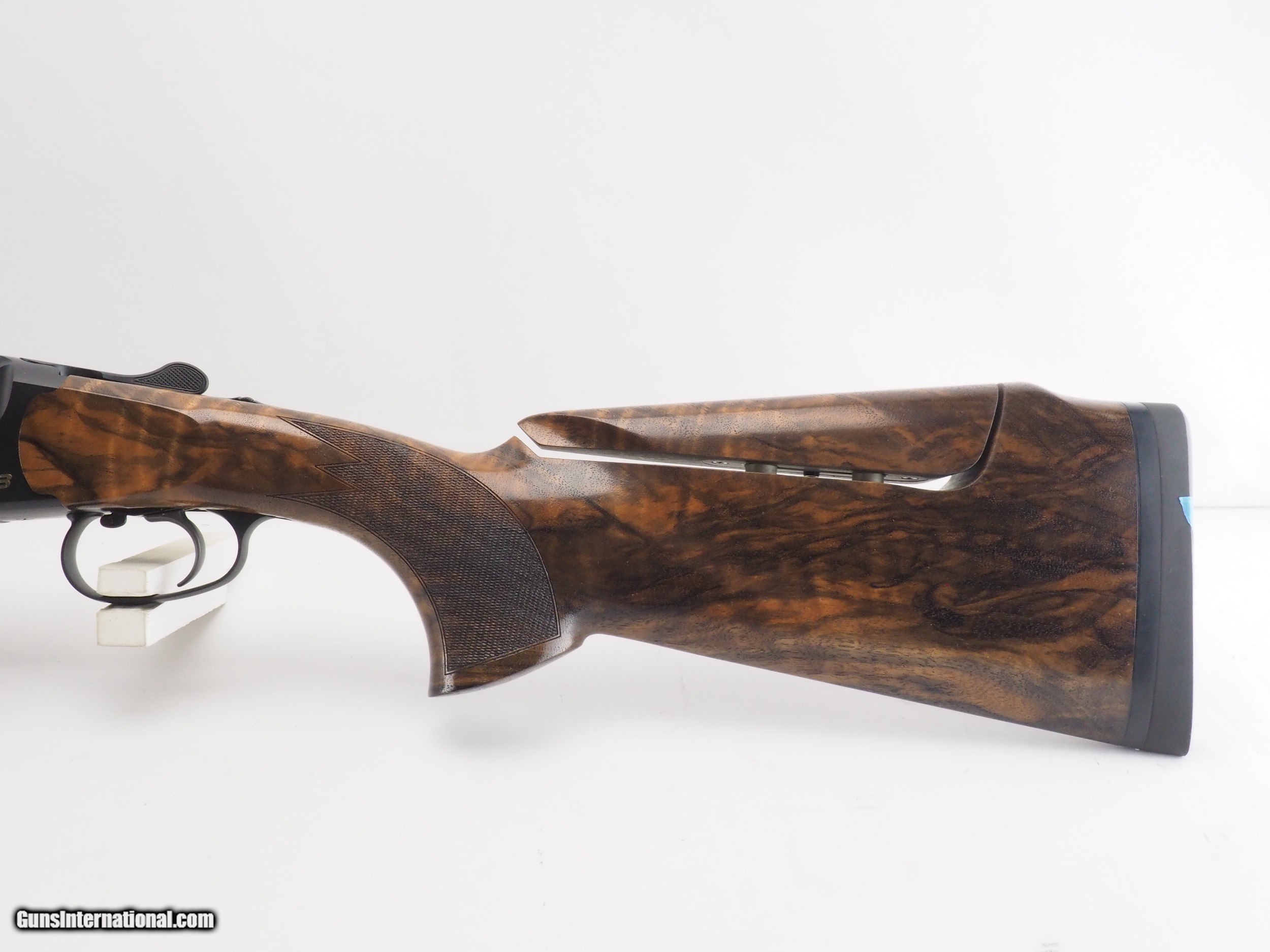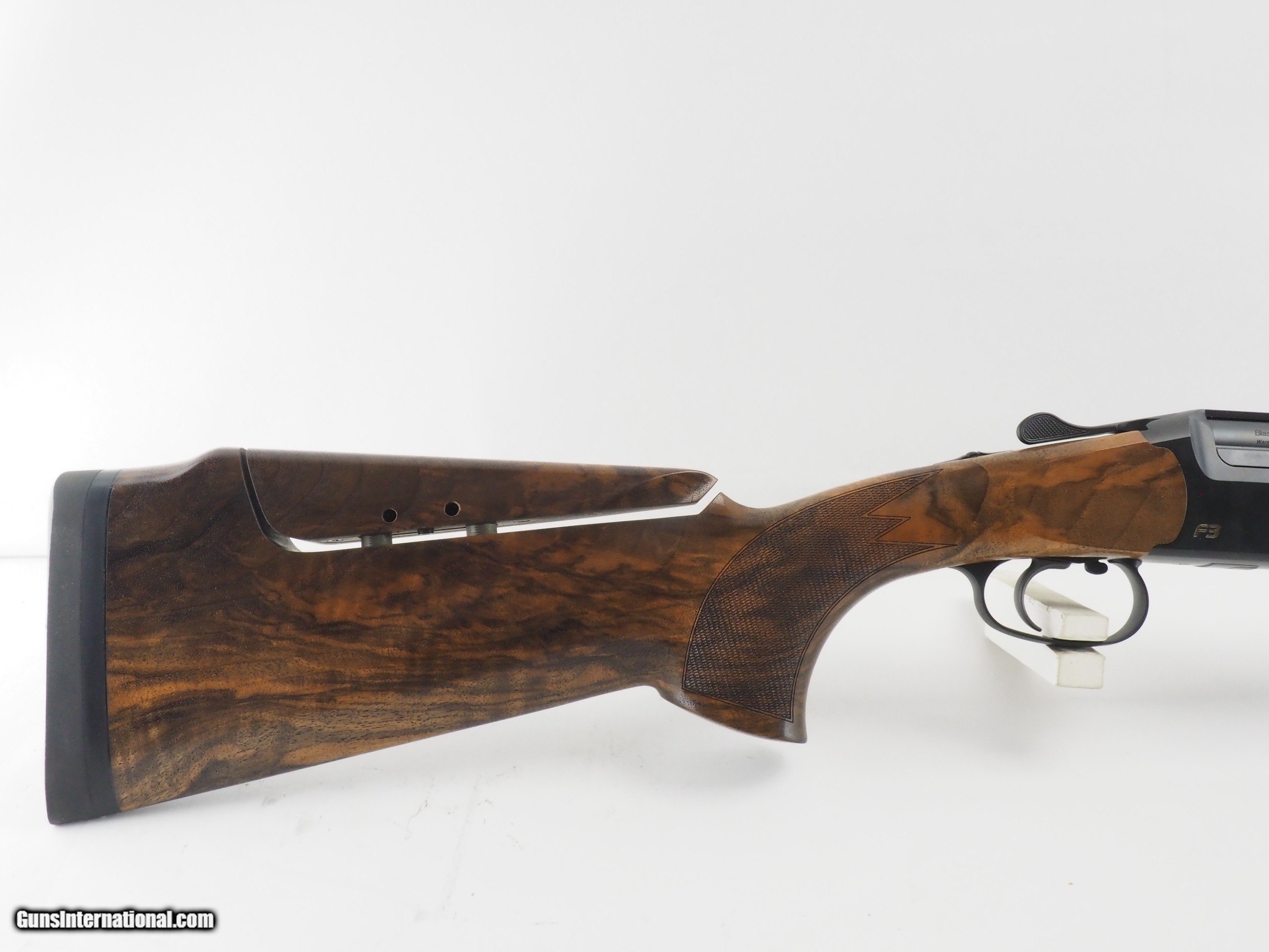 Description: This factory stock set was originally a fixed-comb unit. Factory adjustable comb hardware has been installed. As you can see, the comb gap is larger than normal. For this reason, you get Wood Grade 7 for the same price as Wood Grade 5! Functionality is the same. Blaser F3 Standard Competition Sporting with very nice Grade 7 stock with adjustable comb. We are happy to put a set of 20ga, 28ga, or .410 barrels on this gun. Just let us know what you'd like! Model: F3 Sporting Grade: Standard Wood grade: 7 Comb: adjustable Condition: new Hand: RH Barrel: 32" LOP: 14.6" DAC: 1.6" DAH: 2.1" Stock configuration: Competition Sporting Stock finish: oil Chokes: factory extended (SK, IC, LM, M, IM) Case: factory Accessories: all factory accessories (grease, chokes, weights, wrenches, paperwork, etc) Price: Call for pricing Shotgun Guage: 12 Gauge SOLD |