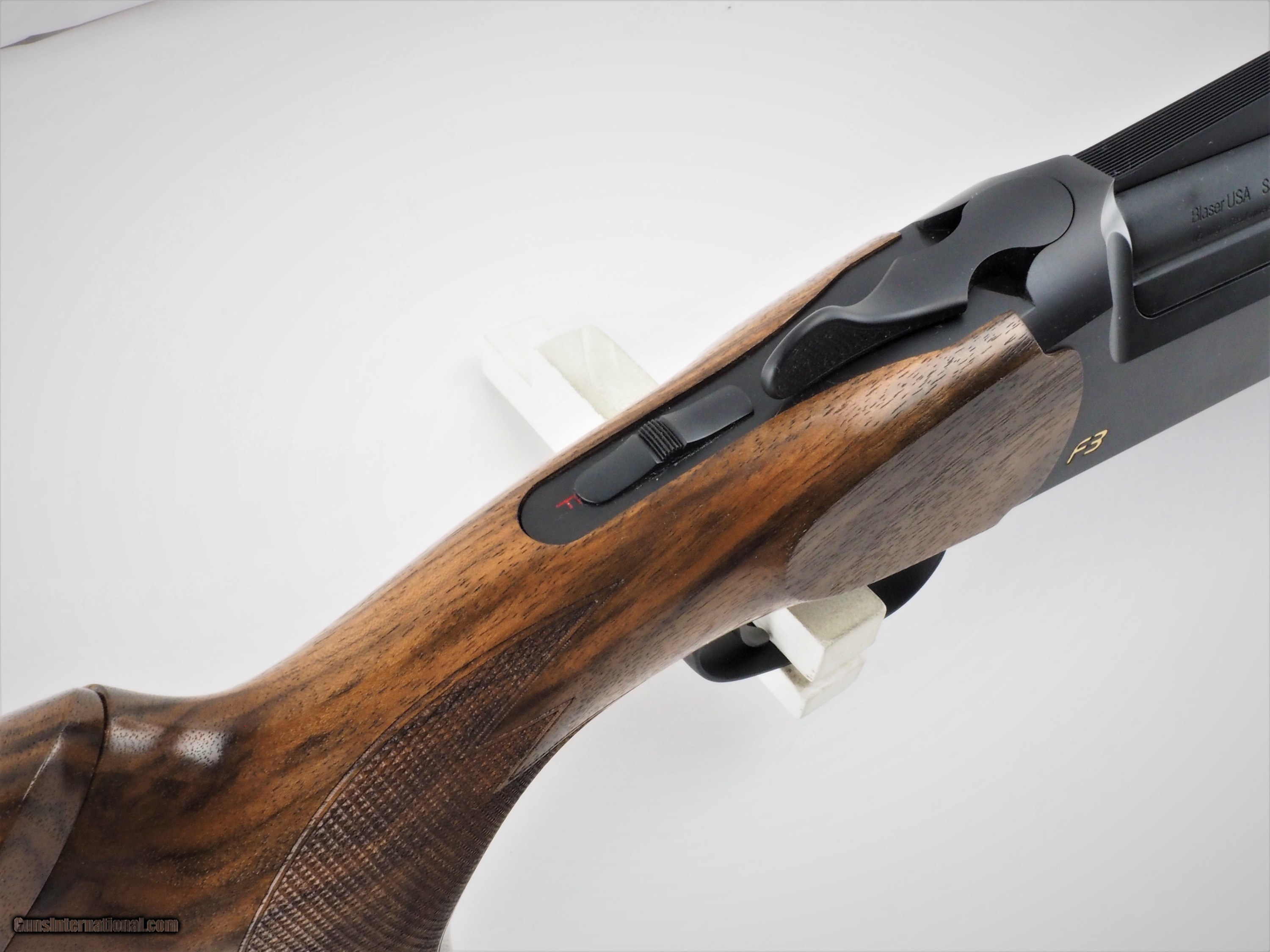 Description: The Super Sport is Blaser's fixed mid-rib configuration which allows a more heads-up stance and improved target acquisition. In addition to the F3's absurdly durable design, you have Blaser's very excellent customer service/support and gunsmith shop behind you when you purchase a Blaser product. Please do feel free to give us a call at the above phone number if you have any questions. Blaser F3 Standard Super Sport with very nice Grade ** stock with adjustable comb. We are happy to put a set of 20ga, 28ga, or .410 barrels on this gun. Just let us know what you'd like! Model: F3 Grade: Standard Wood grade: Comb: Adjustable Condition: NEW Hand: RH Barrel: 30" LOP: 14.5" DAC: 1.96" (50mm) DAH: 3.34" (85mm) DAMC: 1.85 (47mm) Stock configuration: Super Sport Stock finish: oil Chokes: factory extended (SK, IC, LM, M, IM) Case: factory Accessories: all factory accessories (grease, chokes, weights, wrenches, paperwork, etc) SOLD |