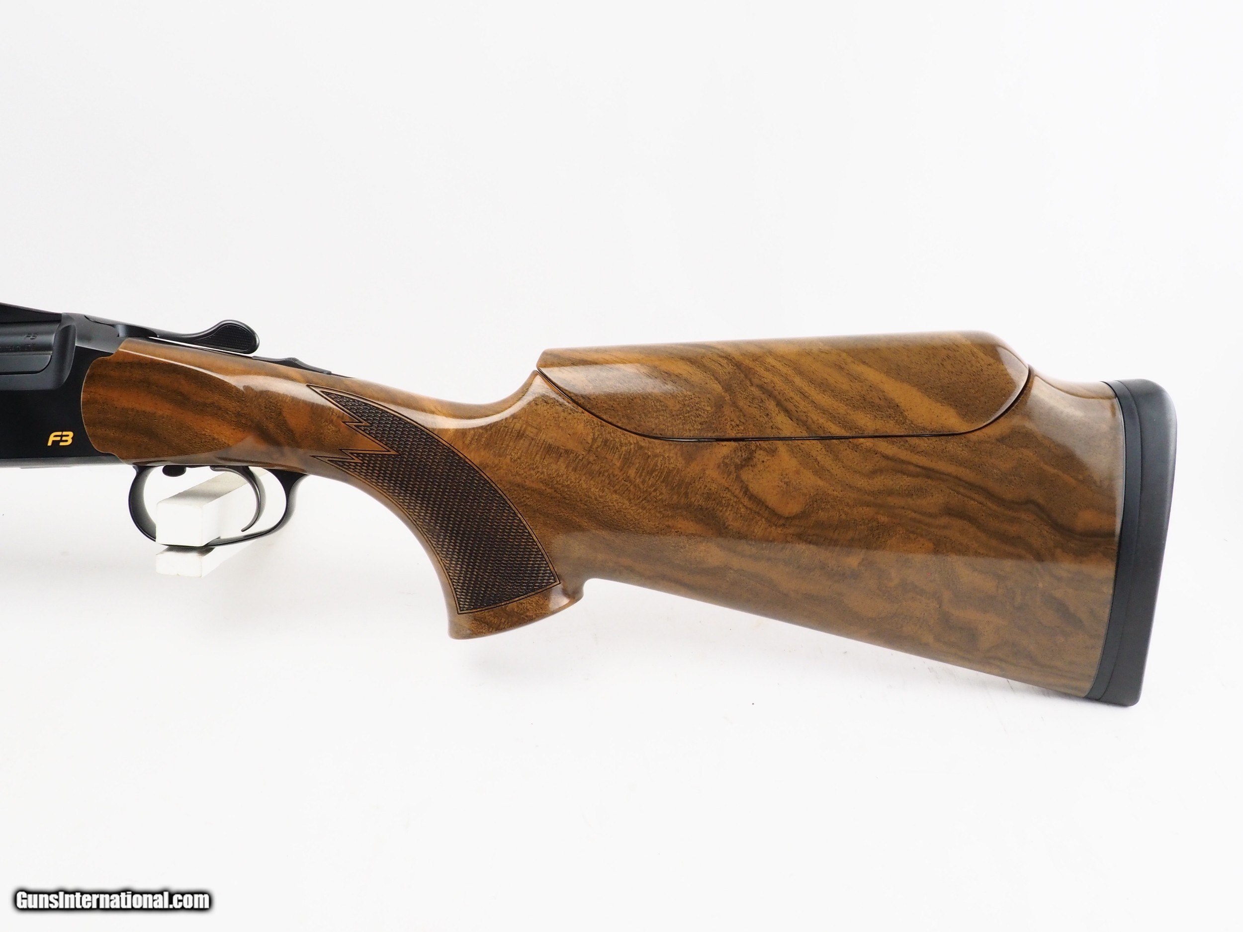 Description: Book #254. Price: $9375.00 Extremely clean F3 Super Trap combo in outstanding mechanical and aesthetic condition. Gun locks up tight, barrels have proper opening tension, top lever is well to the left, forearm is tight to barrels, and breech face and barrel faces are bright and shiny. Stock shows only a couple very tiny handling marks. Case is very clean both inside and out. Stock finish the thick poly type. Unsingle rib has the current/updated design. Make: Blaser Model: F3 Super Trap combo Grade: Standard (black receiver) Gauge: 12 Barrel length: 32" (O/U), 34" (unsingle) LOP: 14.4" Drop at comb: 1.53" Drop at Monte Carlo: 1.57" Drop at heel: 2.48" Chokes: factory IC, LM, M (x2), IM (x2), F (x2) SOLD |