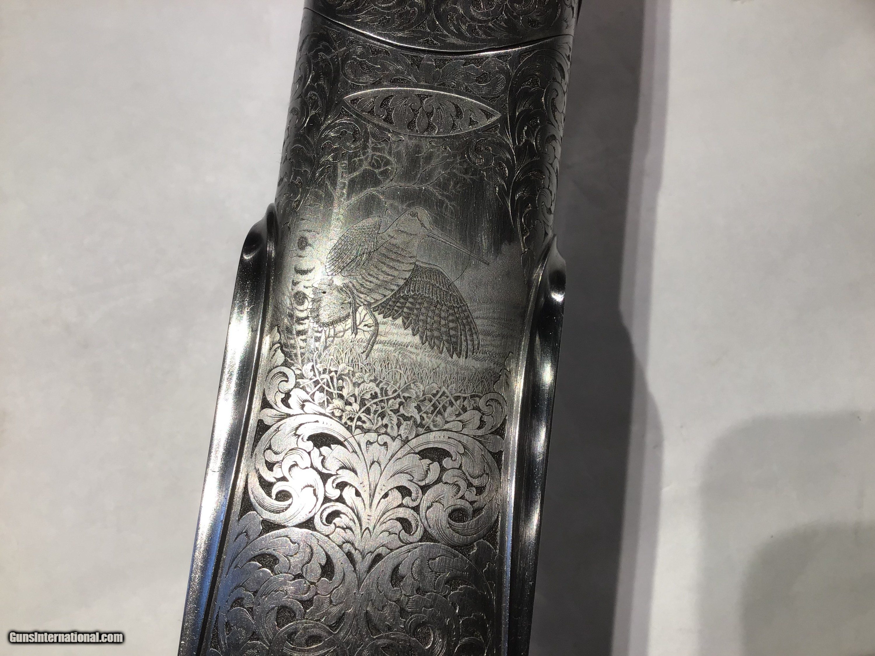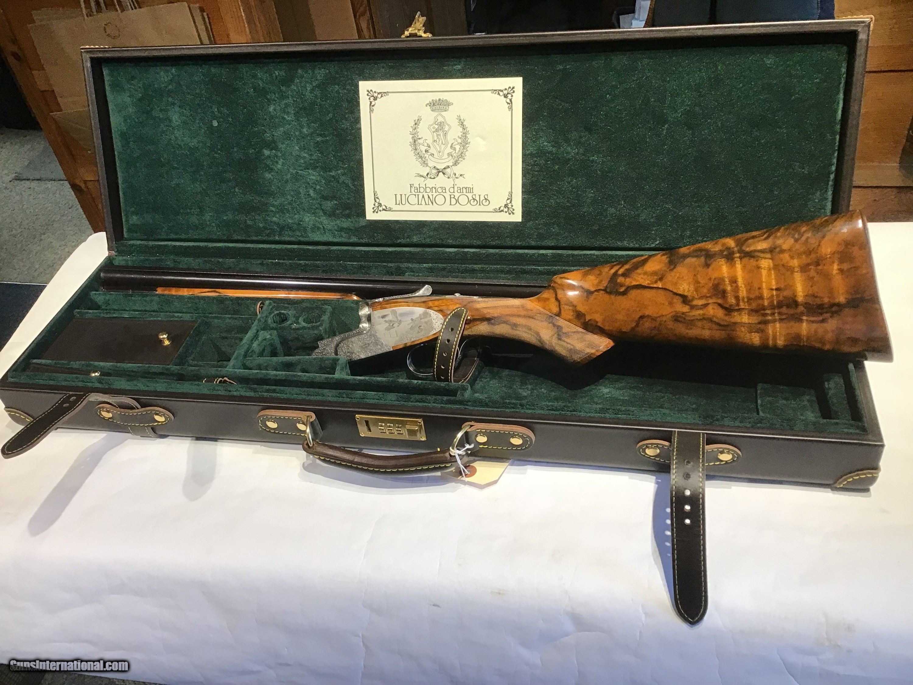 Description: Beatiful 20 gauge Bosis Michael Angelo. Engraved by Pedretti in 2012. Remains new in case. Excellent wood, expertly balanced and built. SOLD Shotgun Gauge: 20 Gauge Manufacturer: Luciano Bosis Model: Michael Angelo Serial Number: 575 Barrel Length: 29 Chambers: 2 3/4 Condition: New in Case Triggers: Single Stock Drop: 1 3/8 Stock Comb: 2 3/8 Stock Cast: 1/8 Fore End: Forend Game Butt Pad: Checkered Butt LOP: 15 Rib: Cross filed tapered game rib Weight: 6 lbs 14 oz Manufacture Date: Circa 2012 Chokes: Fixed Choke Left: IM Choke Right: Full Engraving: Pedretti Game Scene & Scroll Case: Factory Leather Case Item Location: Millbrook NY |