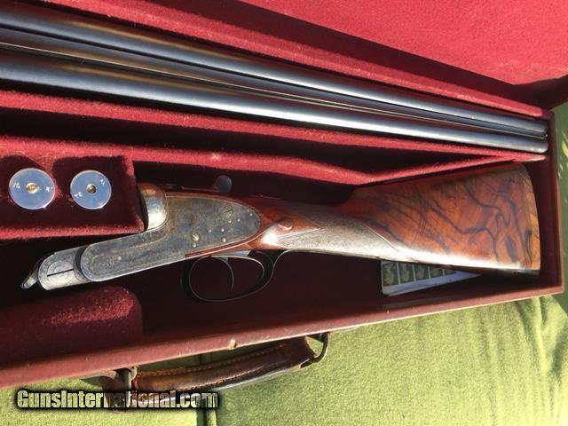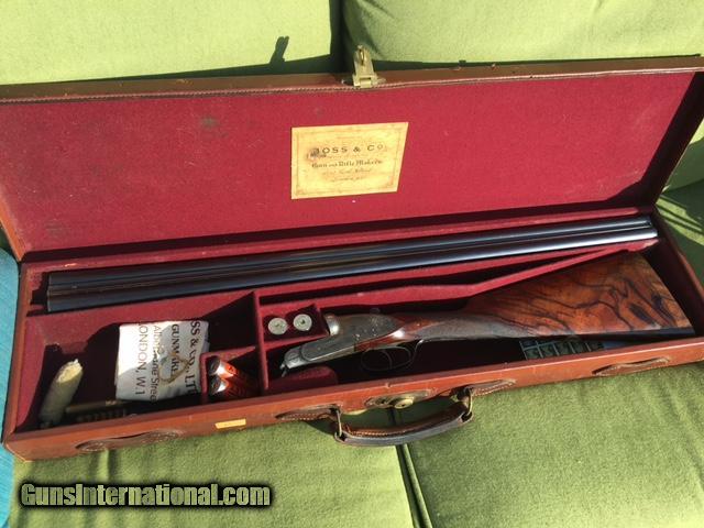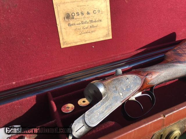 Description: Outstanding pre war 1906 Boss,ejectors, number 2 of a broken set, cased in a vintage Factory Boss case with some original accesories. London NP proofed 2.5" 1 1/8" has been opened to 2 3/4". Original case colors , beautiful wood, butt plate is cut with the flat top boss checkering so indeed may be original. gold cocking indicators, gold ejectors, number 2 in gold on the rib. 30" barrels, double triggers. 6 3/4" pounds, 14 3/4" lop, 1.5" x 2 1/8" , left barrel .015" right barrel .005" Perfect for rising birds. Ejectors very slightly out of time, ribs should be relayed at some point in the future if planning on using for extended shooting, however perfectly fuctionable and shootable as is. A truely stunning shotgun by the worlds best maker and priced to sell. $12,500 Serious Inquiry only please. SOLD |