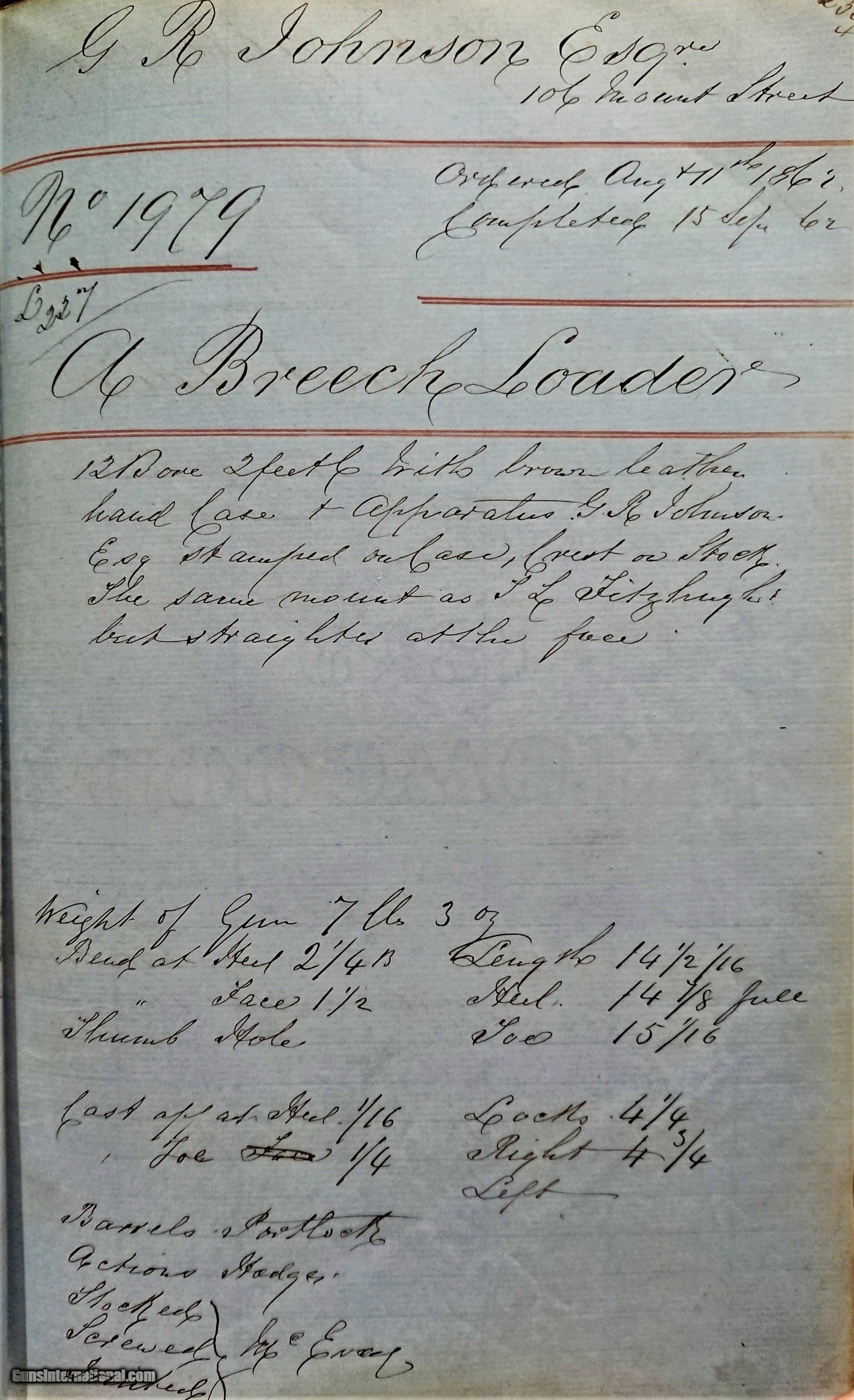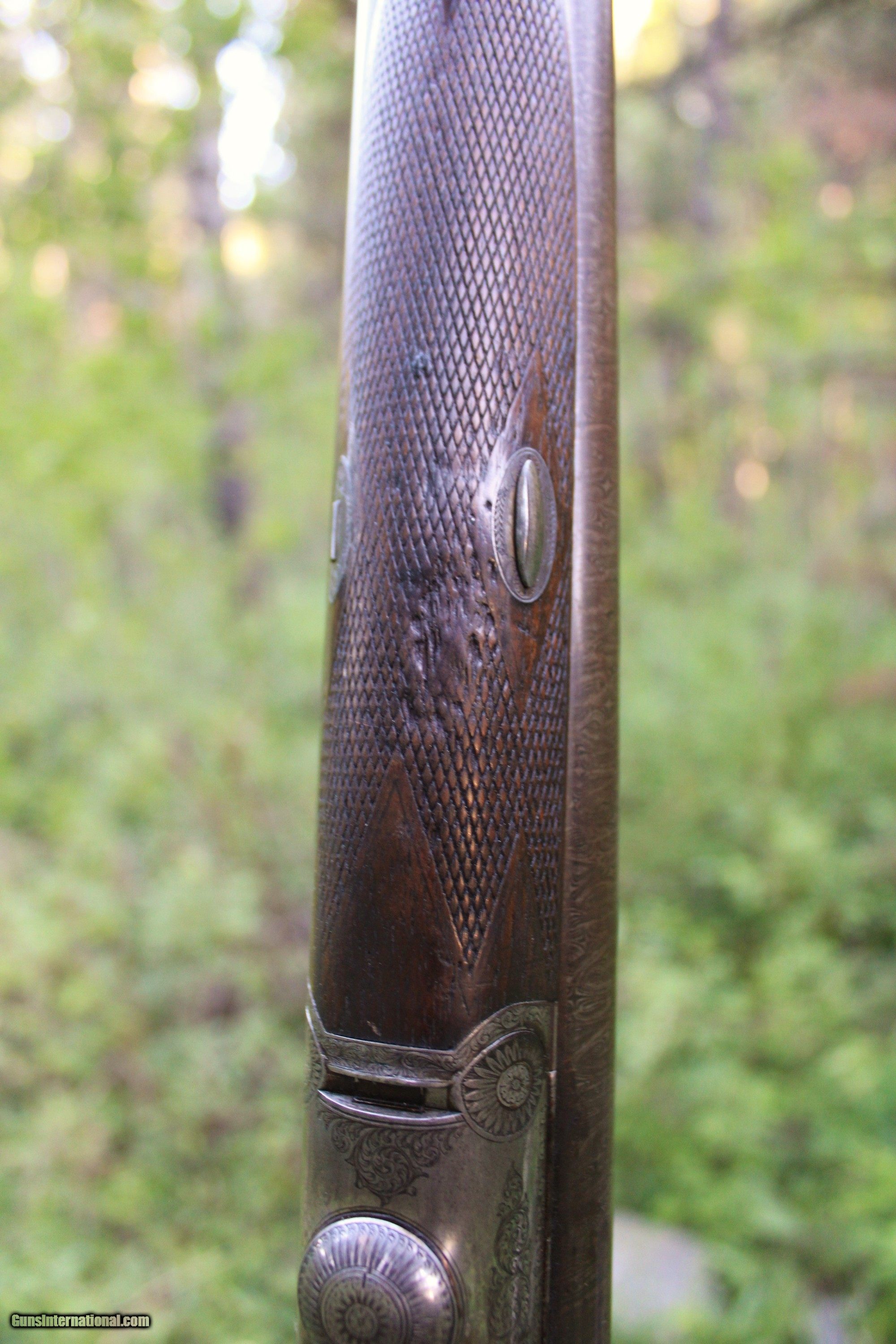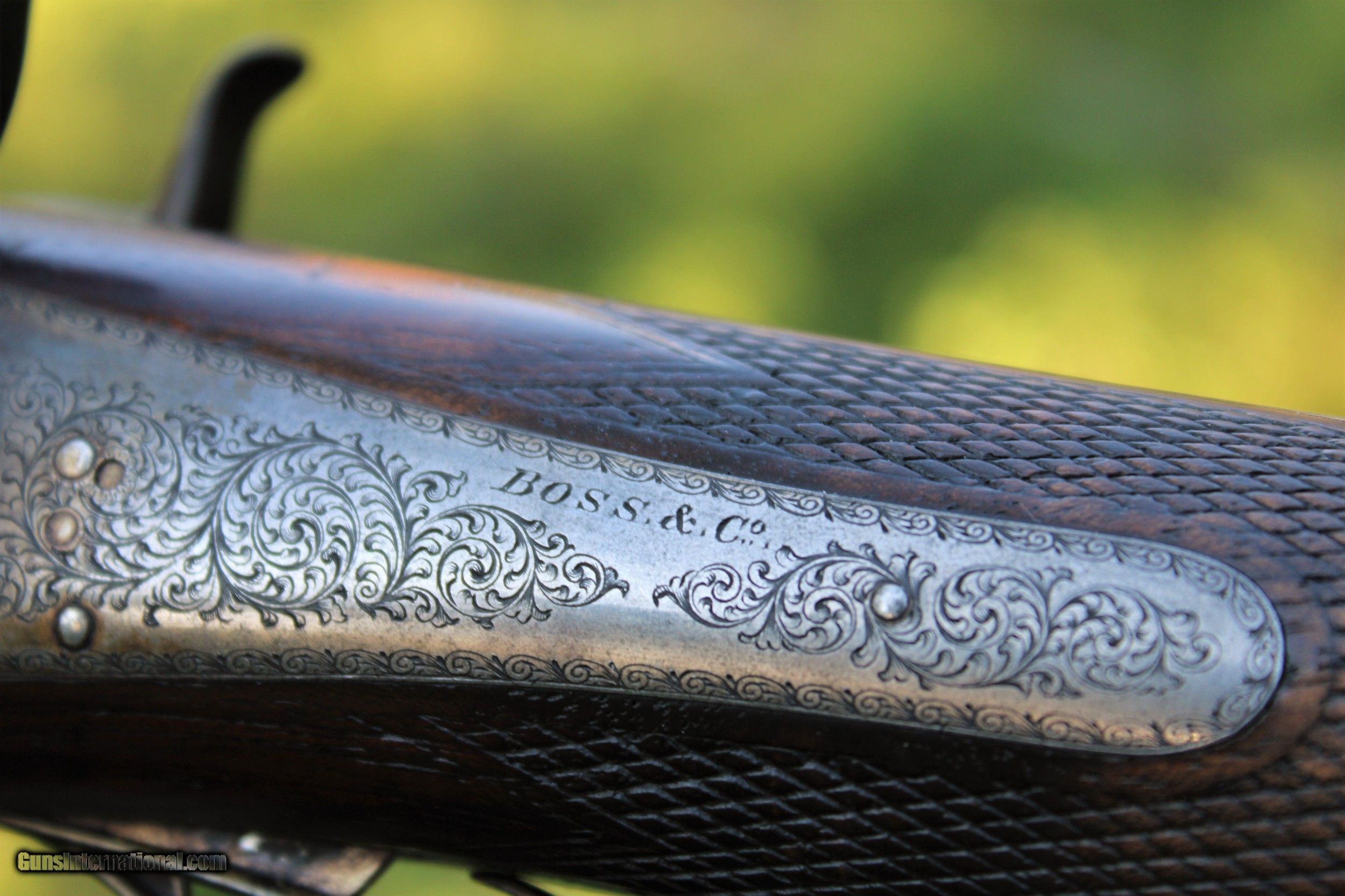 Description: Here is a fine early back-action Boss hammergun, completed on September 15, 1862. The 28 3/4" black powder proved Damascus barrels have 2 1/2" chambers and excellent bores, with true cylinder choke in each. The concave rib is engraved: BOSS & CO. 75 St. JAMES'S STREET. LONDON. The gun locks up tight with its Jones under-lever. The action and locks have excellent bold foliate engraving. The hammers are rebounding, and the locks function crisply. The keyed fore-end has a horn finial. The figured stock measures 1 1/2" x 2 5/8" x 14 5/8" over a smooth steel butt-plate. There is slight cast off. There are some indentations to the fore-end wood (see photo #9) and light scratches to the stock, but the wood is otherwise in very good condition with no chips or cracks. The weight is 7 lbs 2 oz. A beautiful hammergun from a great maker. SOLD Antique: Yes Shotgun Gauge: 12 Gauge |