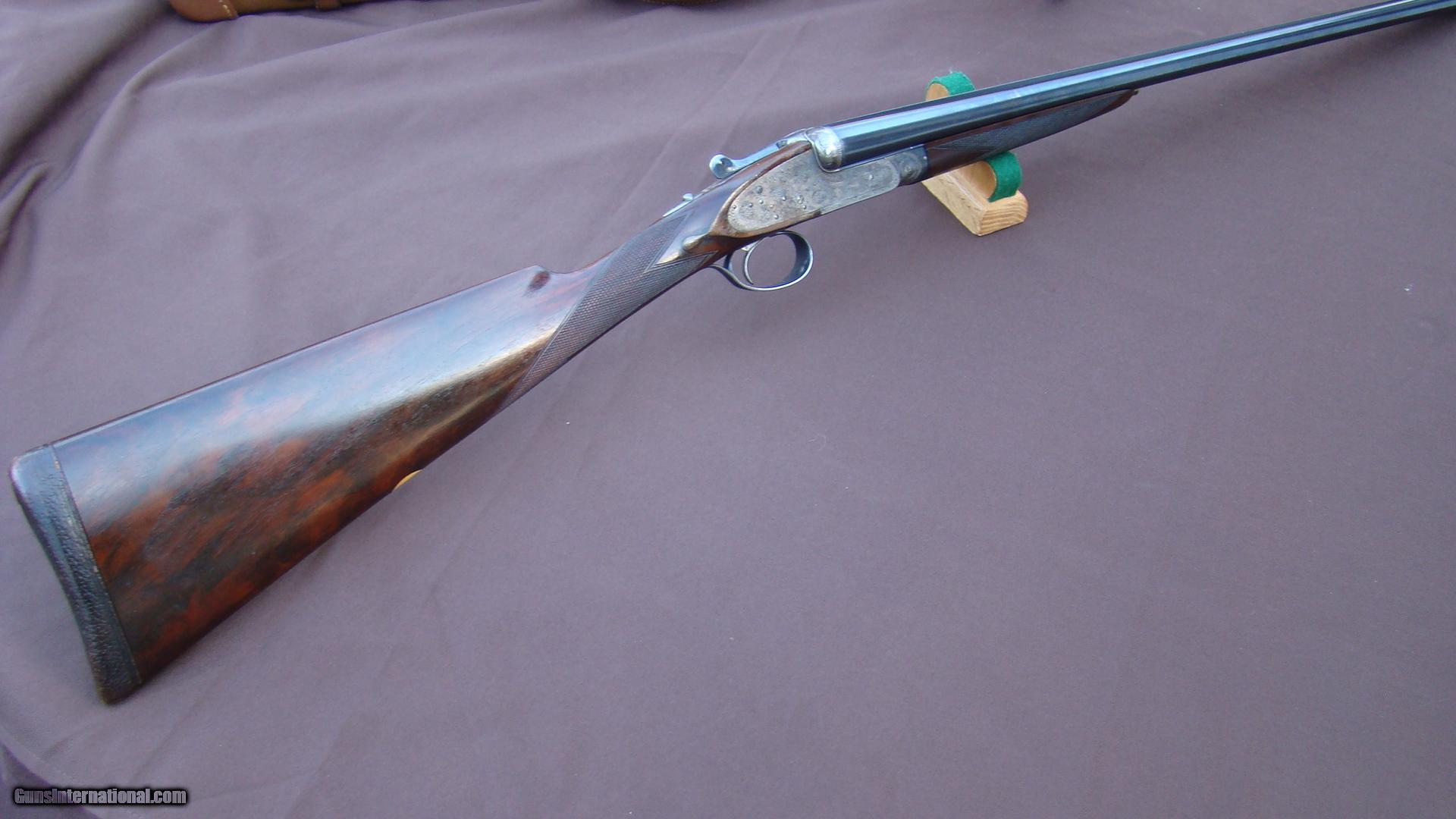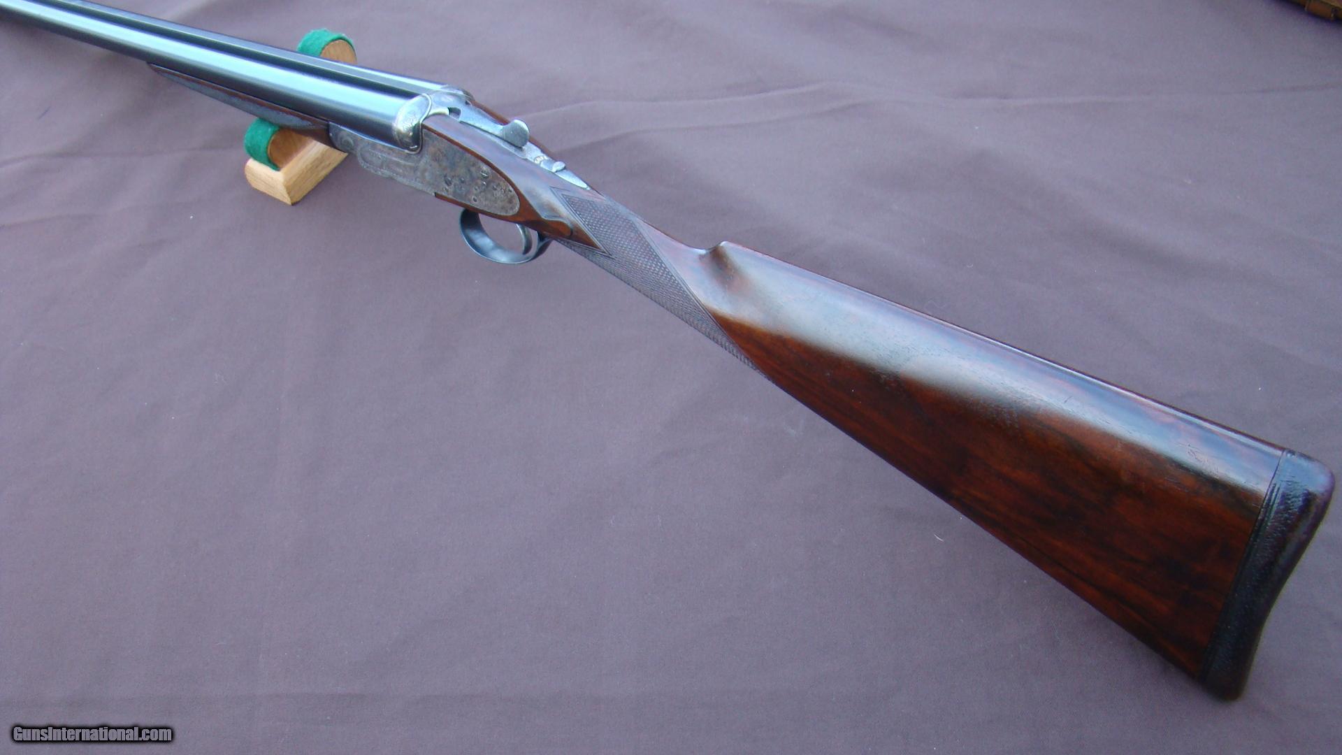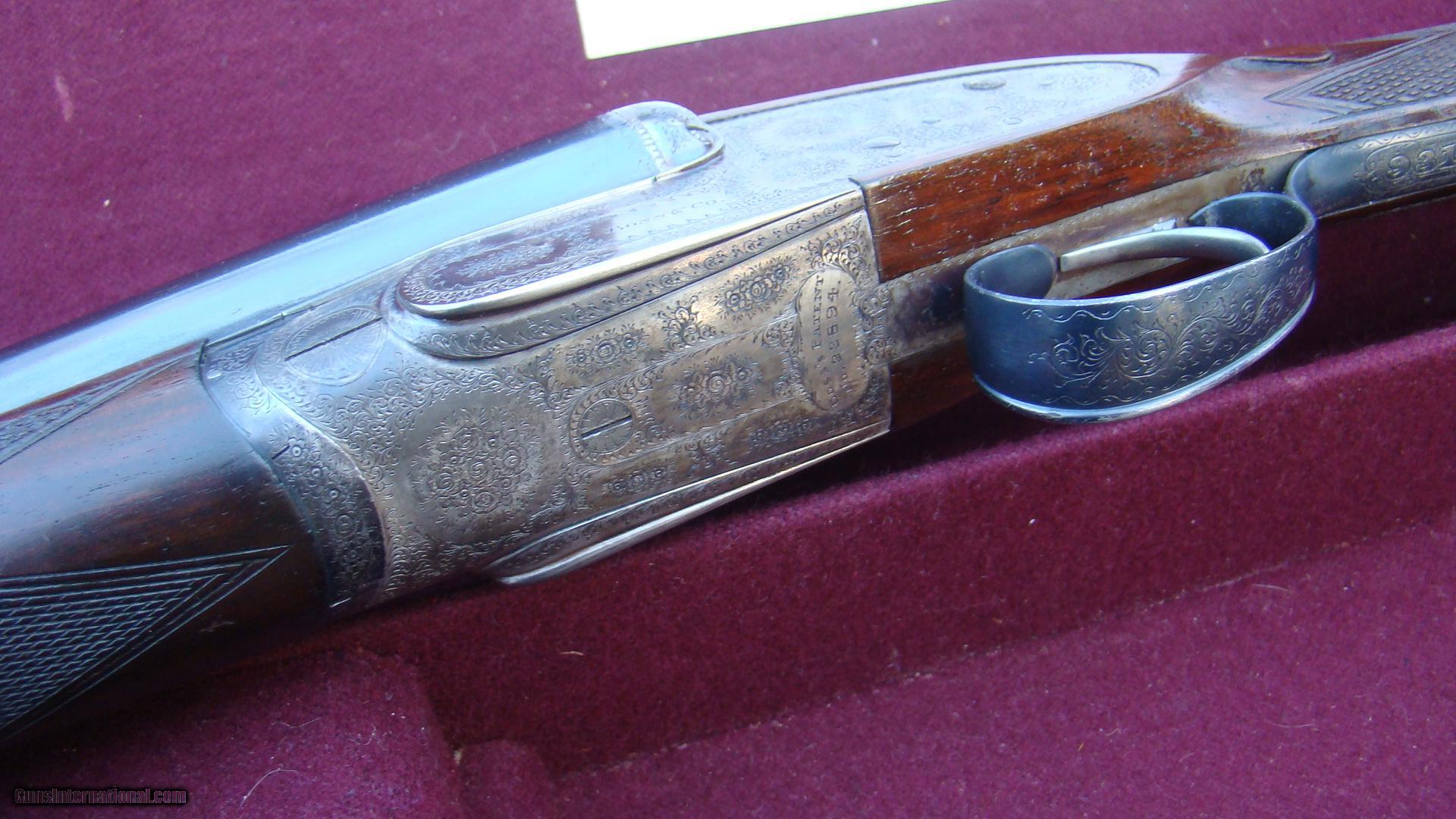 Description: Boss & Co. 20 ga., best side by side, 26" barrels with file cut flat tapered rib, original 2-3/4" chambers choked tight improved cylinder and modified .010/.016, bores measure a perfect .615/.615, and fabulous wall thickness of .035 minimum both. With a perfectly proportioned action, engraved in the traditional Boss style, this little gun weighs just 5 lbs, 10 oz. Fitted with Boss single trigger and automatic ejectors. The slender English grip and splinter forend make for a elegant look to this racy little Thoroughbred! Stock measures 1-3/8" comb, 2-1/8" heel, 14-1/2" to a checkered butt. The wood features a rich deep red color with black smokey figure finished with a wonderful original patina. The action retains about 75% case colors of muted browns and blues which provide a background to showcase the delicate engraving. At 50 years old, this gun is in excellent condition overall and less than half today's replacement cost. Cased in a lightweight VC with maker's label. SOLD |