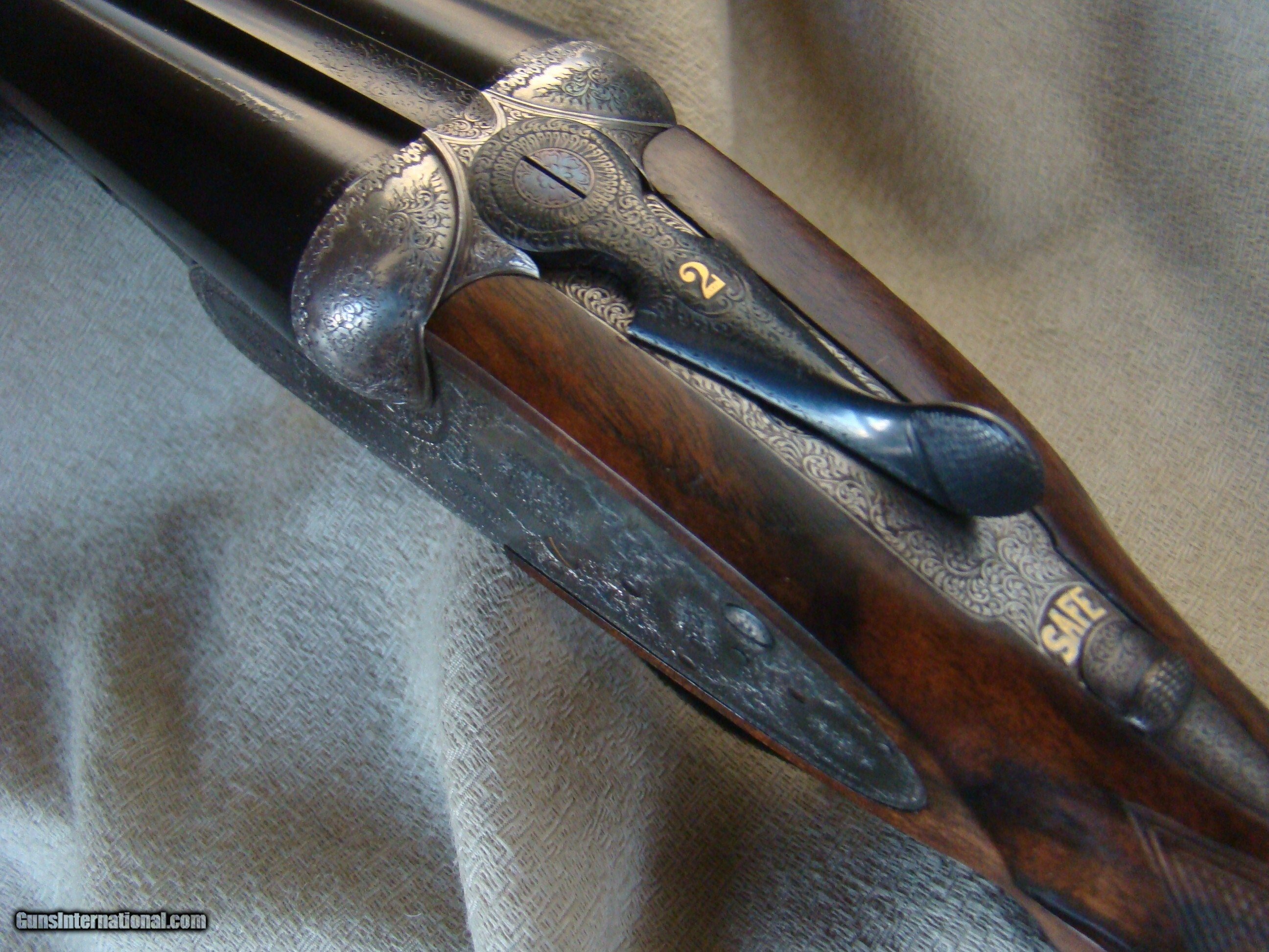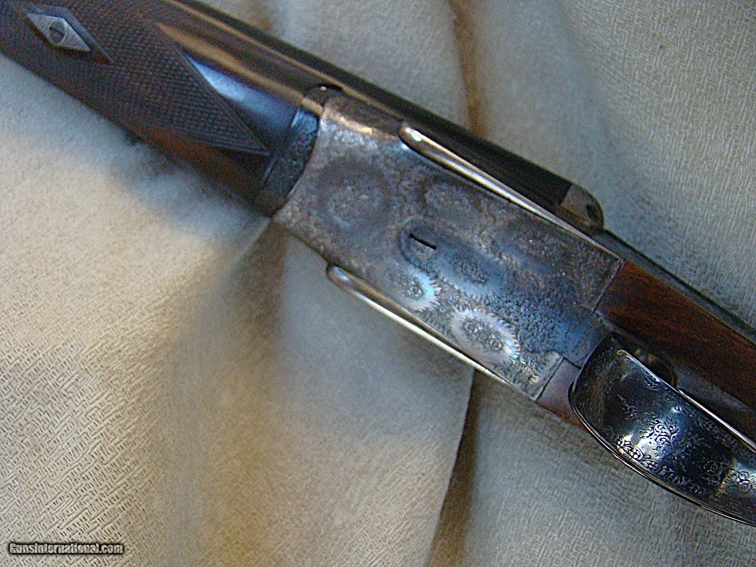 Description: Boss & Co. 20 ga., 28" chopper lump barrels, 2-3/4" chambers, 1 oz. proof. Both barrels choked extra full (.040/.040). Built circa 1932. Single trigger, auto ejectors and auto safe. The action shows the fabulous engraving of Jack Sumner and retains the distinctive subtle case colors of the period. This beautiful example has been completely renovated by the factory in 2000 including new stock and barrels. Bores measure as new and wall thickness 035 . Tight on the face and lever to the right. Like buying a new gun. Highly figured stock with bold contrasting black figure measures 1-3/8", comb 2-1/4" heel, 14-7/8" to a checkered butt. Presently cast on 3/8" for left hand shooter, could be easily reset for right hand. The best of both worlds features pre-war style of Sumner engraving and barrels as new production. Just weighing in at the sweet spot 5 lbs., 12 oz. Price: $64,500.00 Contact Seller |