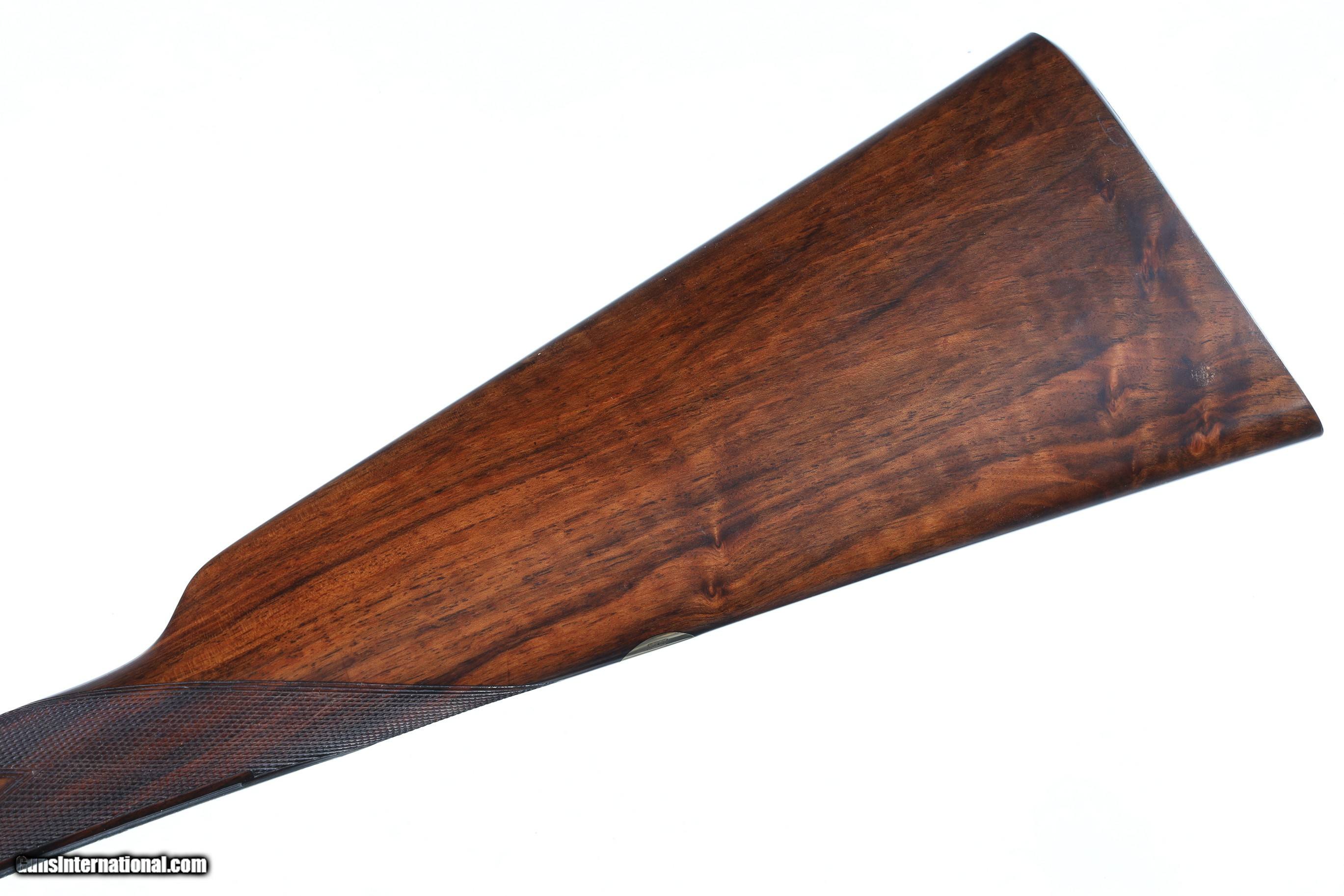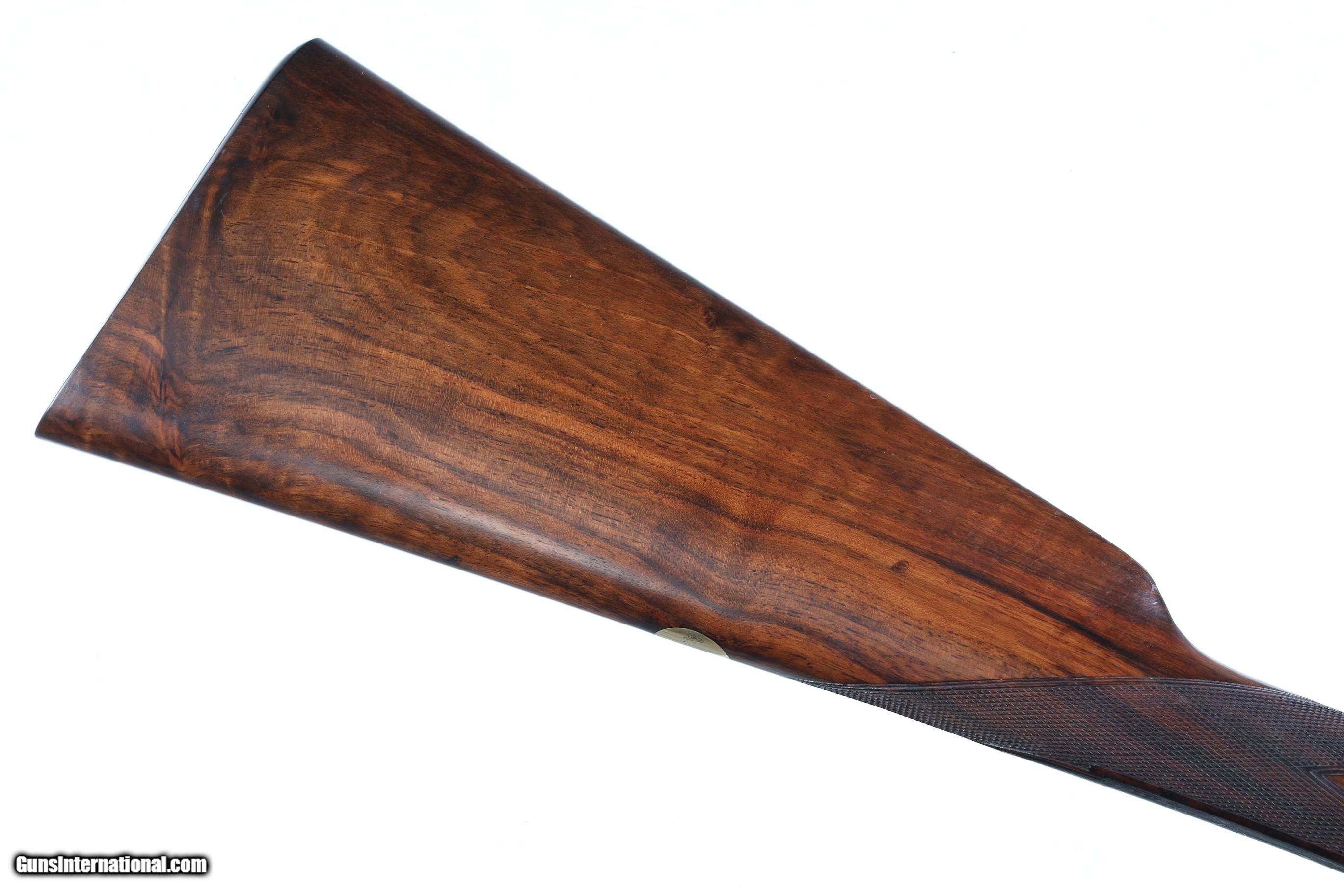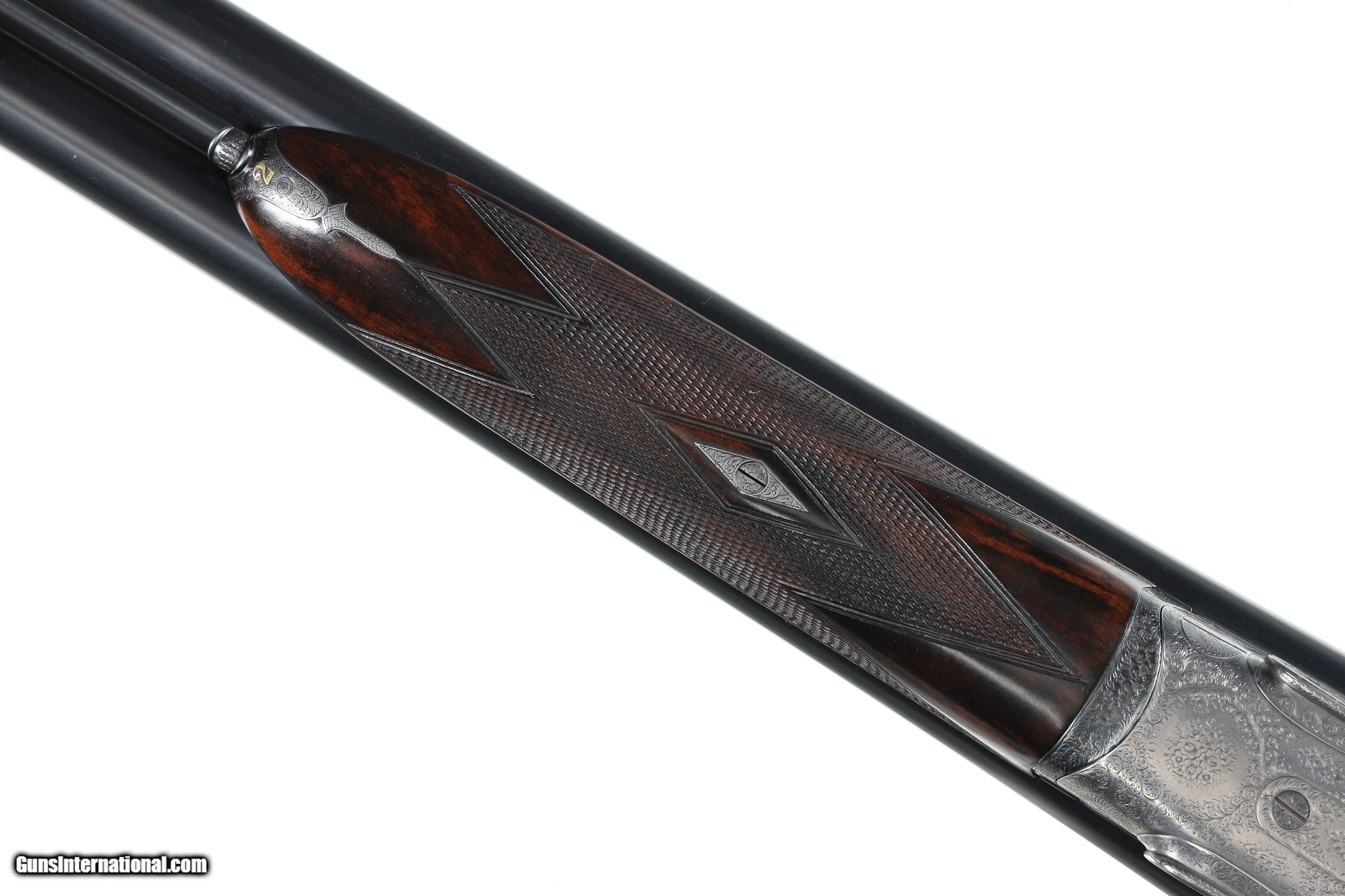Description: Boss & Co. 7 pin sidelock, documented as special order in January of 1901 for Gardner S. Bagley Esquire at Hatherone Castle. Profusely engraved in rose and scroll with delicate patented single Boss trigger and petite trigger guard with lifter. English straight stock of highly figured English walnut, 2 3/4" chambers, LOP 15", DAC 1 1/2", DAH 2". Matching checkered forearm, gun is marked with gold "2" on rib and lever. It is housed in original factory oakened leather luggage case with makers label. Excellent overall condition as English refreshed and having been professionally sleeved, chokes measure Skeet 1 & Skeet 2. An outstanding best quality English double. Case is good with moderate wear. Mfg in 1902 • Free Shipping, No Credit Card Fees. • Lay-a-way available for this firearm. • 1/3 Down, a 1/3 in 30 Days 1/3 in 60 Days. SOLD Manufacturer: Boss & Co Model: Sidelock Serial Number: 4866 Barrel Length: 29 |