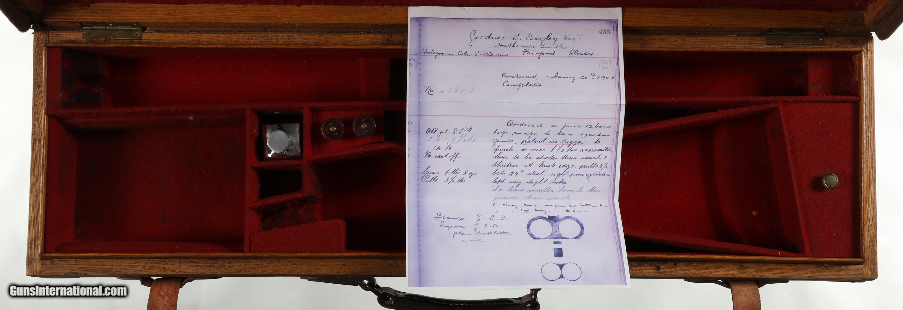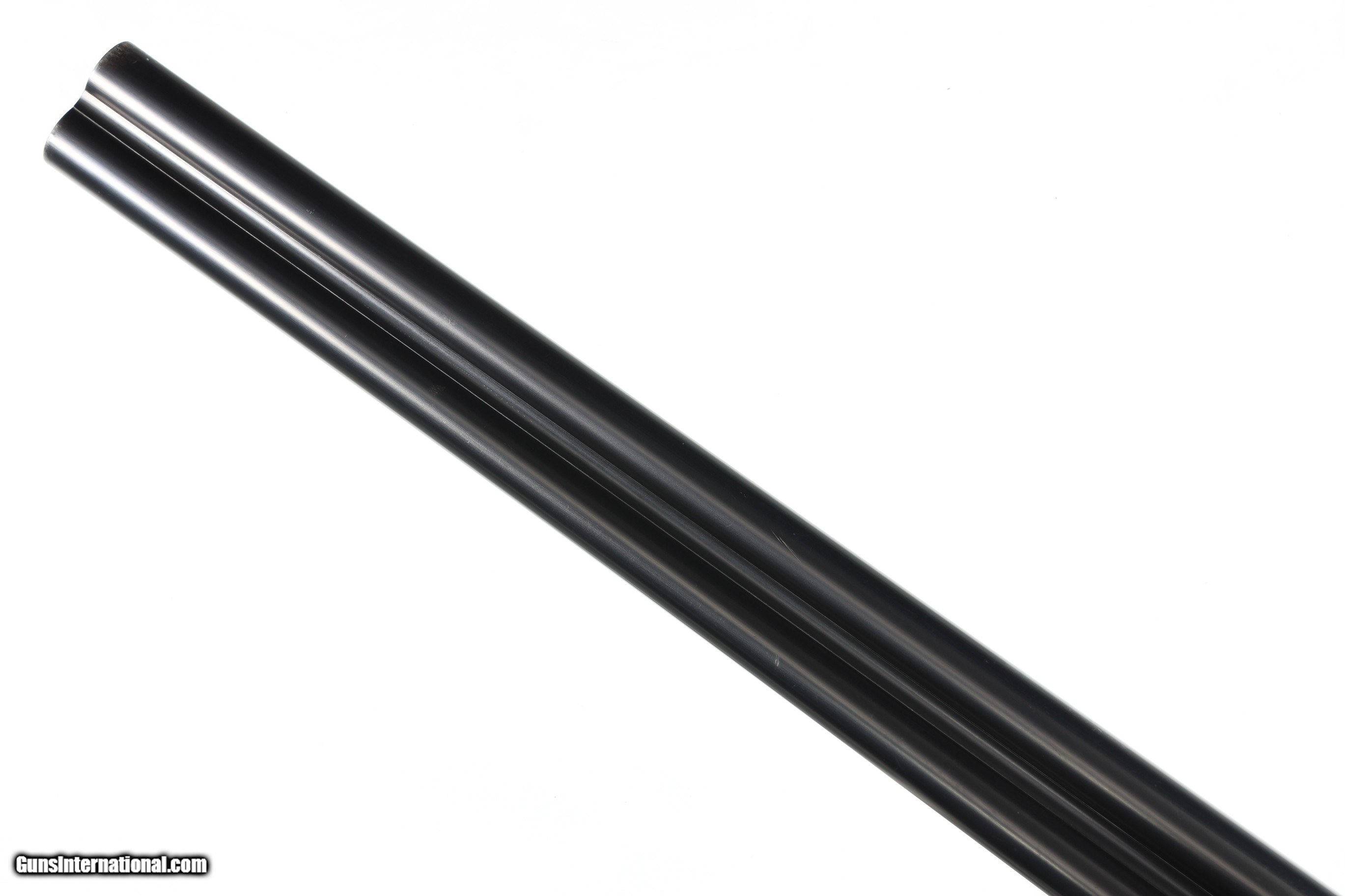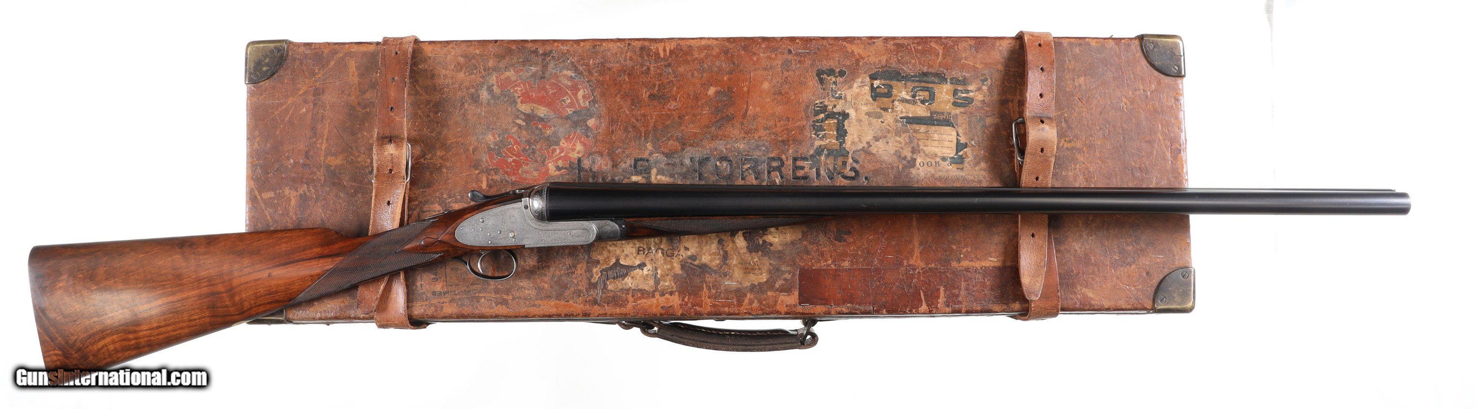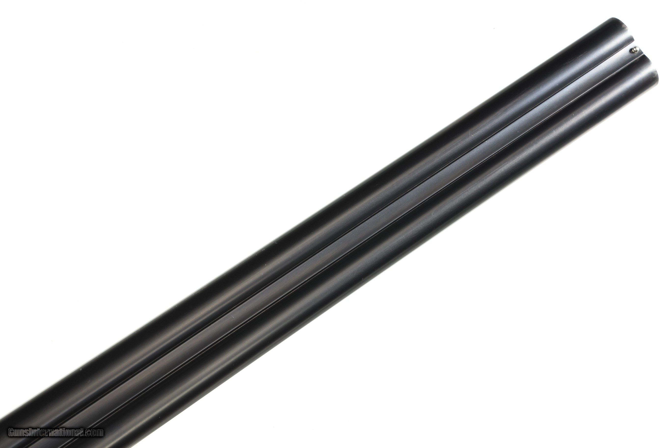 Description: Boss & Co. 7 pin sidelock, documented as special order in January of 1901 for Gardner S. Bagley Esquire at Hatherone Castle. Profusely engraved in rose and scroll with delicate patented single Boss trigger and petite trigger guard with lifter. English straight stock of highly figured English walnut, 2 3/4" chambers, LOP 15", DAC 1 1/2", DAH 2". Matching checkered forearm, gun is marked with gold "2" on rib and lever. It is housed in original factory oakened leather luggage case with makers label. Excellent overall condition as English refreshed and having been professionally sleeved, chokes measure Skeet 1 & Skeet 2. An outstanding best quality English double. Case is good with moderate wear. Mfg in 1902 • Free Shipping, No Credit Card Fees. • Lay-a-way available for this firearm. • 1/3 Down, a 1/3 in 30 Days 1/3 in 60 Days. SOLD Manufacturer: Boss & Co Model: Sidelock Serial Number: 4866 Barrel Length: 29 |