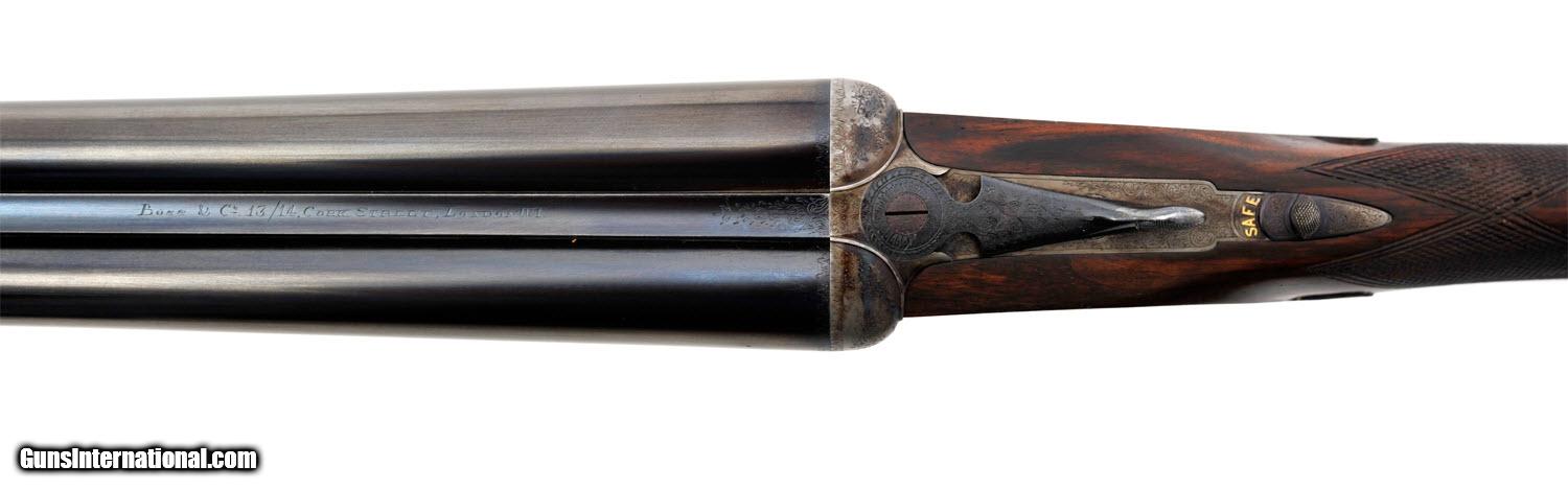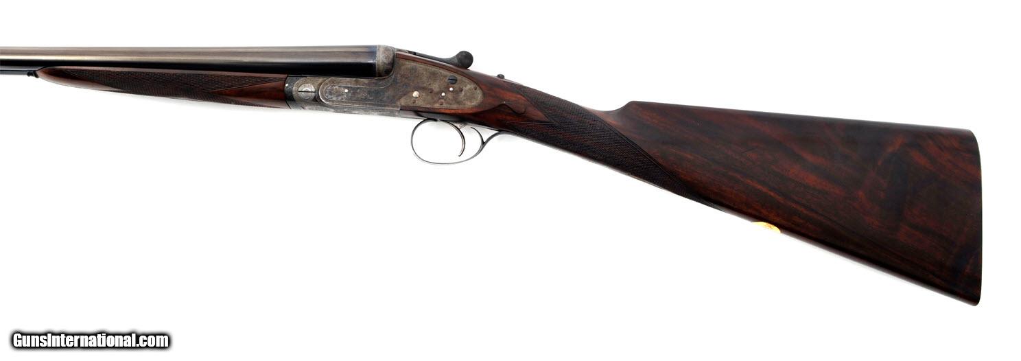 Description: Boss & Co. - Best - 20 ga - Item Number: BOS9729 Shotgun type: SxS Action: Sidelock Ejectors: Yes Trigger: Single Grip: Straight Grip Forend: Checkered Lop: 14 1/2 " Pad thickness: " Type of butt: Checkered Wood Drop comb: 1 1/2 " Drop heel: 2 1/8 " Cast amount: 3/16 " Cast: Off Weight: 5 lbs, 10 oz Manufactured in: England Manufacture Year: 1976Finish: Case Colored Overall condition: Very Good Stock condition: Very Good Metal condition: Very Good Stock: Original finish Metal: Original finish Type of Case: Maker's Luggage Case Extra barrels: 0 Barrel info: Gauge: 20 ga Chamber: 2 3/4 " Length: 26 " Chokes: IC/M Rib type: Concave Comments : Gun is in very good condition with some light handling wear. Makers luggage case. SG 271 SOLD |