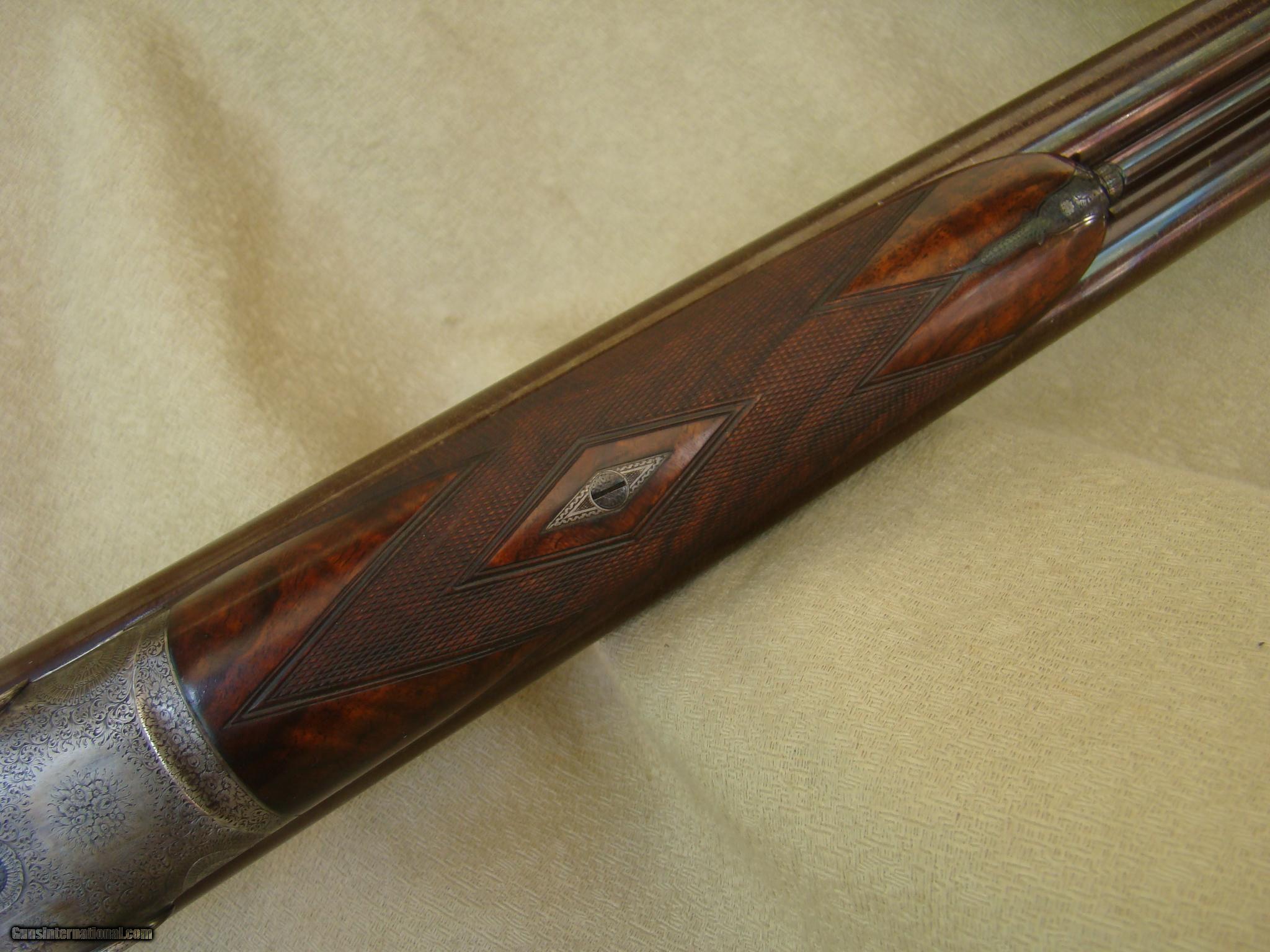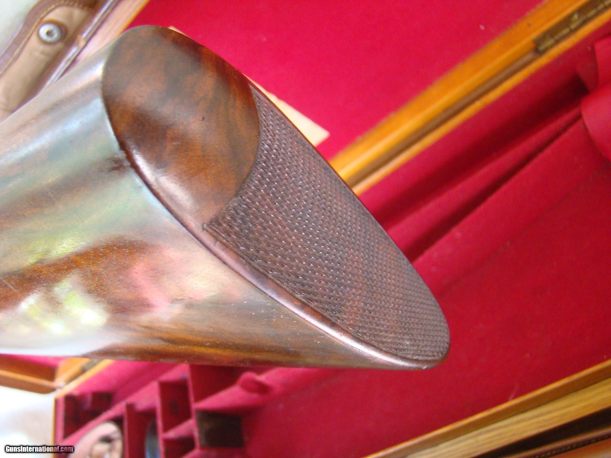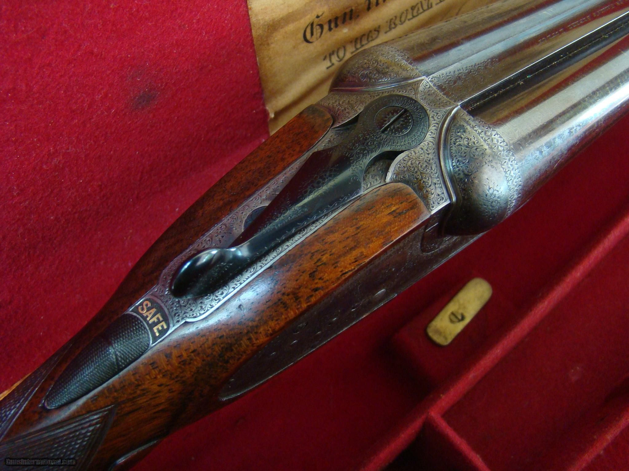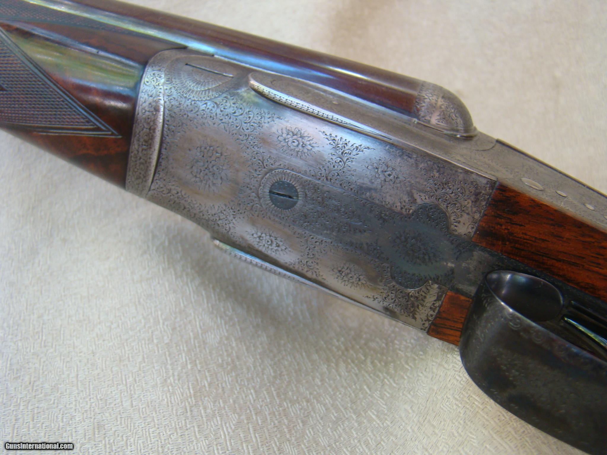 Description: Boss & Co. best quality sidelock ejector. Original 28" Damascus barrels and additional factory steel barrels. The Damascus barrels bear the St. James's Street address and are choked .009/.035 (open modified and full) and maintain a wonderful star pattern Damascus. The additional 28" steel barrels, fitted by Boss circa 1979, bear the Cork Street address and are choked .007/.017 (improved cylinder and modified). 2-3/4" chambers, double triggers, splinter forend. Nicely figured straight hand stock measures 1-1/2" comb, 2-1/4" heel, 14-3/4" LOP to a checkered butt. The action features the finest Boss pattern rose and scroll and retains a wonderful patina of case color hardening. The gun appears to be unused since the return to the factory for additional barrels. Weighing just 6 lbs, 6 oz., a fast-handling British best. Cased in the original oak and leather plus an additional case fitted just for the new barrels. Complete set of spare mainsprings, toplever springs, and striker pins. Best of both worlds - the beauty and character of the vintage Damascus, and the practicality of the modern steel - you choose! SOLD |
