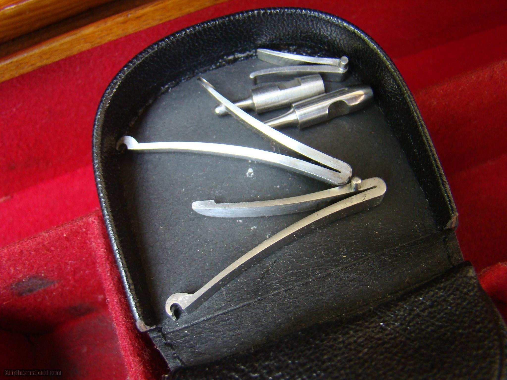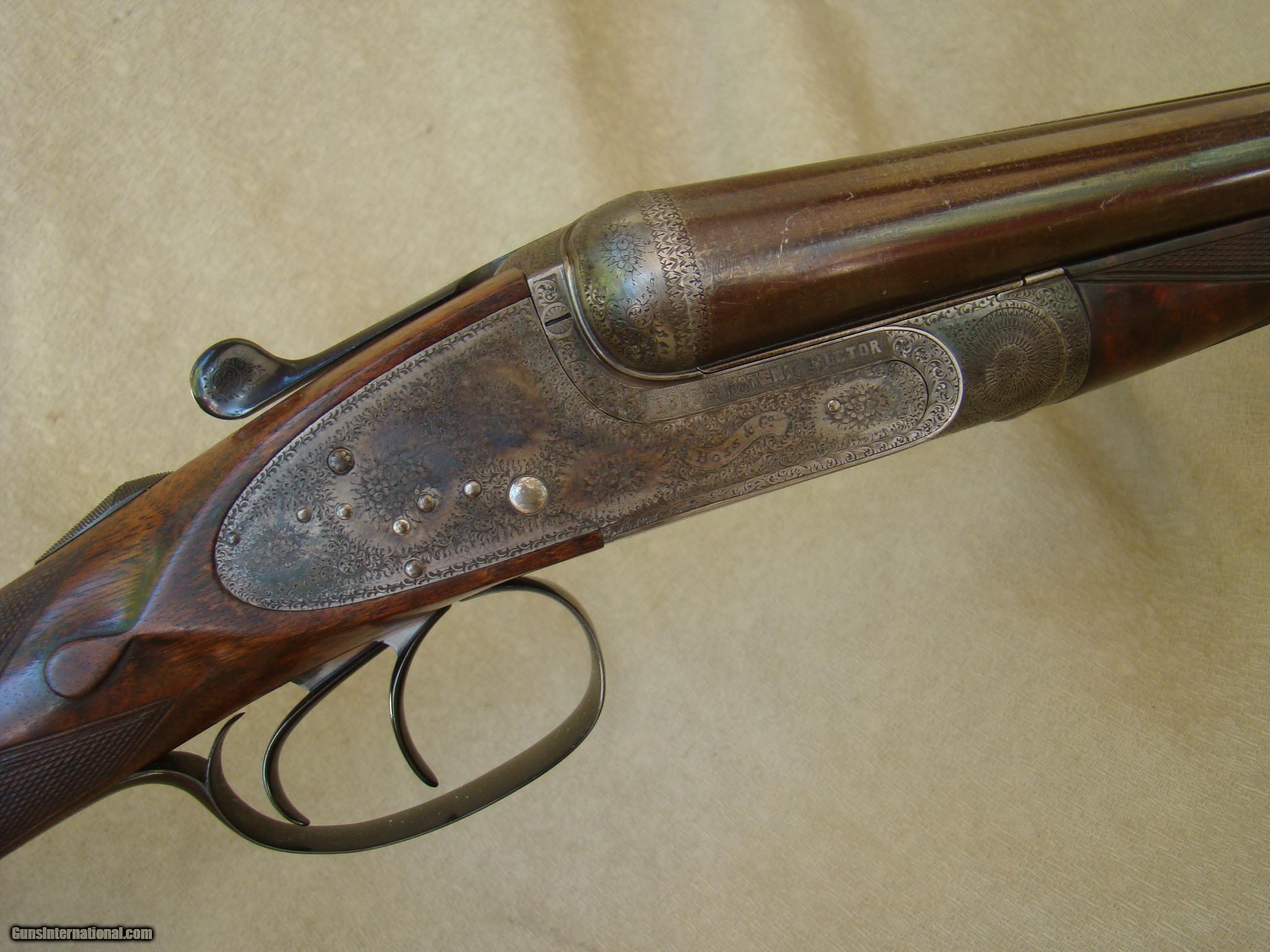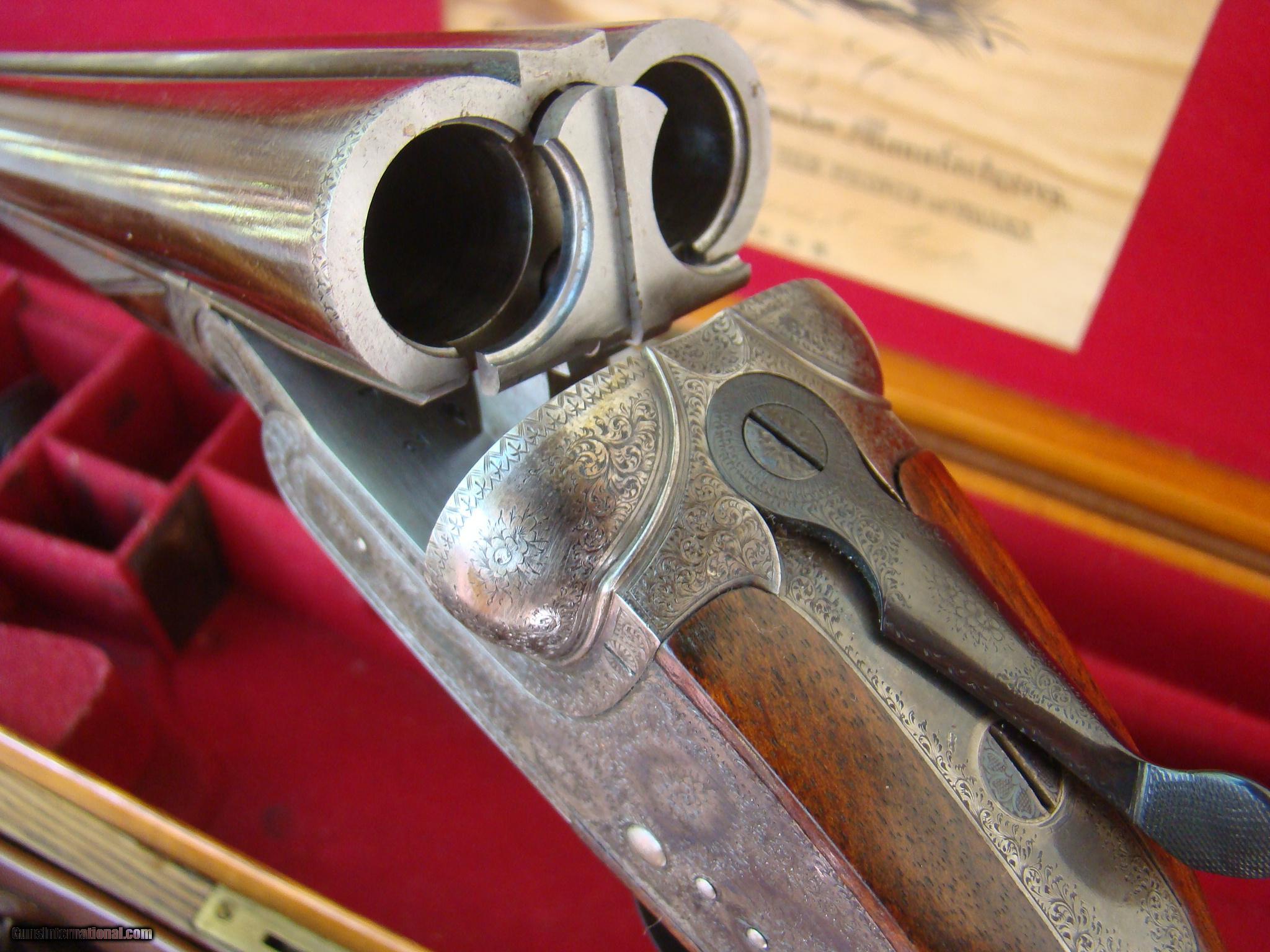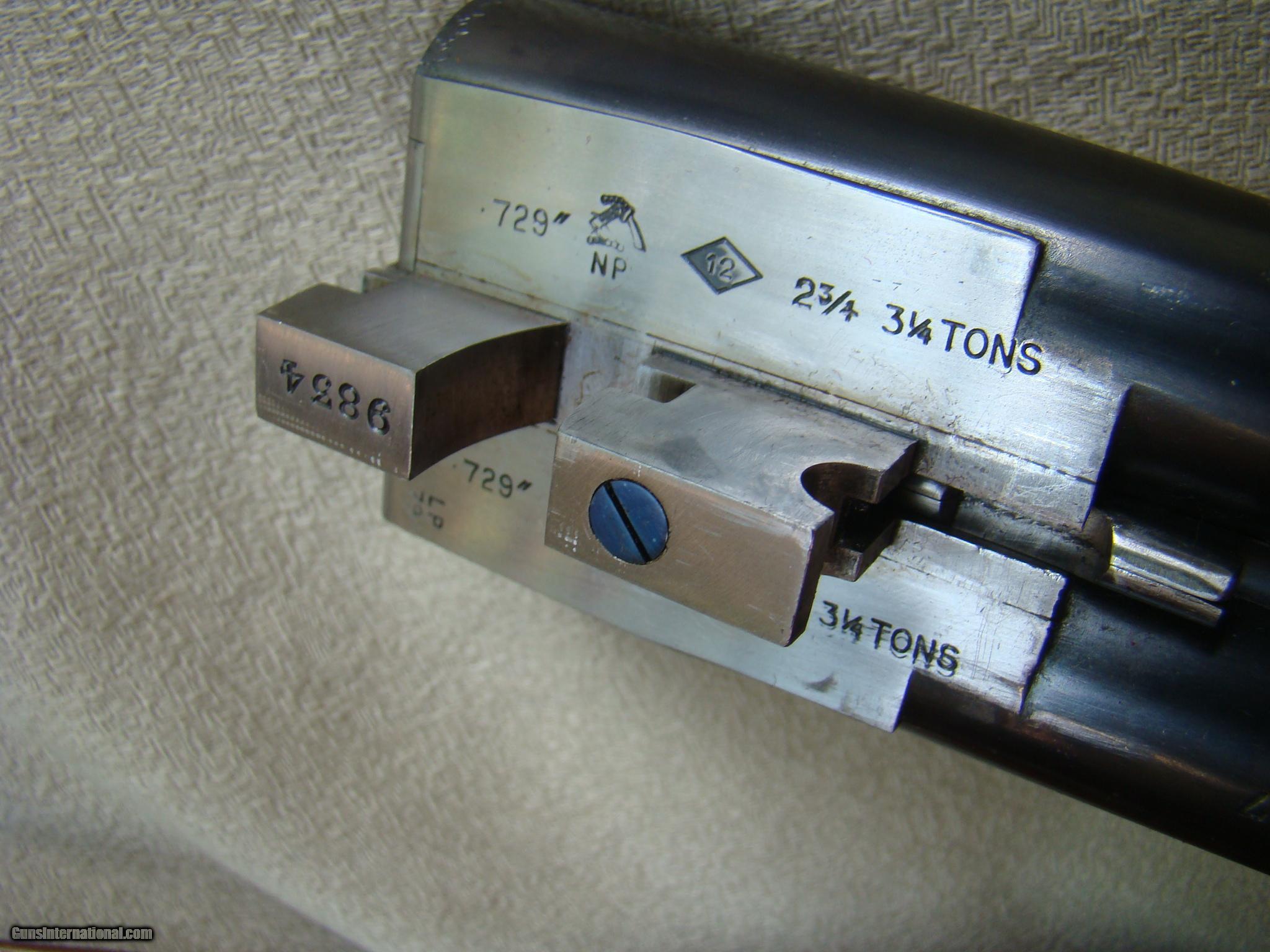 Description: Boss & Co. best quality sidelock ejector. Original 28" Damascus barrels and additional factory steel barrels. The Damascus barrels bear the St. James's Street address and are choked .009/.035 (open modified and full) and maintain a wonderful star pattern Damascus. The additional 28" steel barrels, fitted by Boss circa 1979, bear the Cork Street address and are choked .007/.017 (improved cylinder and modified). 2-3/4" chambers, double triggers, splinter forend. Nicely figured straight hand stock measures 1-1/2" comb, 2-1/4" heel, 14-3/4" LOP to a checkered butt. The action features the finest Boss pattern rose and scroll and retains a wonderful patina of case color hardening. The gun appears to be unused since the return to the factory for additional barrels. Weighing just 6 lbs, 6 oz., a fast-handling British best. Cased in the original oak and leather plus an additional case fitted just for the new barrels. Complete set of spare mainsprings, toplever springs, and striker pins. Best of both worlds - the beauty and character of the vintage Damascus, and the practicality of the modern steel - you choose! SOLD |