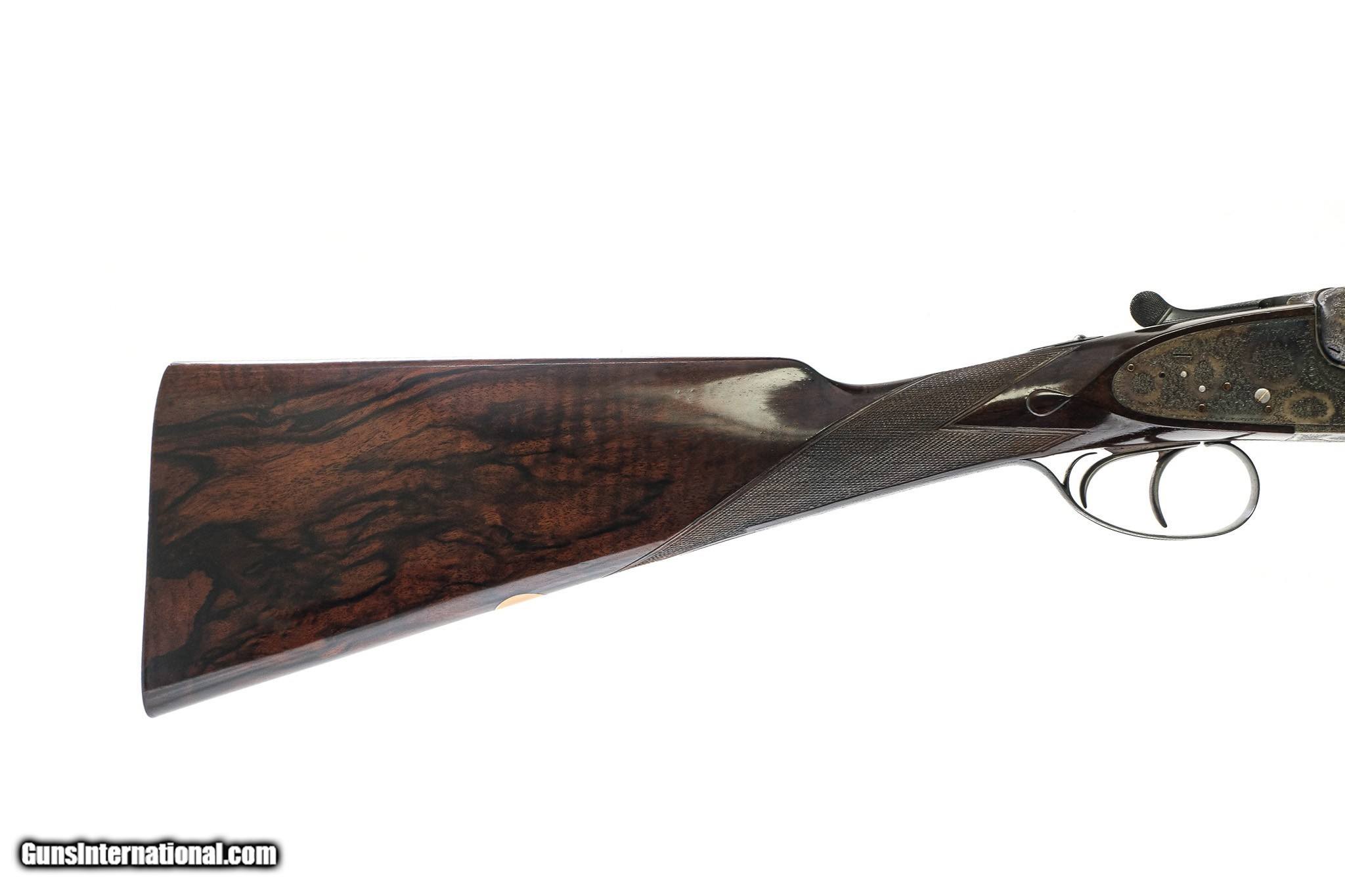 Description: Boss & Co. - Pre-War, SxS, Sidelock Ejector, Assisted Opening, Matched Pair, 12ga. 30" Chopper Lump Barrels Choked IC / 1/4". A consecutive match pair, a extremely rare easy opening full sidelock ejector, according to Boss records these guns were made in 1928, the guns that were made between the wars are considered the height of workmanship and collectability. 12ga, 30" BEST quality original Chopper Lump barrels, ribs engraved “Boss & CO, Dover ST, Piccadilly, London. W.” the letter remains perfect as the day it was made, Gold inlayed 1 & 2 , the remain as built with 2 ½" chambered, choked IC/1/4 , Top lever engraved in gold inlay 1 & 2, automatic safety with gold inlay “safe”, rolled edge trigger guard , double trigger, automatic ejector.. the gun remains as new! They retain nearly all of their case color, show no signs of being shot, have perfect screws, perfect Sumner engraving, French walnut stocks, sharp perfect checkering, nearly 100% wood finish on their original French walnut stocks, these are the height of English gun making made in 1928, the best collector quality guns imaginable by the best maker.. .and easy opening! These are their highest-grade guns! In a condition that is seldom seen. made for Captain A. S. Douglas, and according to Boss they were ordered on the 6th of Feb 1928 and ready in a few months.. in their original oak and leather case with all accessories this is a major find! If you order new guns today this is what you can expect them to look like.. except these are pre-war, sharp, crisp, and clean.. an opportunity to buy the best! This is amongst the finest pair of English Shotguns offered for sale at a unprecedented opportunity to purchase the best! Inv: 76232 - 76233 6 lbs. 8 oz. 14 ½" x 1 ½" x 2 ¼" $89,000.00/Pair SOLD |