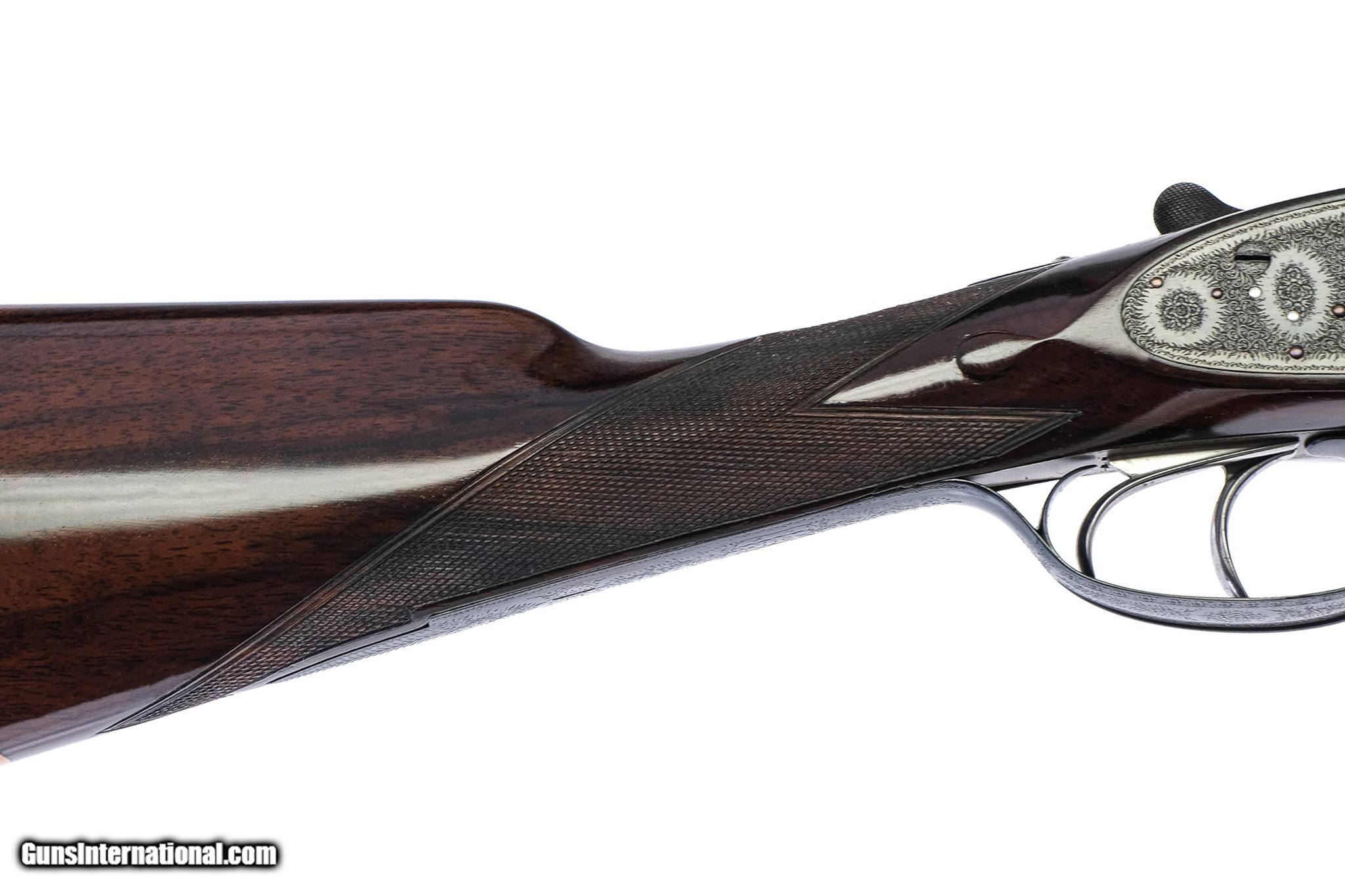 Description: Boss & Co. - Pre-War, SxS, Sidelock Ejector, Assisted Opening, Matched Pair, 12ga. 30" Chopper Lump Barrels Choked IC / 1/4". A consecutive match pair, a extremely rare easy opening full sidelock ejector, according to Boss records these guns were made in 1928, the guns that were made between the wars are considered the height of workmanship and collectability. 12ga, 30" BEST quality original Chopper Lump barrels, ribs engraved “Boss & CO, Dover ST, Piccadilly, London. W.” the letter remains perfect as the day it was made, Gold inlayed 1 & 2 , the remain as built with 2 ½" chambered, choked IC/1/4 , Top lever engraved in gold inlay 1 & 2, automatic safety with gold inlay “safe”, rolled edge trigger guard , double trigger, automatic ejector.. the gun remains as new! They retain nearly all of their case color, show no signs of being shot, have perfect screws, perfect Sumner engraving, French walnut stocks, sharp perfect checkering, nearly 100% wood finish on their original French walnut stocks, these are the height of English gun making made in 1928, the best collector quality guns imaginable by the best maker.. .and easy opening! These are their highest-grade guns! In a condition that is seldom seen. made for Captain A. S. Douglas, and according to Boss they were ordered on the 6th of Feb 1928 and ready in a few months.. in their original oak and leather case with all accessories this is a major find! If you order new guns today this is what you can expect them to look like.. except these are pre-war, sharp, crisp, and clean.. an opportunity to buy the best! This is amongst the finest pair of English Shotguns offered for sale at a unprecedented opportunity to purchase the best! Inv: 76232 - 76233 6 lbs. 8 oz. 14 ½" x 1 ½" x 2 ¼" $89,000.00/Pair SOLD |