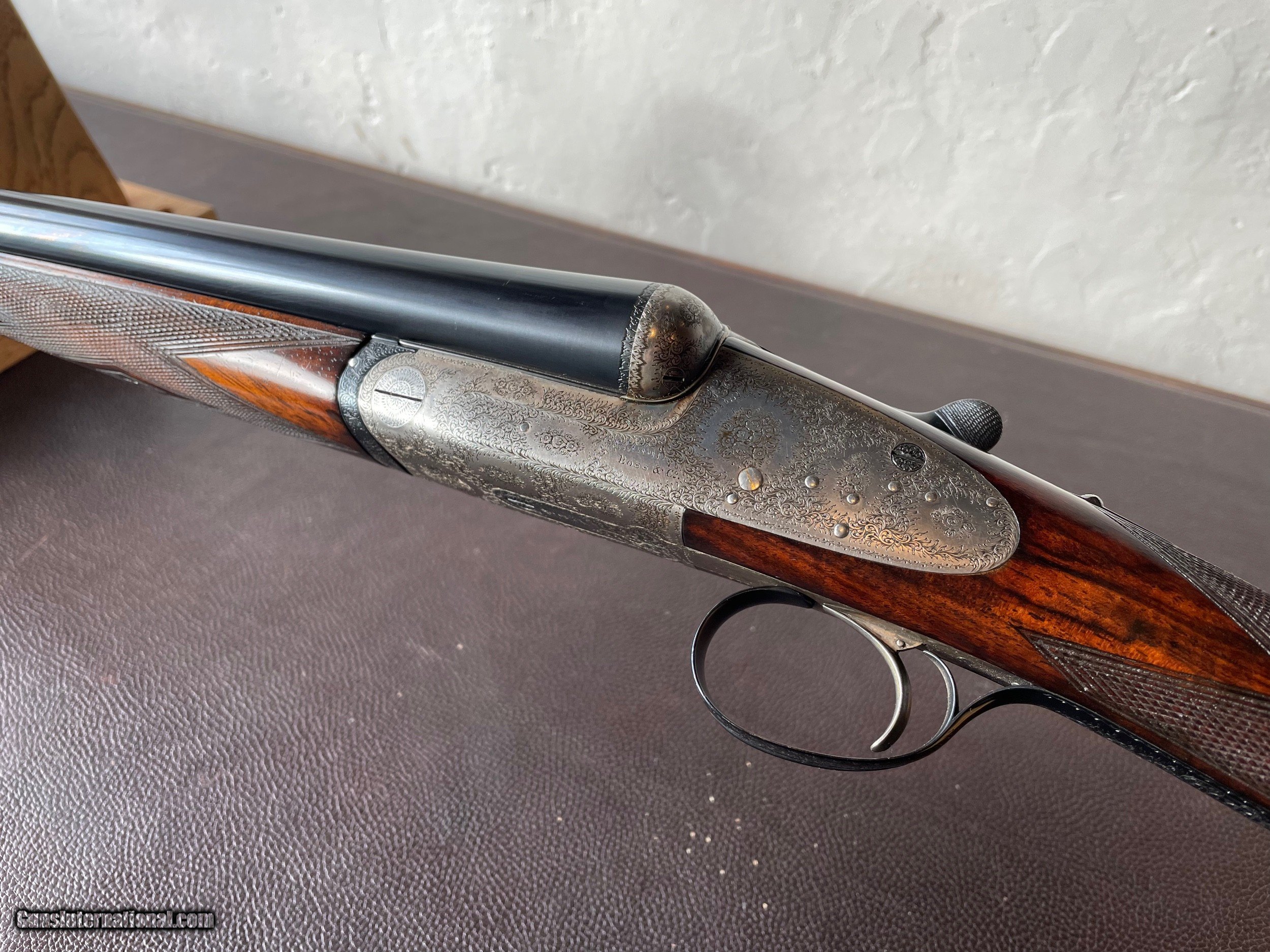 Description: Boss & Co Round action single trigger 12 Bore straight hand stock 27" barrels SOLD Shotgun Gauge: 12 Gauge Manufacturer: Boss & Co Model: Round body Serial Number: 8069 Barrel Length: 27” Bore: 12 Chambers: 2 1/2 Ejectors: Yea Condition: Good Metal Condition: Good Wood Condition: Good Bore Condition: Good Barrels: 27” Barrel Type: Side / Side Action: Round body Triggers: Single Stock Dimensions: 14 5/8. Stock Cast: R/H Fore End: Splinter forend Rib: Concave game Weight: 6lb 1oz Manufacture Date: 1930,s Chokes: L 3/8. R 1/4 Case: Yes Item Location: England Proof:Nitro: Yes Minimum Wall Thickness Left: 26 Minimum Wall Thickness Right: 27 |