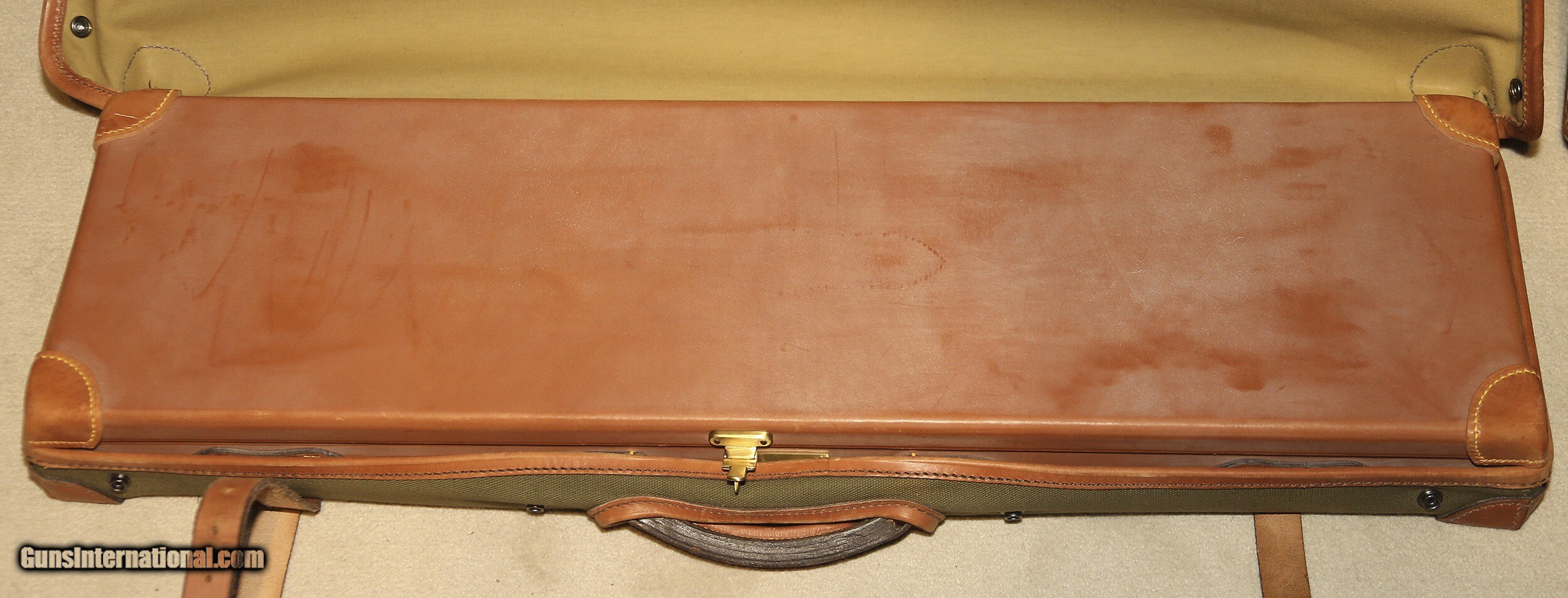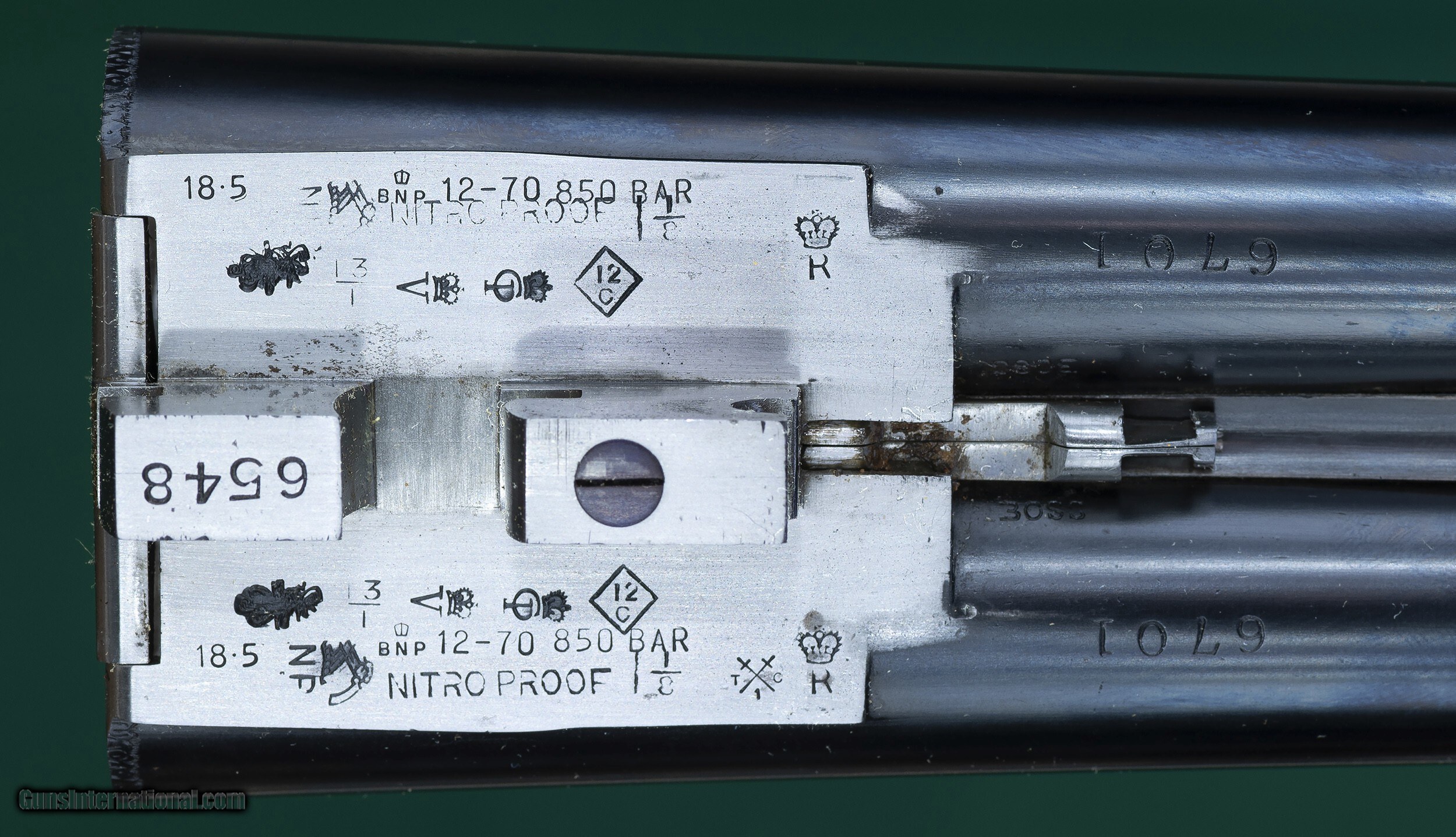Description: 30" SxS chopper-lump barrels with smooth concave rib choked improved cylinder & improved cylinder. 14 3/4" pull from Boss patent single trigger to brown pigskin-covered recoil pad. 1 1/2" - 2 1/8" drop. Trace of cast off. Lightly figured walnut stocks with Anson-release splinter forend, straight English grip, beaded-edge triggerguard, classic point-pattern checkering, teardrops, and gold initial oval. Fine rose & scroll engraved, casehardened action with maker's name in gold, and automatic top tang safety. Weight: 6lbs, 12oz. Built between 1914-1920. One of a set of at least three guns. Birmingham reproved in 1992 for 2 3/4" cartridges. Tight. Excellent bores. In later English leather trunk case with heavy canvas overcase, complement of new accessories, and a vintage maker's label. Curio/Relic: Yes Shotgun Gauge: 12 Gauge Manufacturer: Boss Model: Sidelock Ejector Serial Number: 6548 Barrel Length: 30 Chambers: 2 3/4 Barrel Type: Chopper-lump Triggers: Boss Patent Single Trigger Stock: Figured English walnut Stock Comb: 1 1/2 Stock Heel: 2 1/8 Stock Cast: Trace of cast off Fore End: Anson-release splinter forend Butt Pad: brown pigskin-covered recoil pad LOP: 14 3/4 Rib: Smooth concave Weight: 6lbs, 12oz Choke Left: improved cylinder Choke Right: improved cylinder Case: Leather trunk case Item Location: Livingston, Montana Proof:Nitro: Yes Price: $12,450.00 Contact Seller |