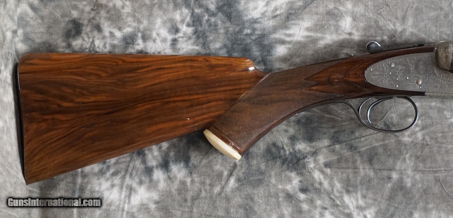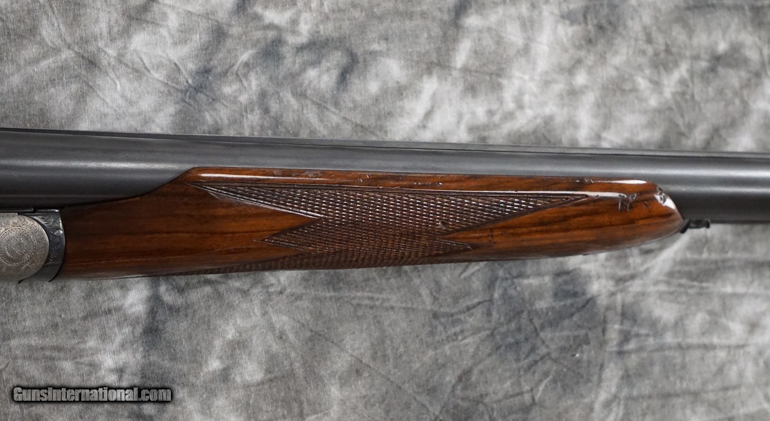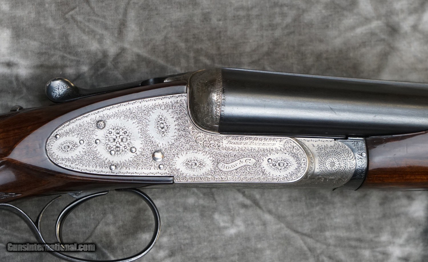 Description: Pre-Owned Boss & Co. Best Side by Side Sidelock Ejector, self-opening action with factory single-trigger. Coin finished action with fine English Rose & Scroll, gold cocking indicators (single, non-selective trigger) and self-opener. Action seems to be in very good condition with patina, light darkening and some damage to screws, trigger guard has been polished and re-blued, showing wear to the engraving, the forearm iron has also been polished and re-blued showing wear. Barrels have been opened to Cylider and Cylinder, polished and reblued (probably many times) that none of the original engraving on the barrels is legible, at some point a ventilated rib has been added to this gun-the rib is not original. What appears to be the factory Pistol grip stock has been drastically shortened to 12 1/2" LOP, the original skeleton butt plate pieces have been preserved and re-fit to the back of the stock, a bone grip cap has been fixed to the pistol grip, full beavertail forearm. Pre-First World War manufacture (Serial Number is 4873). Action is a great candidate for a full restore, barrels are in pore condition although bores are bright and shiny. Does not include case. SOLD Shotgun Gauge: 12 Gauge |