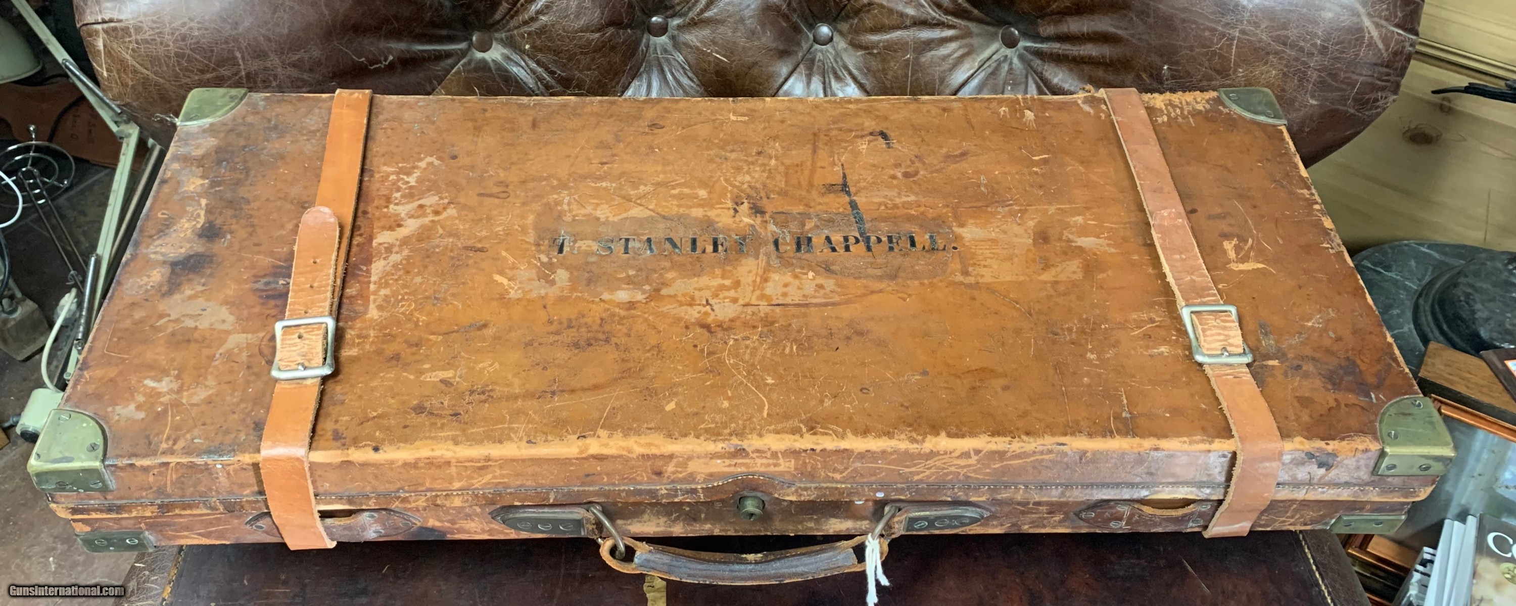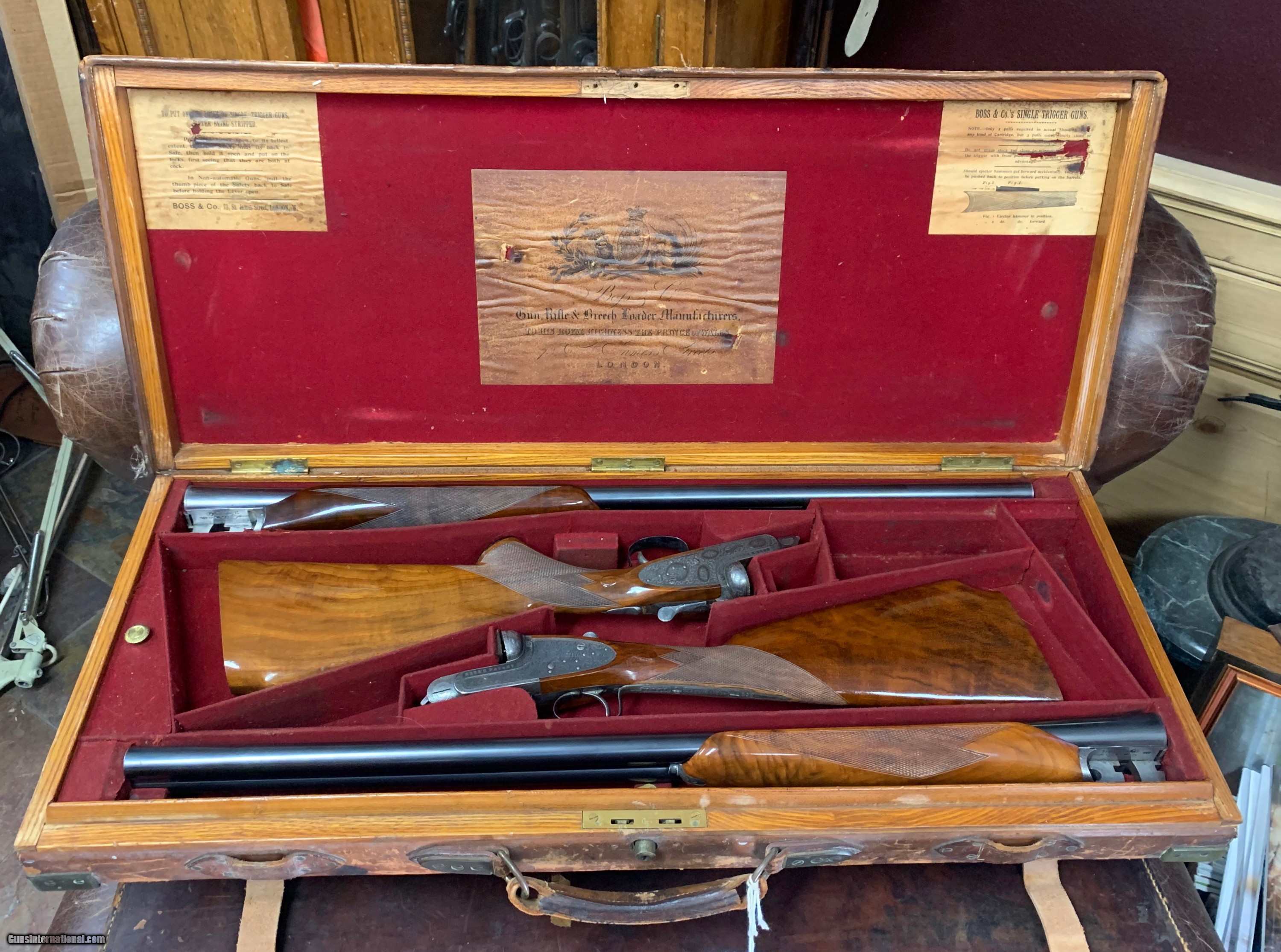 Description: Hammerless Sidelocks - We have an email from Boss stating that these guns were completed October 7 1898 and were re-barreled by Boss in 1948 and let me tell you the barrels still almost look new. I suspect these guns were restocked by Pachmayr in the 1950\'s or early 60\'s in an American style. The triggers work perfect and are very crisp. These guns are tight and ready to shoot or would be fun to restock back to English style stocking. This gun appears to be set up for Skeet or upland bird hunting. The price is for one gun as we are willing to break them up. The other gun is our number 4052. It is set up like a long range clay or trap gun. If you want both guns you will get the original oak and leather case shown in the picture. Own a true London Boss