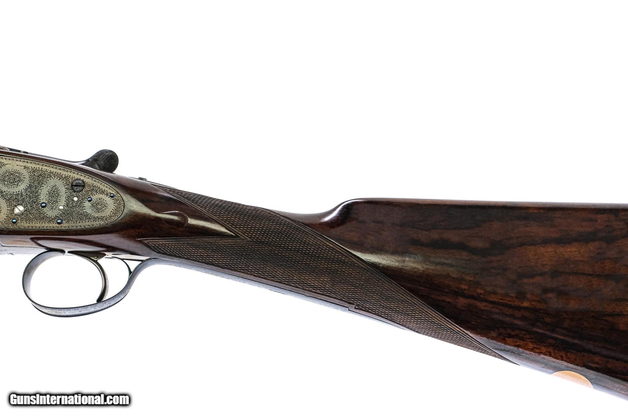 Description: Boss & Co. - SxS, 12ga. 29" Barrels Choked IC/M. Straight grip, half inch leather covered pad, splinter forened, boss single trigger, rolled edge trigger guard, superb French walnut, 2 ½ inch chamber , this gun is 100% as new, even went through re-proof, 100% English case color, barrel blue, and wood finish. It’s undetectable from a brand new gun bought today. Built in 1946, it’s the same gun they’re currently building. 1 1/8oz proof. Every screw is perfect, barrel ledges are perfect. Original 2 of a pair. It’s like buying a brand new gun. With our CSMC Warranty, superb in every way and superior to other guns offered on the market. The most magnificent rose and scroll Boss engraving available. Still has all the case color and lacquer on the gun. Looks and smells brand new! Inv: 71903 6 lbs. 4 oz. 14 7/8" x 1 ½" x 2 ½" $19,995.00 SOLD |