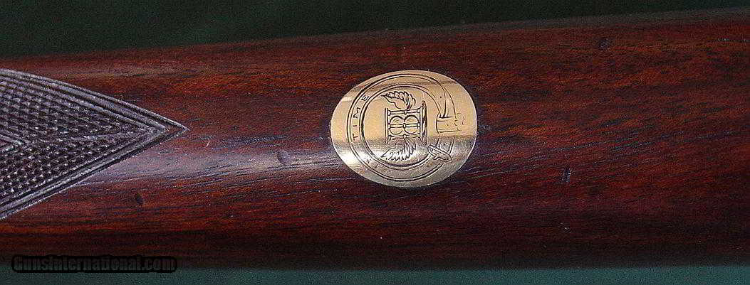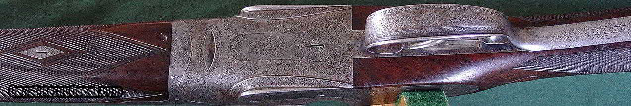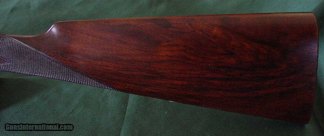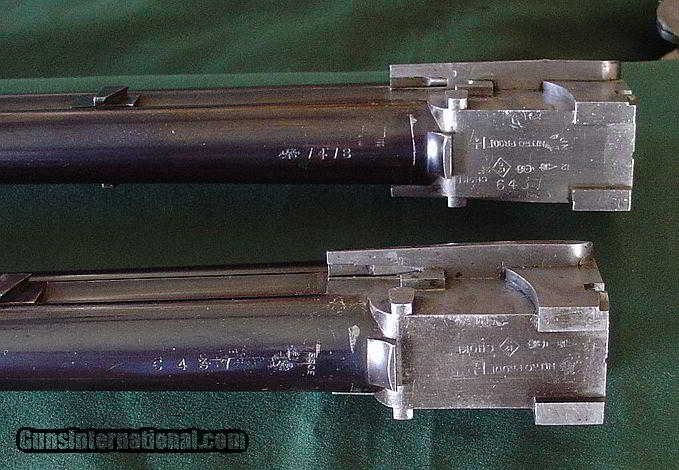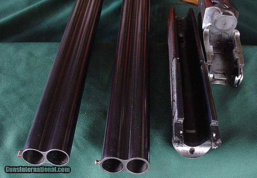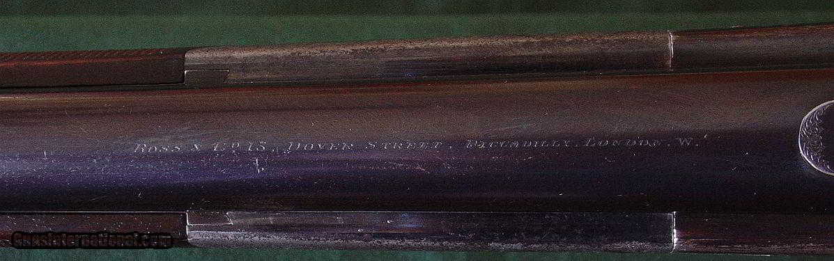 Description: Boss O/U 12 Bore 2 Barrel Set, Built in 1919 For a Canadian Client. Barrels are 27 and 29 inch. First set delivered with gun is 27" Cyl & Cyl. Second set completed in 1926 is 29" bored Full & Full was ordered for a successive American owner through Abercrombie & Fitch. Almost impossible to find a Boss gun with these long barrels, tight chokes, and heavy wall thickness. Original 27" barrels are 2 3/4" Chambers with a 3 1/4 dram 1 1/8 oz load. 29" barrels are 2 3/4" chamber 1 1/4 proof. Ejectors are in time and very strong. 27" barrels retain 95% of a London reblue. 29" barrels retain 99-100 original blue. Bores are excellent to perfect. Old replacement stock, probably done at the same time the later barrels were built for a new owner. Strong traces of case color give the that nice overall pleasing look, with another lifetime of service. MakerBoss & Co, London Gauge/Caliber12 Bore. Barrels27" & 29" - Wall Thickness: 27" bbls: 25 & 28. 29" bbls. 29 & 30. Bores: 27" - .730 & .730. 29" - 731 & 731. Chokes Chokes: 27" Cyl. & Cyl. (.001 & .002). 29" bbls. .032 & .037 (Full & Full). EngravingLondon Scroll ActionBoss O/U StockFrench Walnut ButtCheckered L.O.P.14 5/8" WeightWith 27" bbls: 6 lbs. 6.4oz. With 29's: 6 lbs. 10.8 oz. Stock Dimensions1 3/8 x 2 1/4 x 14 5/8 x 1/4 cast off SOLD Curio/Relic: Yes |