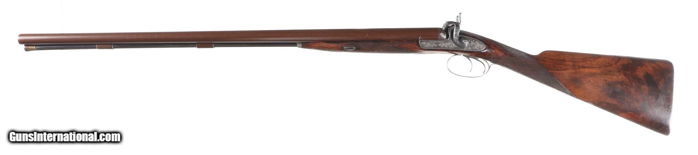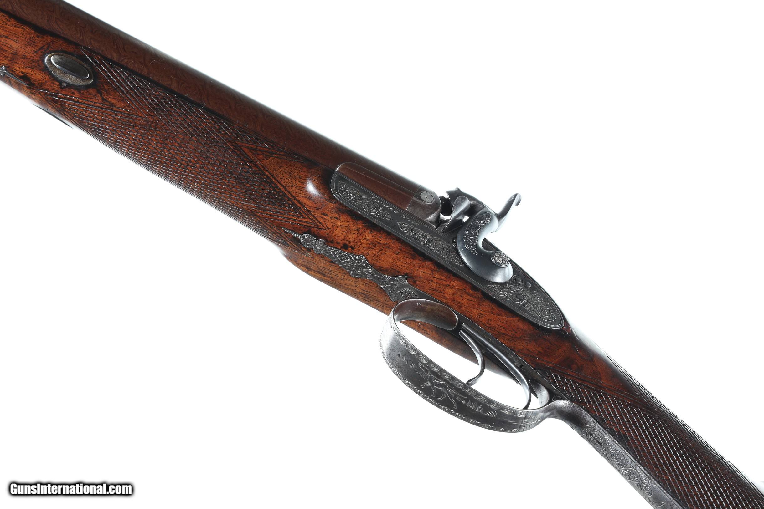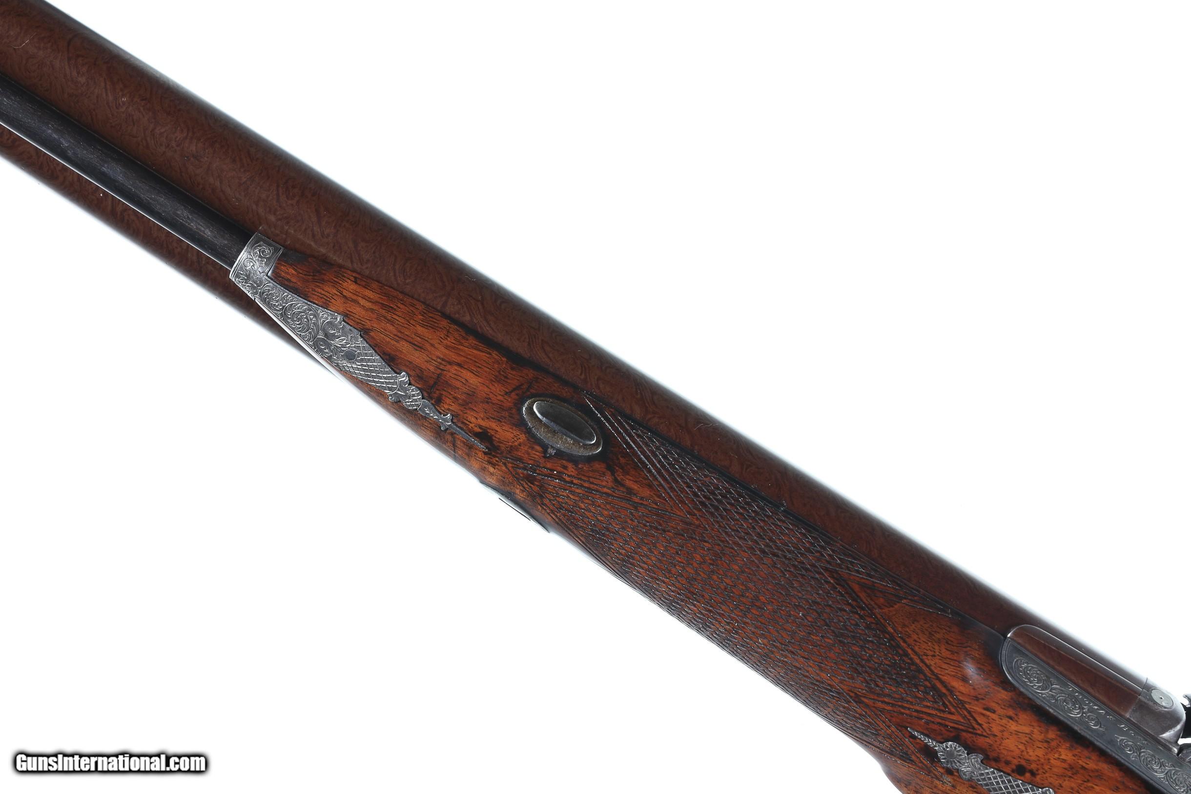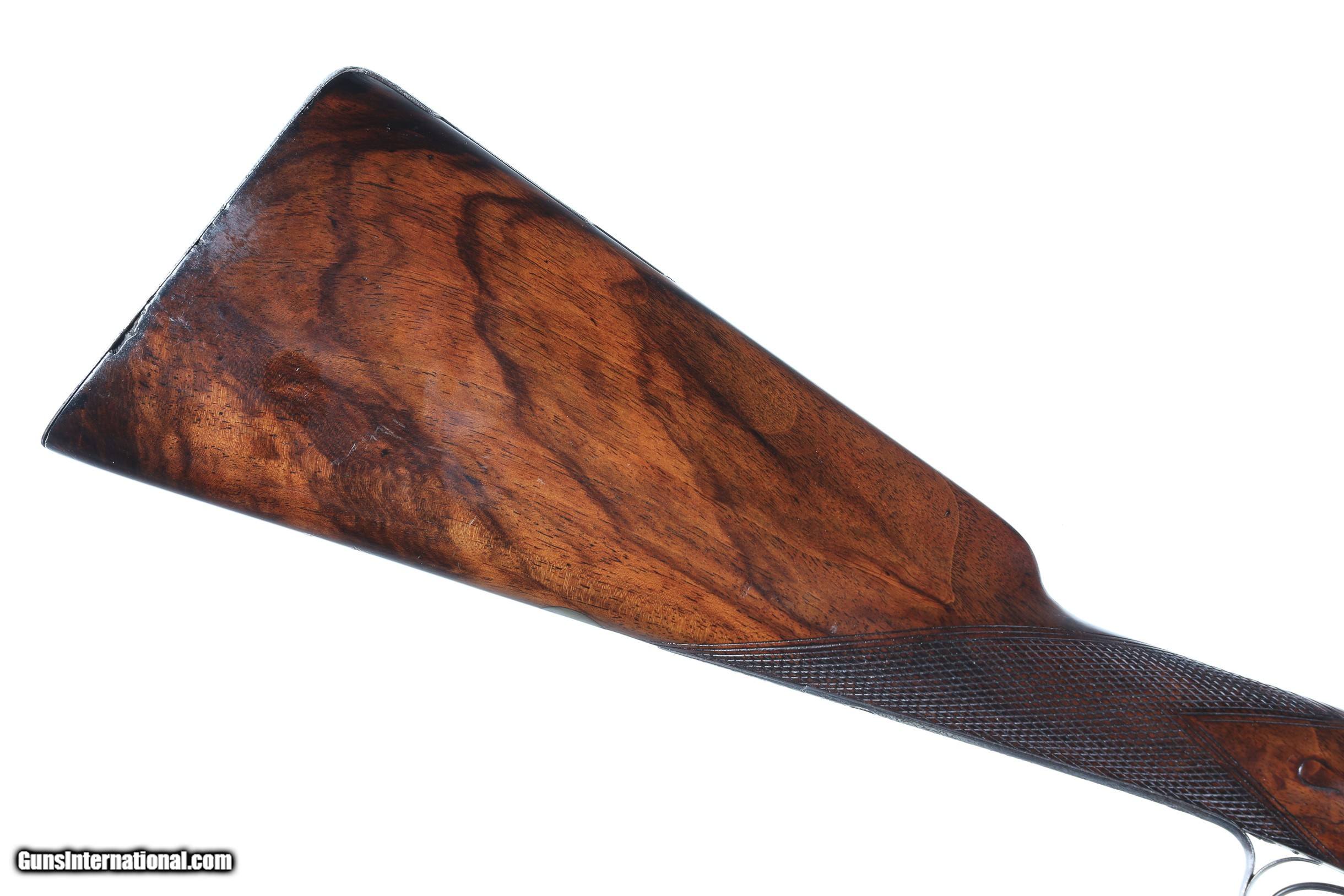 Description: Thomas Boss 12 bore percussion double with 30" vivid damascus Bbl with platinum blow out plugs. Scroll engraved percussion locks with fine marbled oil finished checkered walnut stock. Ebony loading rod. Furnished with Oak partitioned case with loading accessories, shot bag, powder flask and over wads, Condition. Very fine with vivid damascus pattern. Stock is full sized and very fine. Mechanically excellent. Bores are frosted. Case is very good with slightly soiled lining and good lid label. Antique • Free Shipping, No Credit Card Fees. • Lay-a-way available for this firearm. • 1/3 Down, a 1/3 in 30 Days, 1/3 in 60 Days. SOLD Manufacturer: Boss Model: Sporting Serial Number: 1053 Barrel Length: 30 |