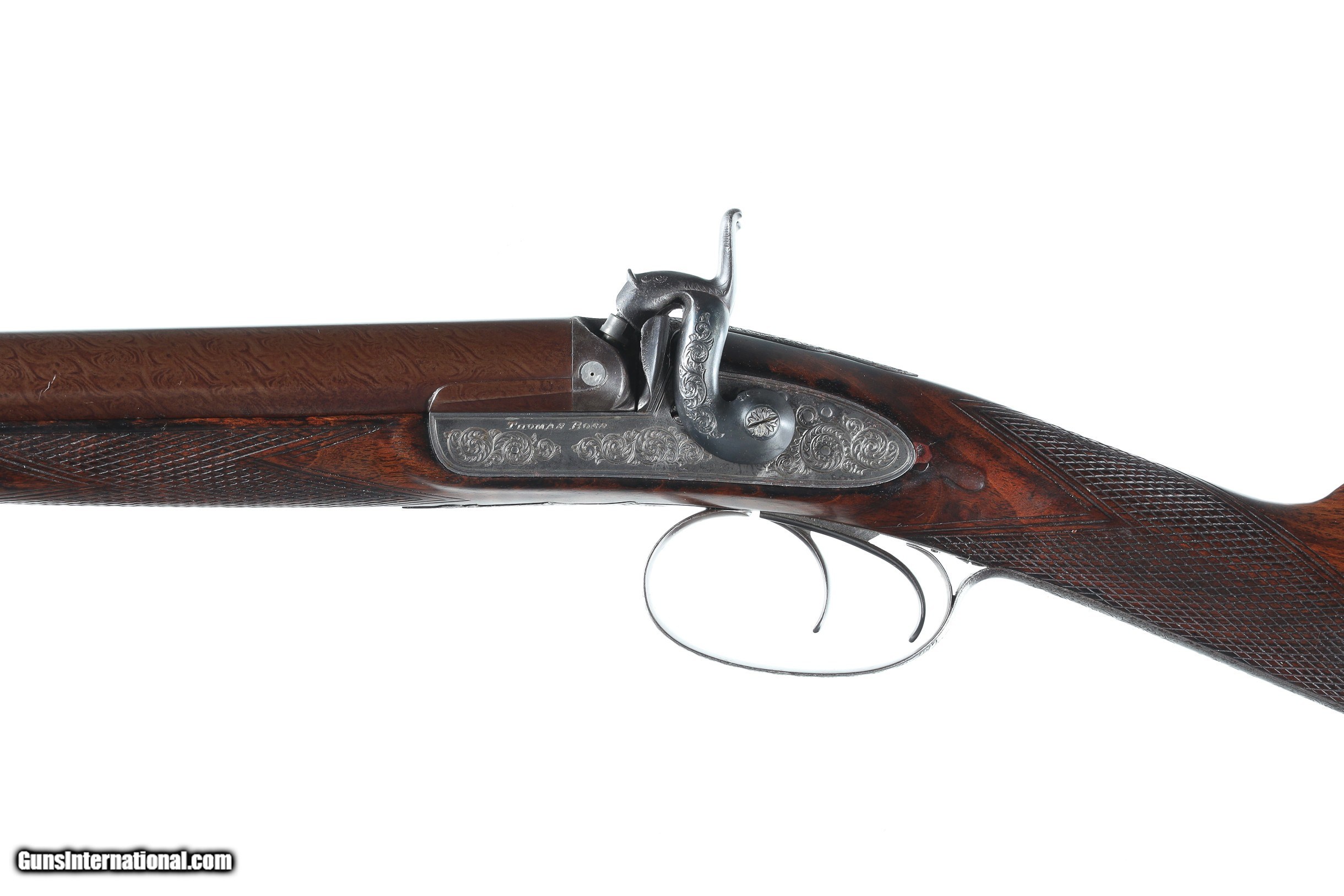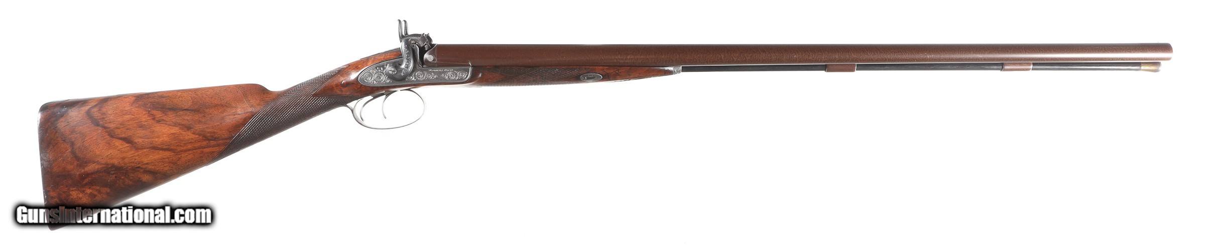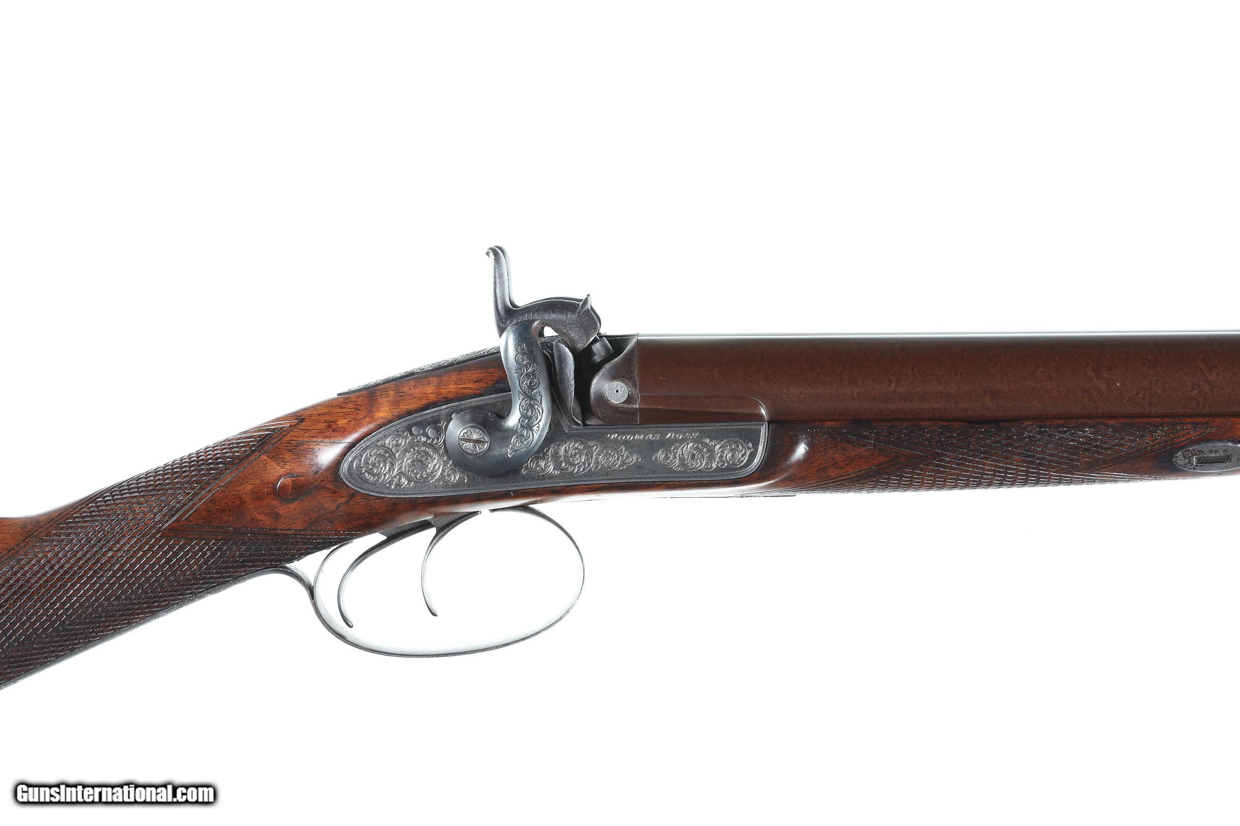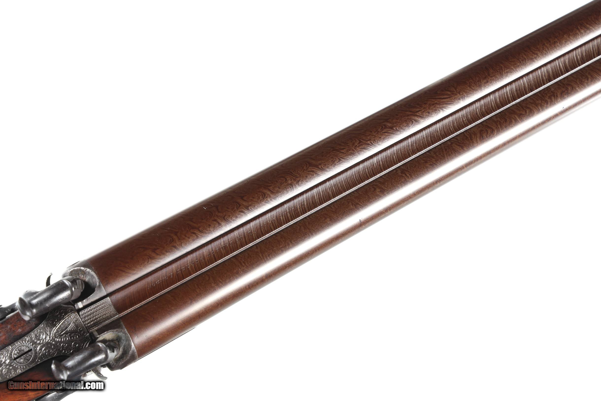 Description: Thomas Boss 12 bore percussion double with 30" vivid damascus Bbl with platinum blow out plugs. Scroll engraved percussion locks with fine marbled oil finished checkered walnut stock. Ebony loading rod. Furnished with Oak partitioned case with loading accessories, shot bag, powder flask and over wads, Condition. Very fine with vivid damascus pattern. Stock is full sized and very fine. Mechanically excellent. Bores are frosted. Case is very good with slightly soiled lining and good lid label. Antique • Free Shipping, No Credit Card Fees. • Lay-a-way available for this firearm. • 1/3 Down, a 1/3 in 30 Days, 1/3 in 60 Days. SOLD Manufacturer: Boss Model: Sporting Serial Number: 1053 Barrel Length: 30 |