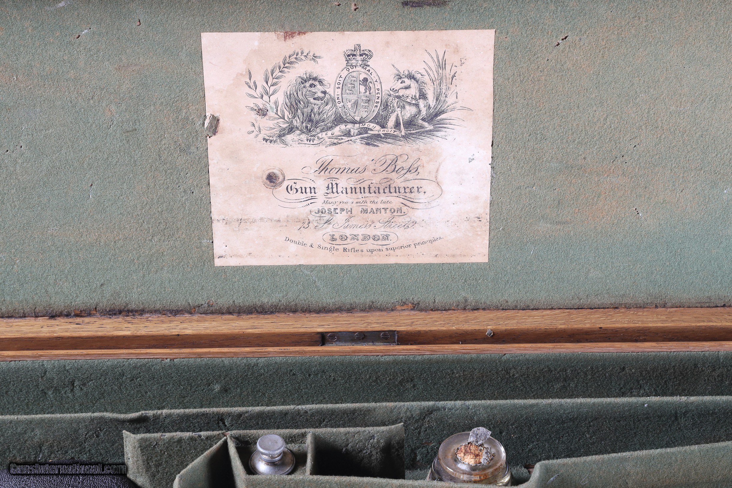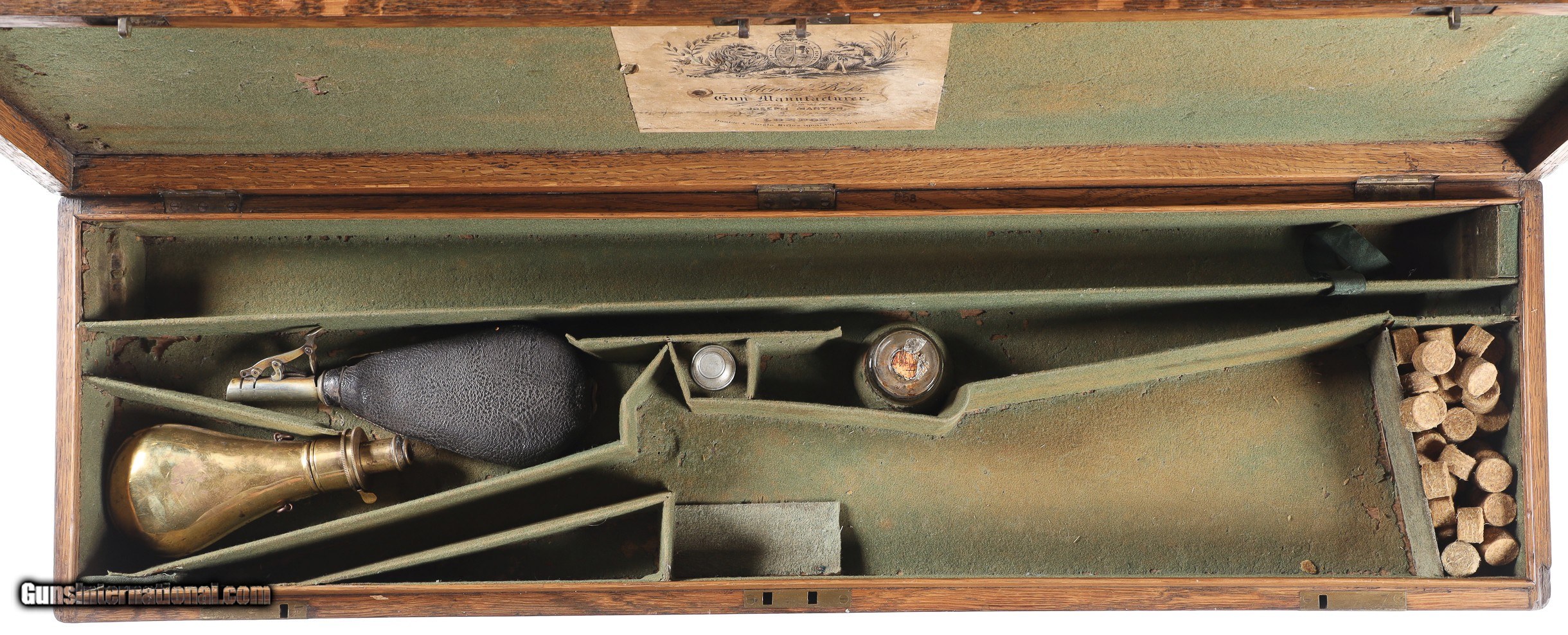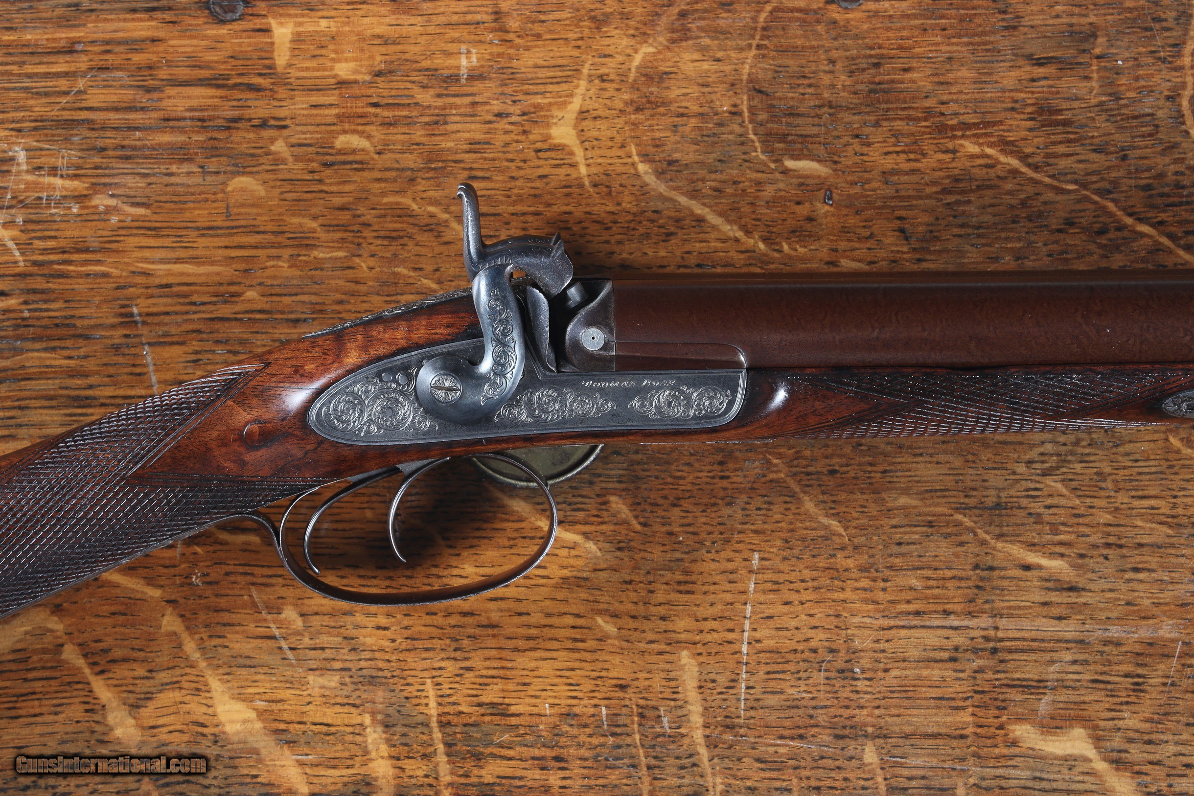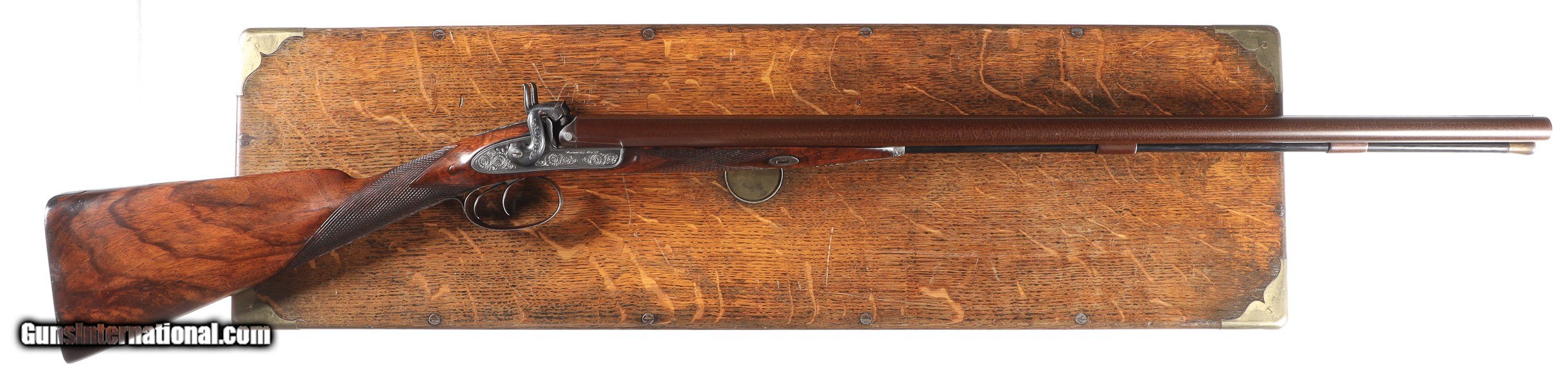 Description: Thomas Boss 12 bore percussion double with 30" vivid damascus Bbl with platinum blow out plugs. Scroll engraved percussion locks with fine marbled oil finished checkered walnut stock. Ebony loading rod. Furnished with Oak partitioned case with loading accessories, shot bag, powder flask and over wads, Condition. Very fine with vivid damascus pattern. Stock is full sized and very fine. Mechanically excellent. Bores are frosted. Case is very good with slightly soiled lining and good lid label. Antique • Free Shipping, No Credit Card Fees. • Lay-a-way available for this firearm. • 1/3 Down, a 1/3 in 30 Days, 1/3 in 60 Days. SOLD Manufacturer: Boss Model: Sporting Serial Number: 1053 Barrel Length: 30 |