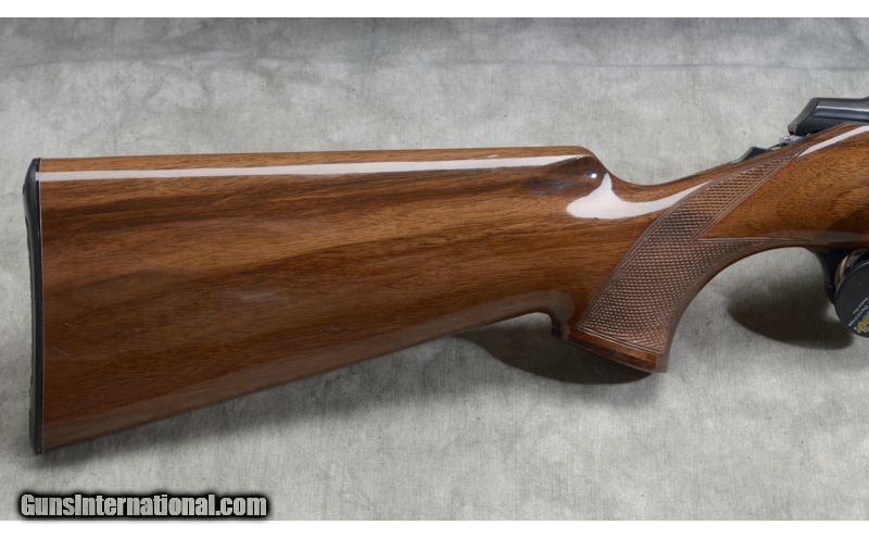 Description: This full size bolt action .22 rifle features walnut stock with good grain, Rosewood grip and tip caps, sharp checkering and is drilled, tapped and grooved for scope. SOLD Manufacturer: 1988 based upon the Date/Product Code PP136. Caliber Info: .22 long rifle. Chambers: 5 round detachable magazine. Metal Condition: Excellent. Little evidence of use. Wood Condition: Very good. One long finish scratch on the left side and a number of small scratches. Bore Condition: Shiny and bright. Barrels: 22 Inch - blue, with open sights. Triggers: Grooved factory gold trigger. Stock: Checkered better grade walnut with pistol grip and Rosewood grip and tip caps. Stock Dimensions: 13 - 1/2 Inch LOP. Butt Pad: Black polymer plate. Weight: 5 lb. - 12 oz. Sights: Bead and folding leaf open sights. Drilled, tapped and grooved for scope. Extras: One magazine. Item Location: Farmington, UT |