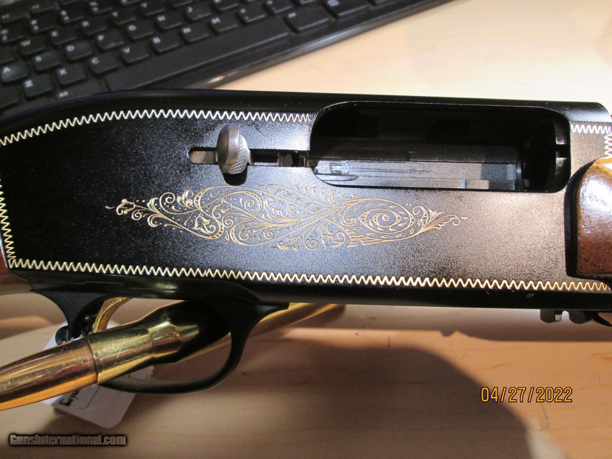 Description: Guns Listing ID: 490380 This firearm features a unique loading port on the left side of the receiver.[5] As the first round is loaded, the shell is lifted by a mechanism and chambered by the bolt; once the bolt is closed, the lifting mechanism returns to the resting position below the loading port, where the next round can then be loaded. Upon firing the chambered round, the shell in the loading port is automatically chambered. The total capacity is 2 with 1 chambered round and 1 in the loading port. SOLD Manufacturer: BROWNING Model: DOUBLE AUTOMATIC Condition: Used - Non-Certified Barrels: 26 BARREL Gauge Info: 12 GA Finish: WALNUT / BRONZE METAL |