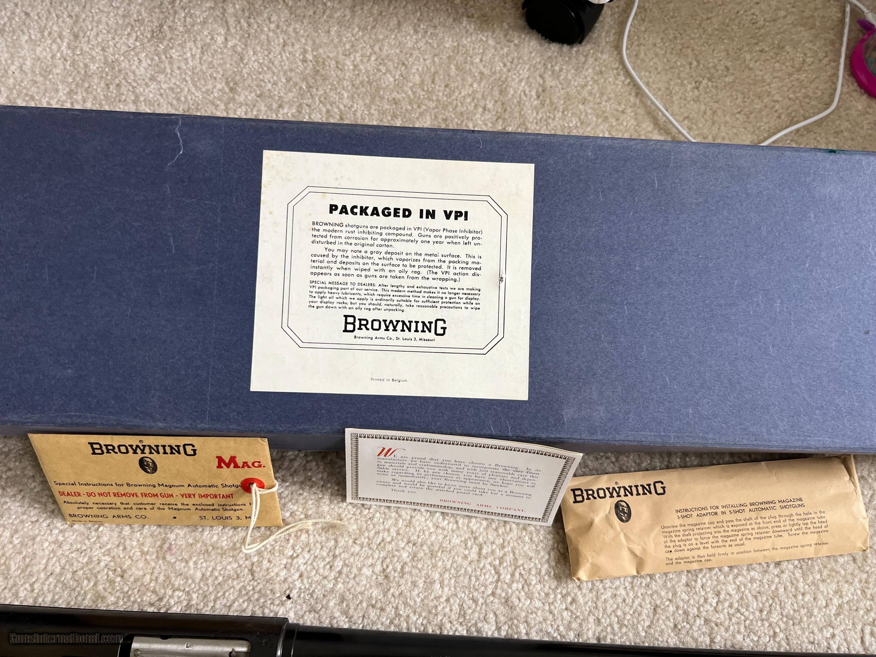Description: 1959 Belgium Browning Auto 5 A5 Magnum 12 New in the Blue Box. This is the only blue boxed magnum I have ever seen. This gun is new and unfired without a mark on it. Includes all paperwork. 32" plain barrel. SOLD Shotgun Gauge: 12 Gauge |