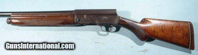 Description: BELGIAN BROWNING MODEL A-5 OR A5 12GA. MAGNUM SEMI-AUTO 32" GRADE 1 SHOTGUN, CIRCA 1965. Serial number with prefix "5V-67XXX". 31 1/2" plain barrel choked full with one line Browning address and "made in Belgium" along with belgian Liege proofs. Original barrel to receiver. Receiver with almost all of it's original finish just beginning to fade to plum with no losses. All screws excellent. Grade 1 Scroll vines and zig-zag engraving. A few small areas of salt and pepper but nothing sticks out. Typical tiger stripe beautiful grain wood of the period. Some flaring of wings on either side of tangs from weather but SOLID even with a few small chips missing(just needs a bit of TLC). Length of pull 14 1/4" over Browning vent rubber pad(still pliable). Checkering getting a bit thin in places but never recut. Original varnish. Forend and it's checkering match buttstock with a few hairlines extending from receiver but solid. Perfect working order with mirror bright bore with NO scoring. Classic with some waterfowl character and still ready to be shot. SOLD Curio/Relic: Yes |