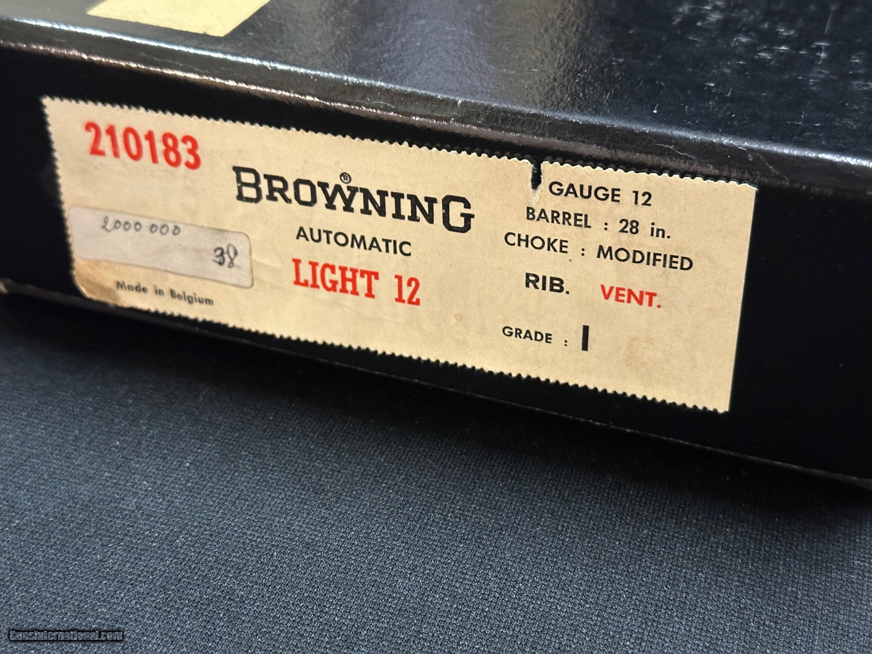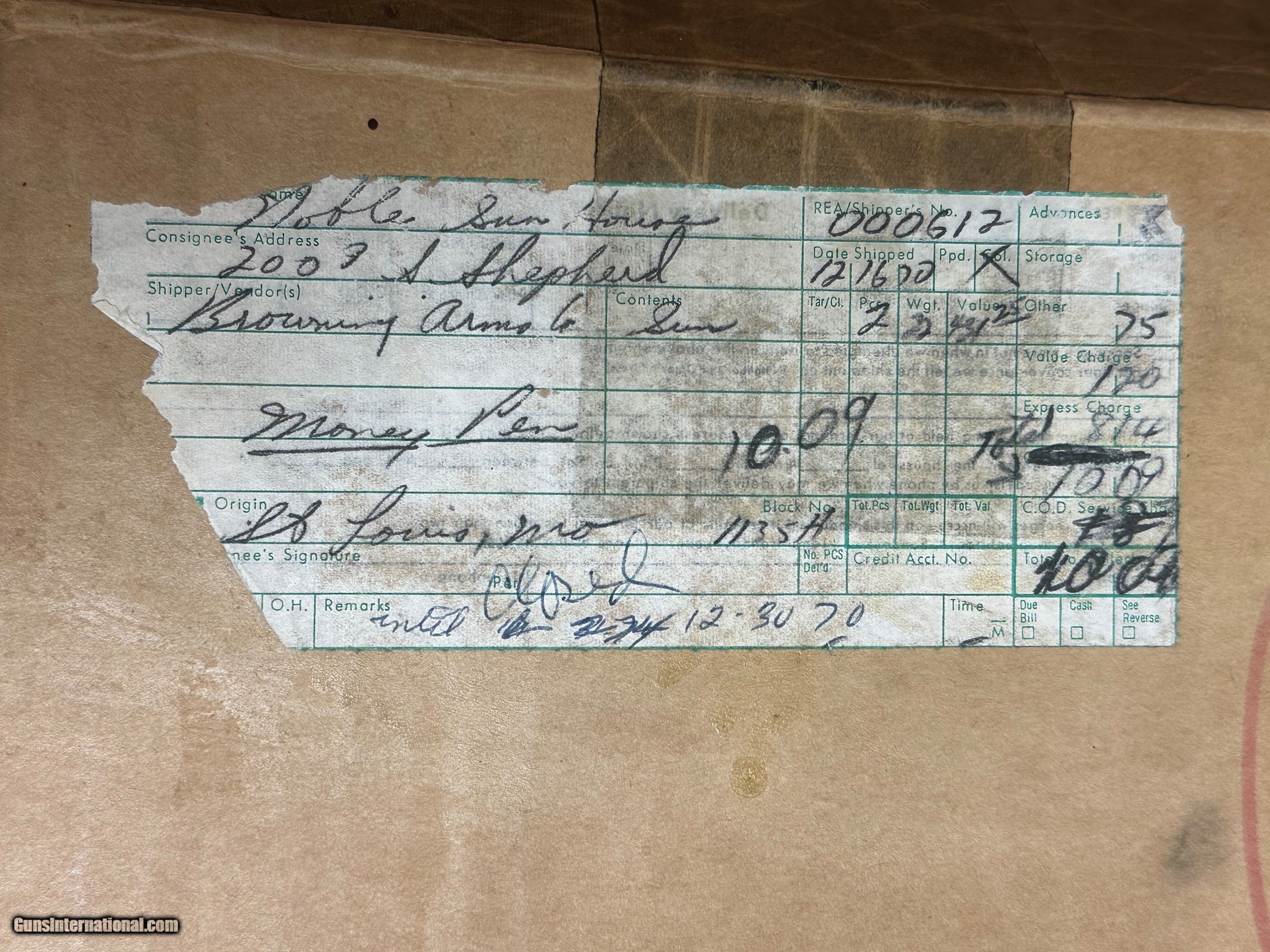 Description: ATTENTION BROWNING COLLECTORS !!!! Belgium Browning A5 2 Millionth Commemorative 12 gauge. 28" vent rib barrel modified choke. Includes original shipping box for gun. Gun box included and 2 millionth case. Original shipping box for case as well is included. Was shipped December of 1970 as shown on original shipping box label. Mint condition. Number #38 of 2500 made. The photo with the little blimish is under the gloss finish and appears to be a part of the wood. This is a one of a kind true collection piece. For more information about this firearm or for purchasing it we kindly ask that you ((( PLEASE GIVE US A CALL AT ))) 1-(479)-747-9598. We have a store front and emails may be delayed so we kindly ask that you just give us a call over the phone. PRICE - $6,000 + Shipping SOLD Shotgun Gauge: 12 Gauge Manufacturer: Browning Model: A5 2 Millionth Commemorative Serial Number: 38 Barrel Length: 28” Chambers: 2-3/4 Action: Semi-auto Manufacture Date: 1970 Chokes: Modified Item Location: Arkansas |